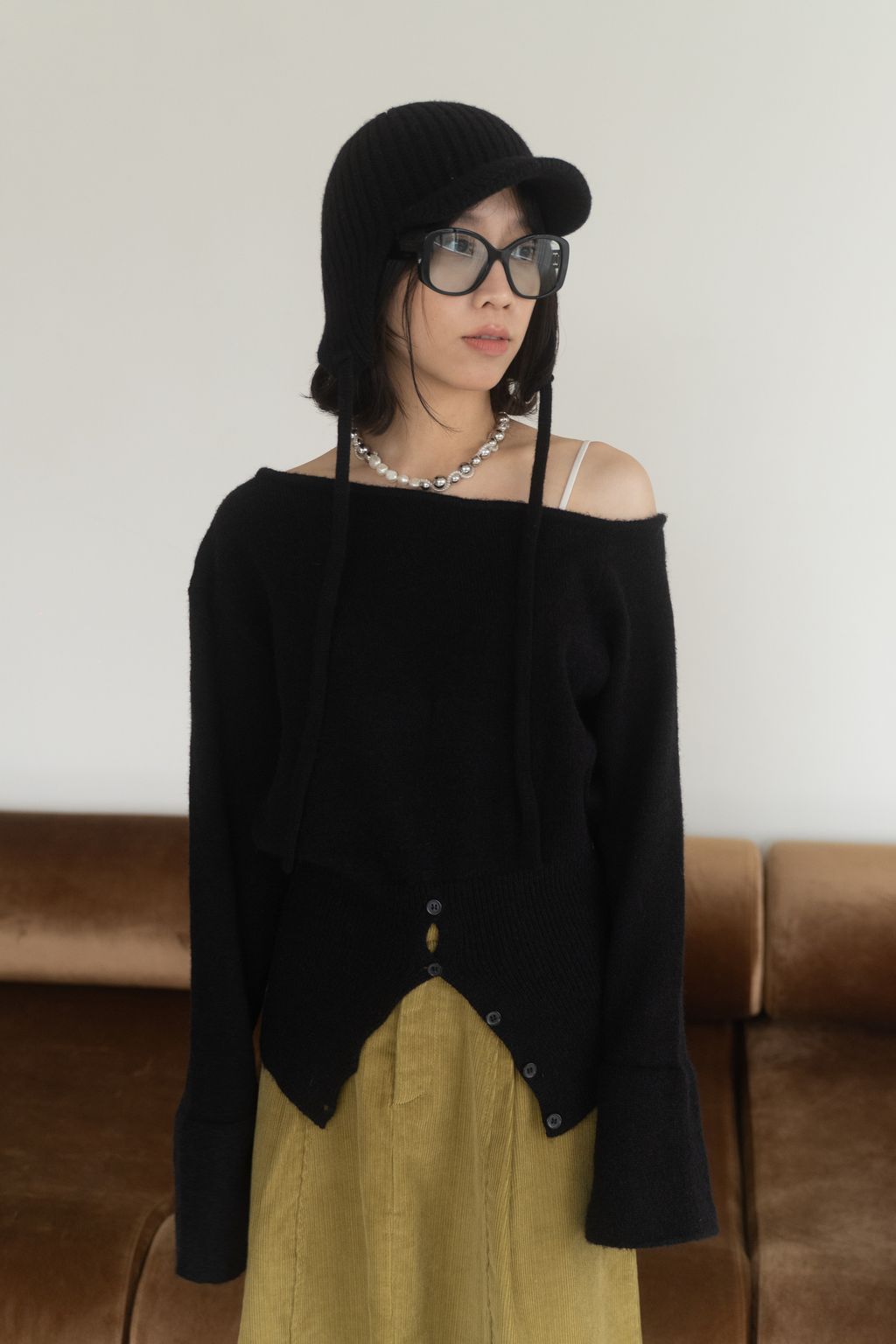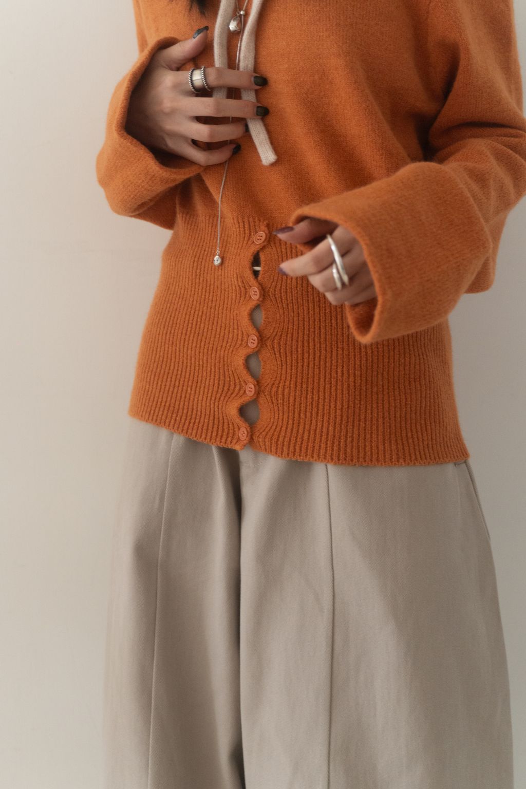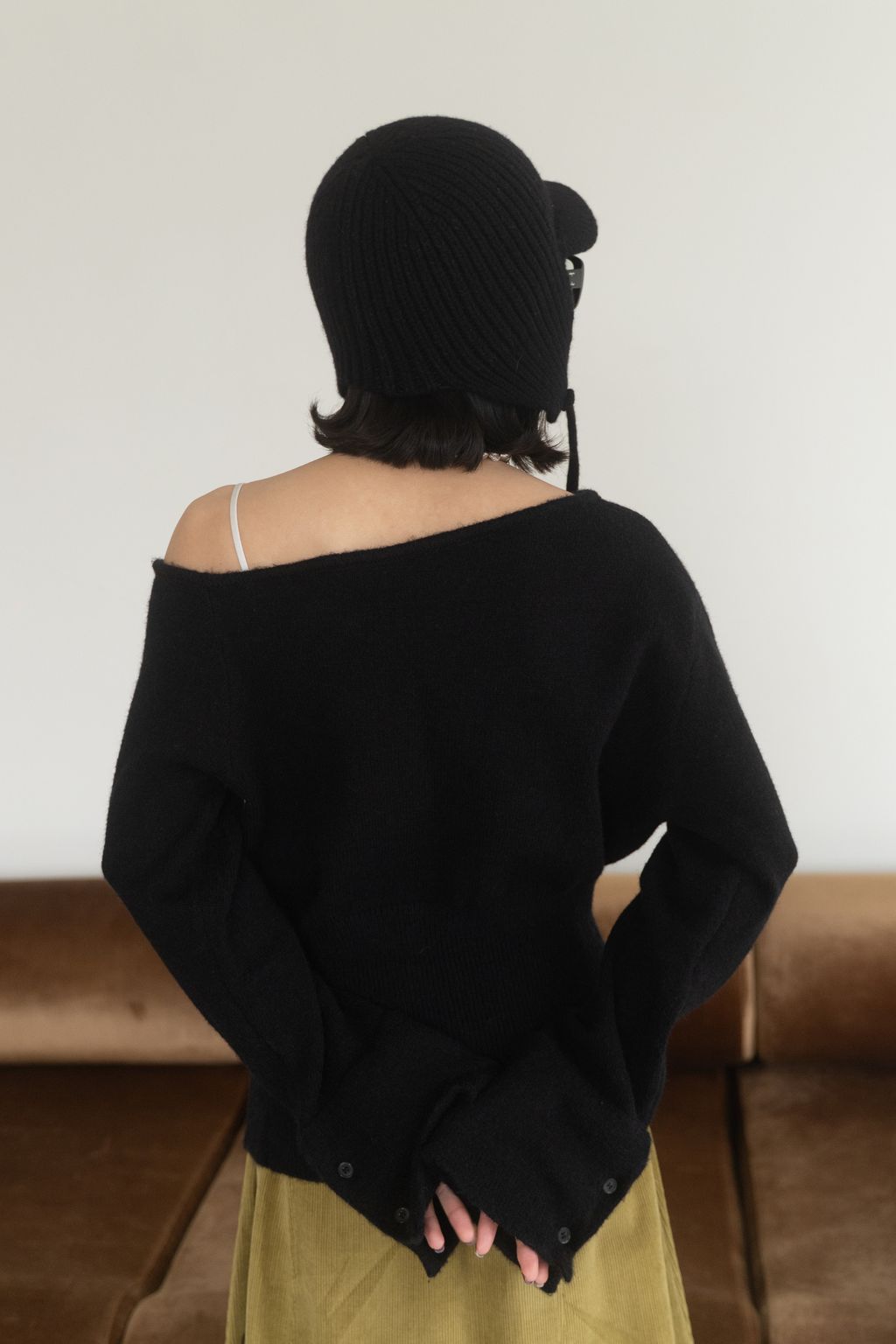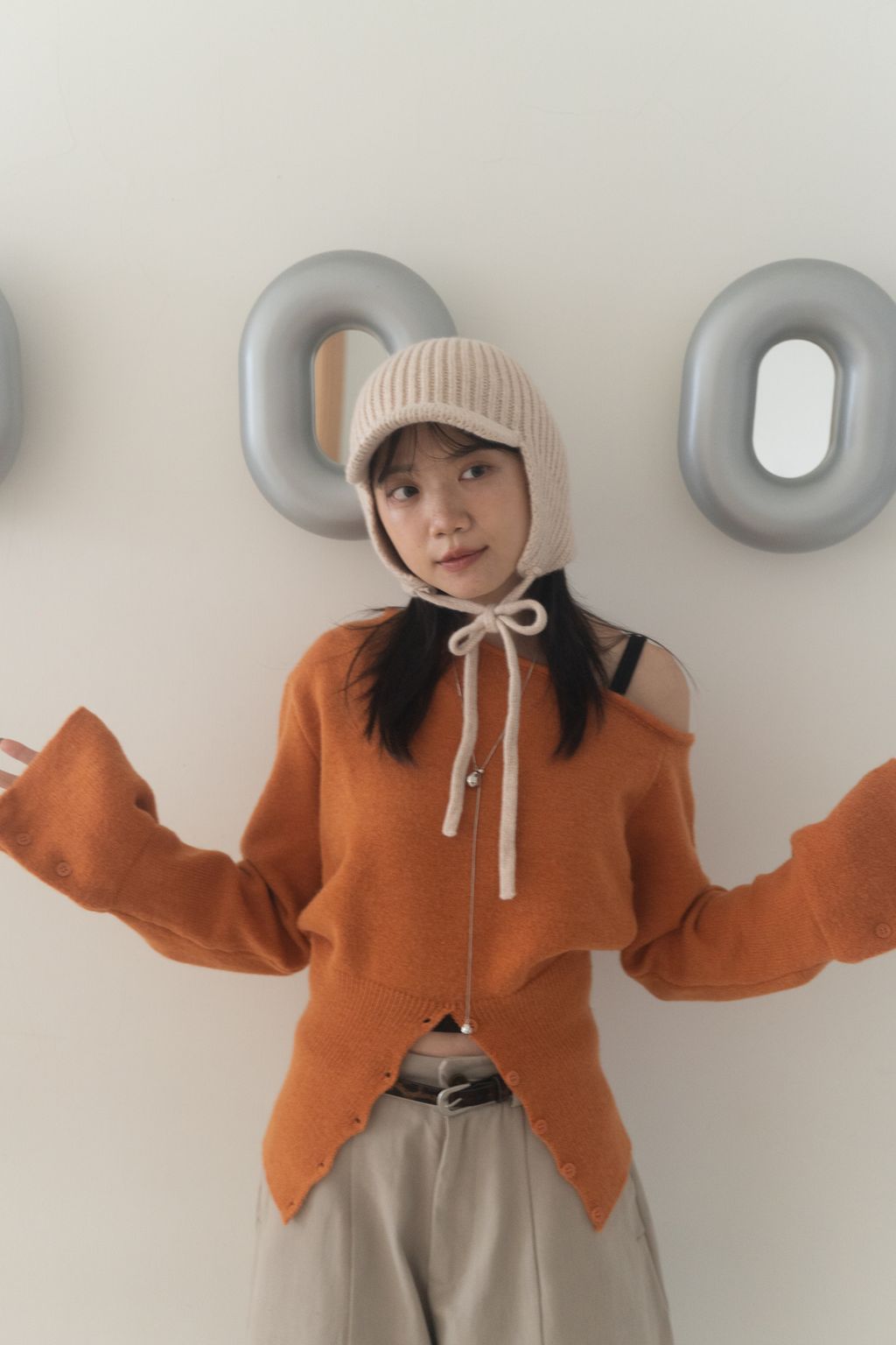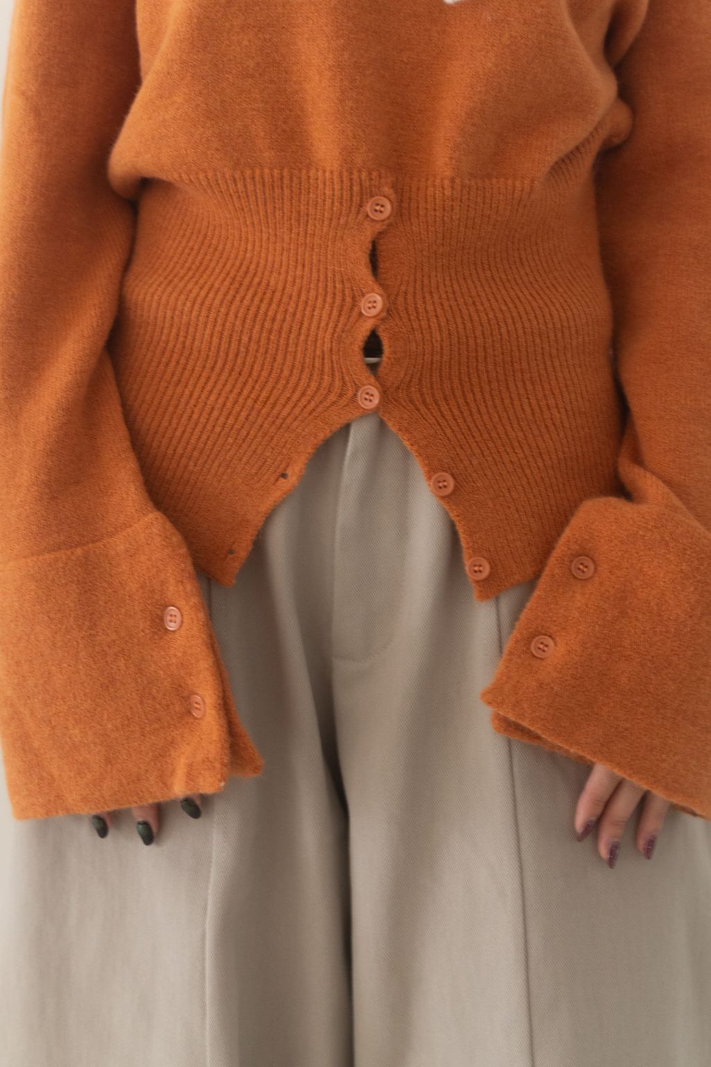 斜領收腰排釦寬袖毛衣 黑/橘