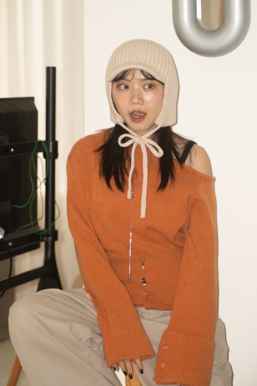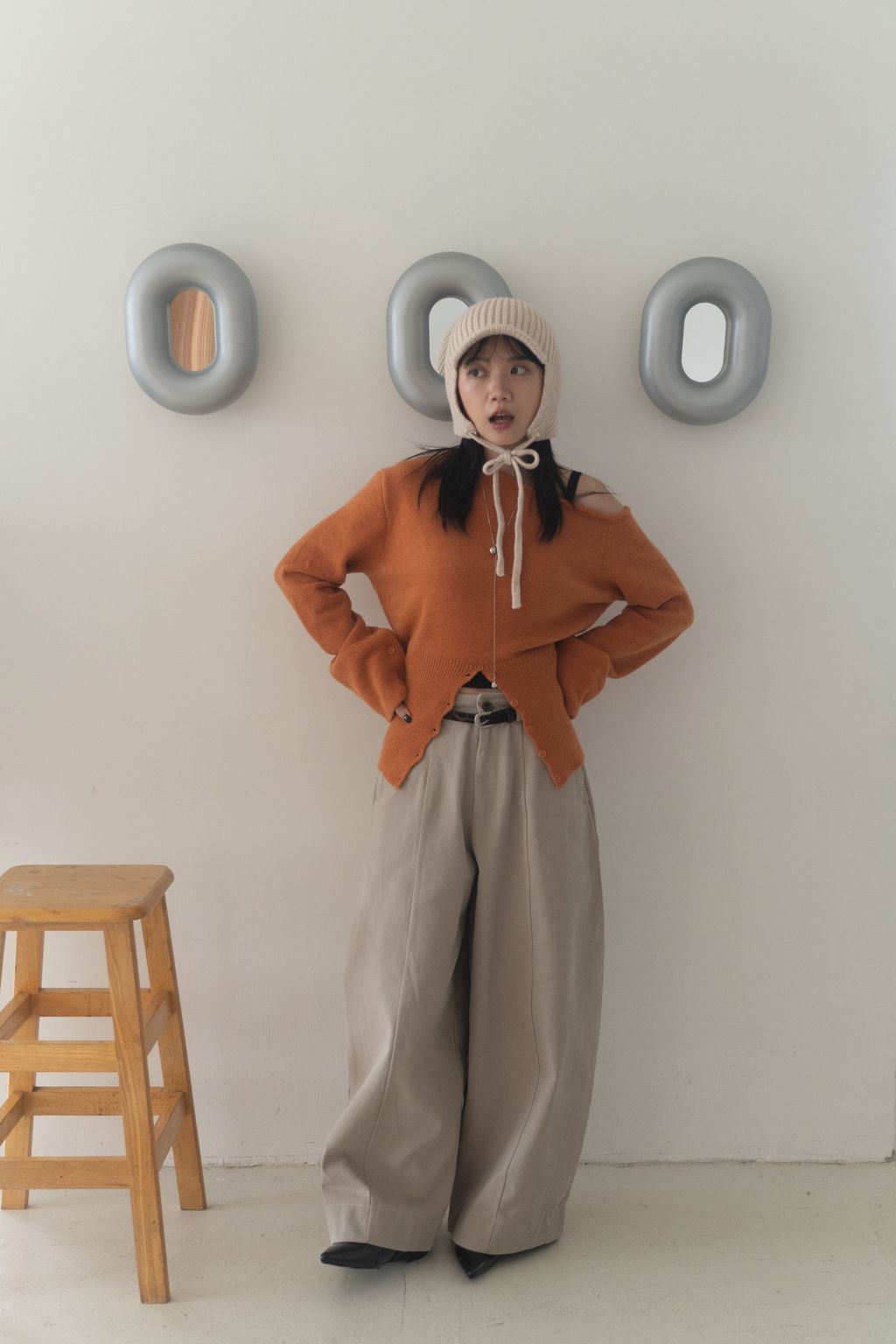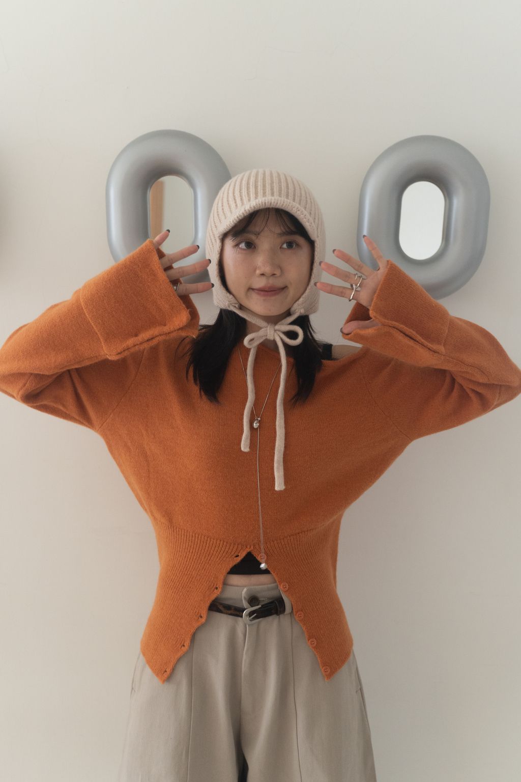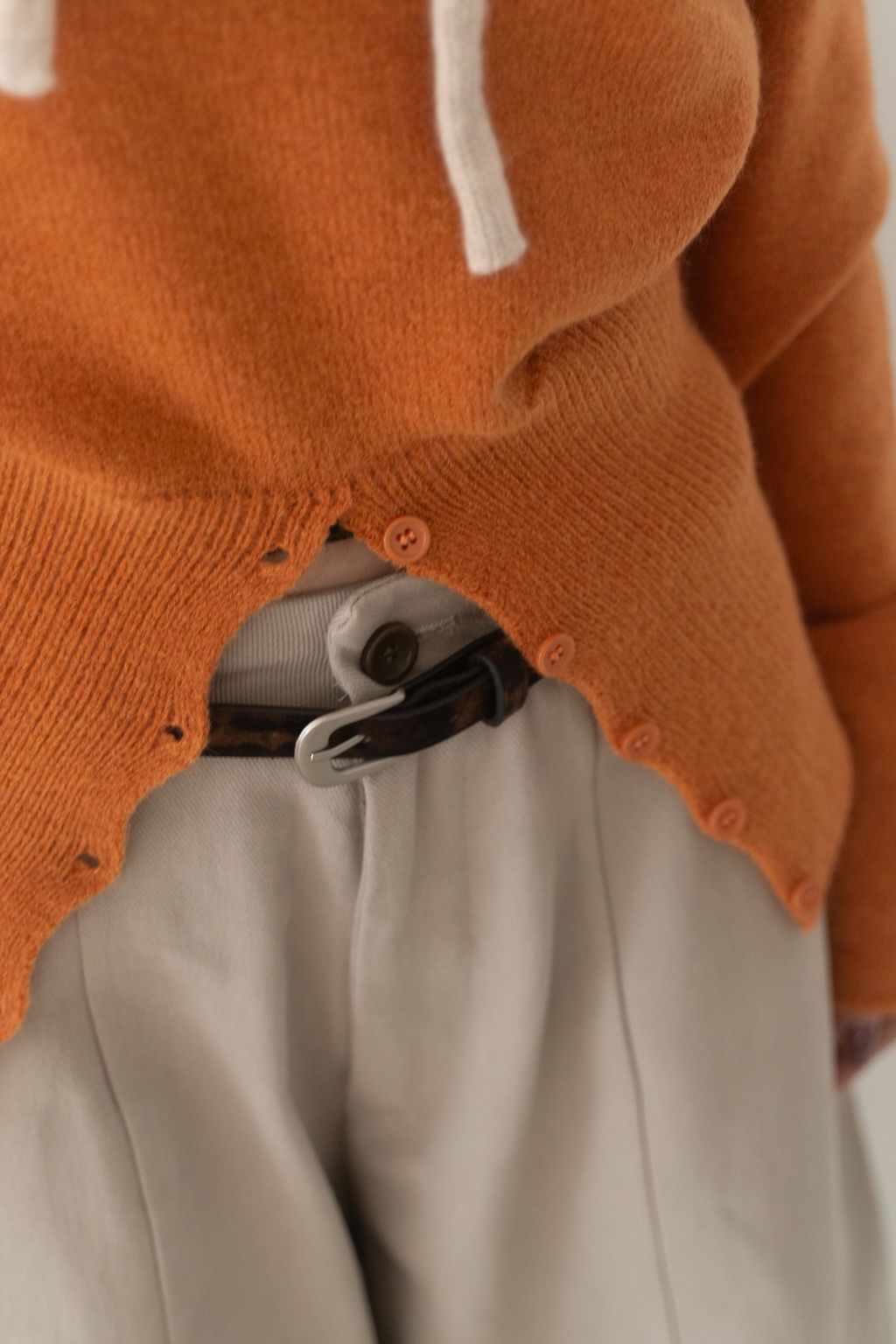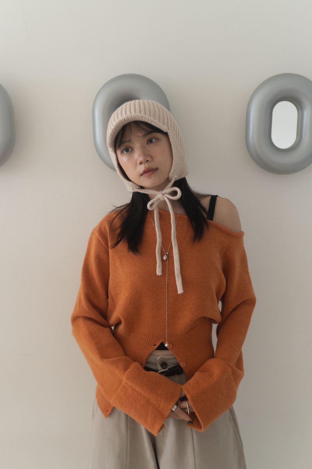 斜領收腰排釦寬袖毛衣 黑/橘