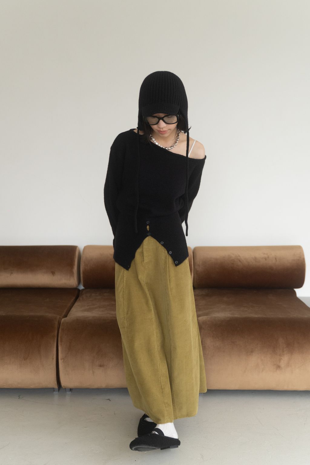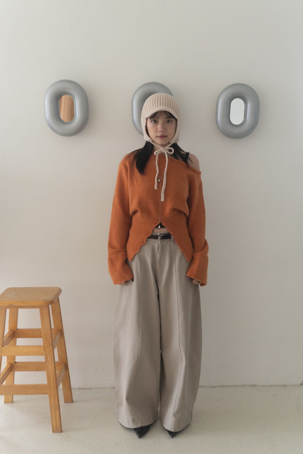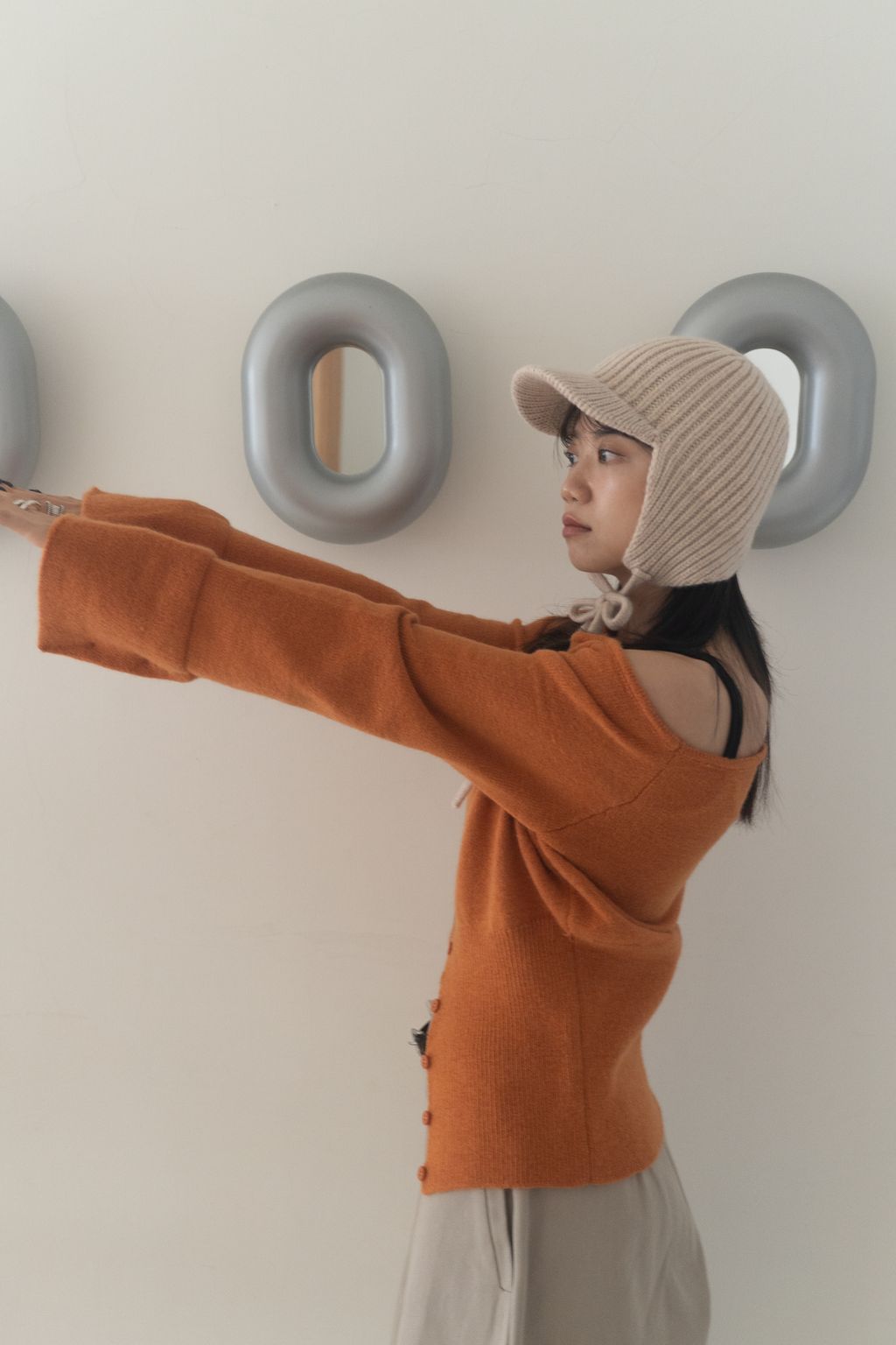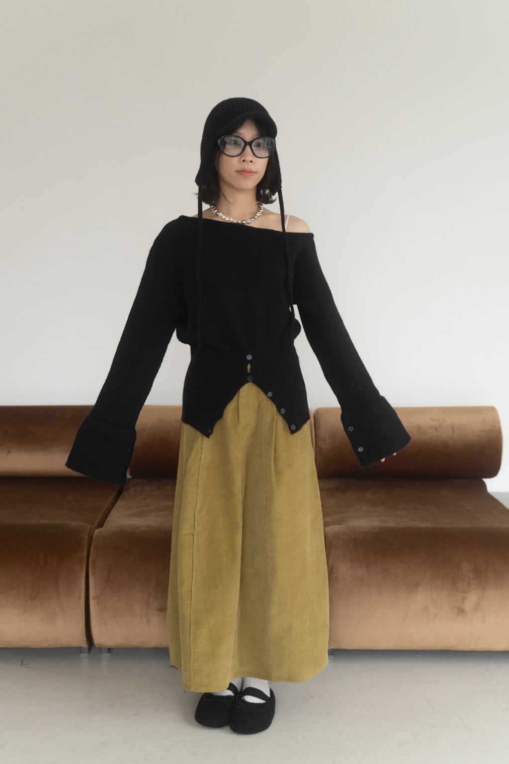 斜領收腰排釦寬袖毛衣 黑/橘