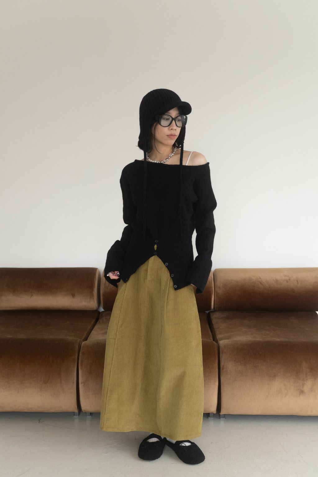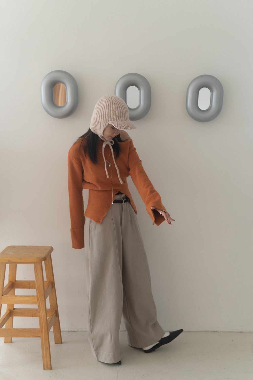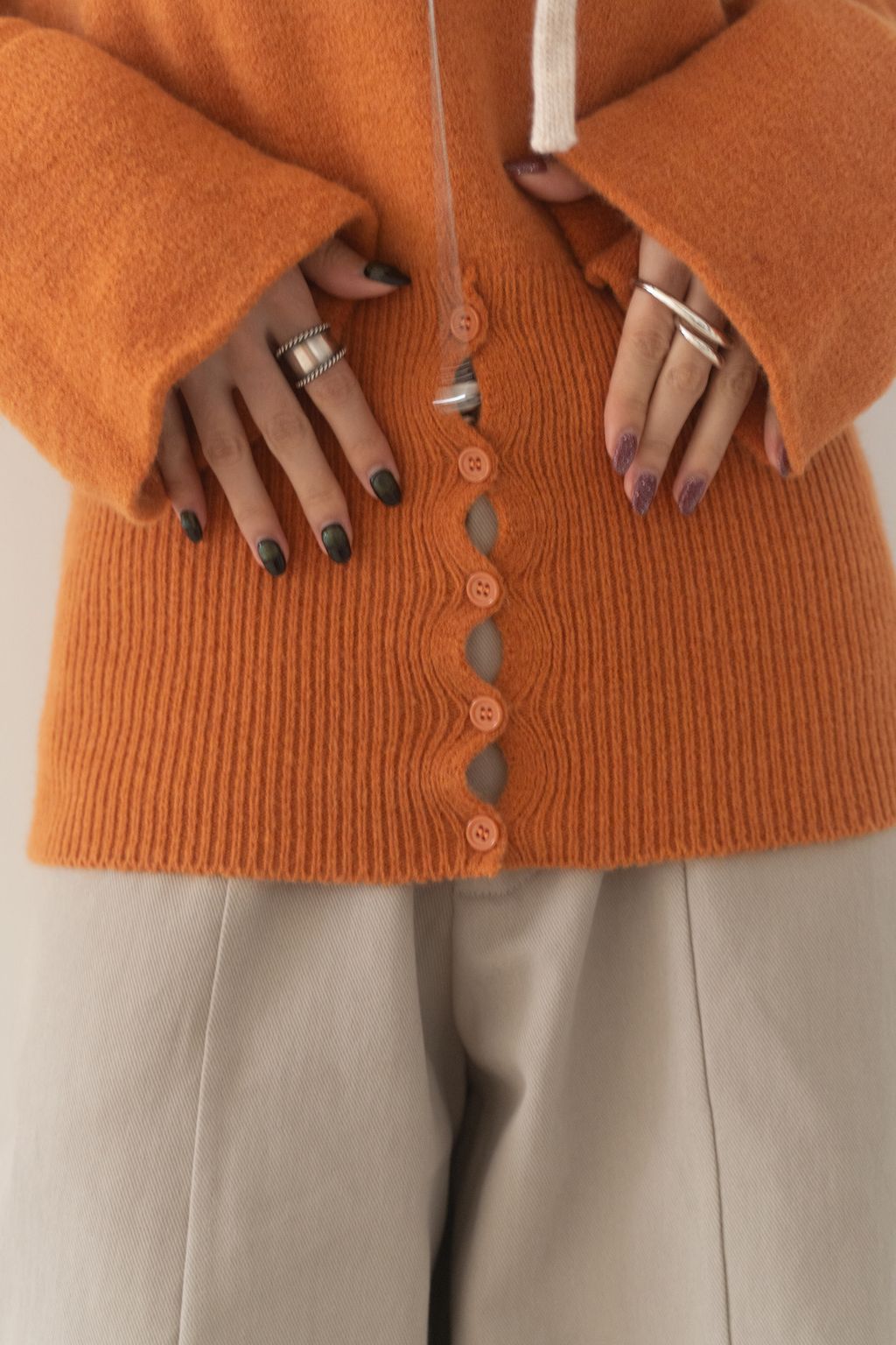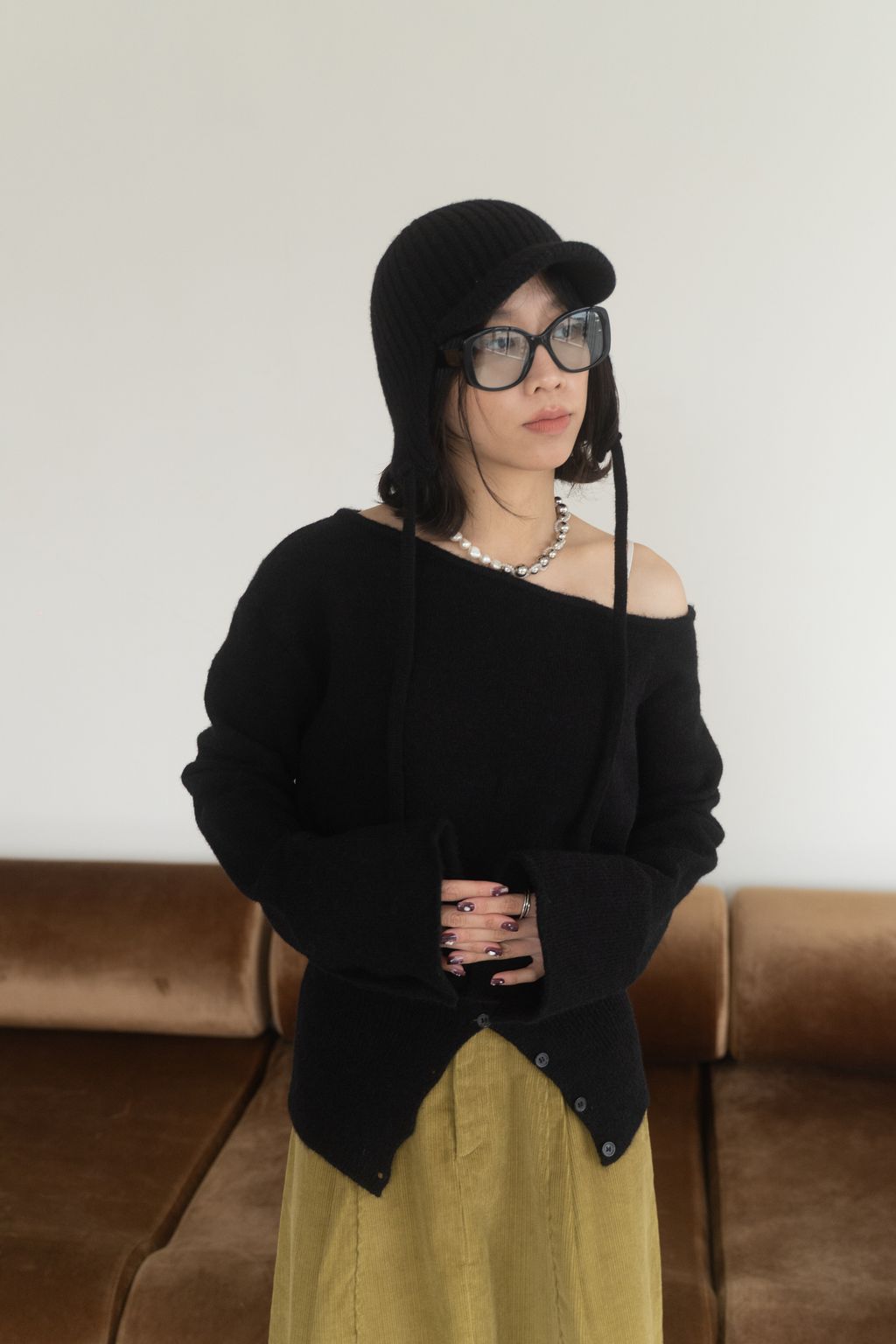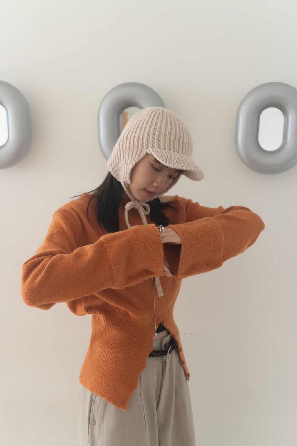 斜領收腰排釦寬袖毛衣 黑/橘