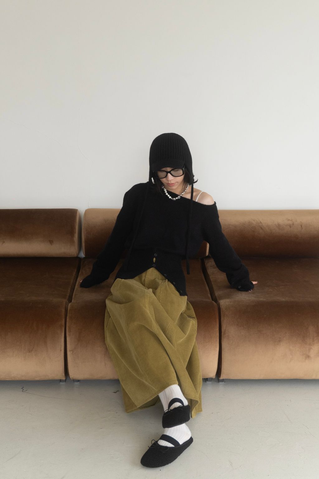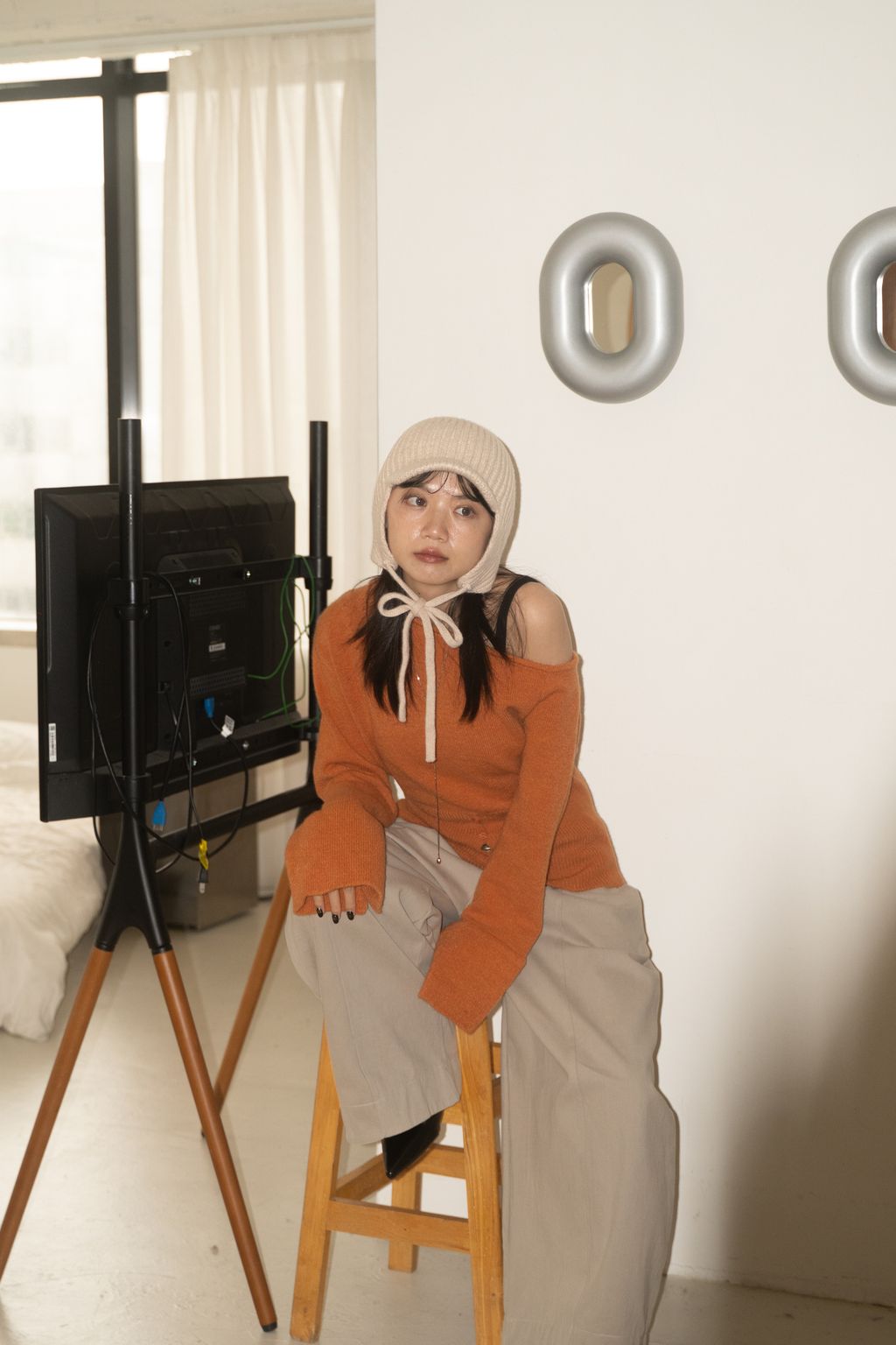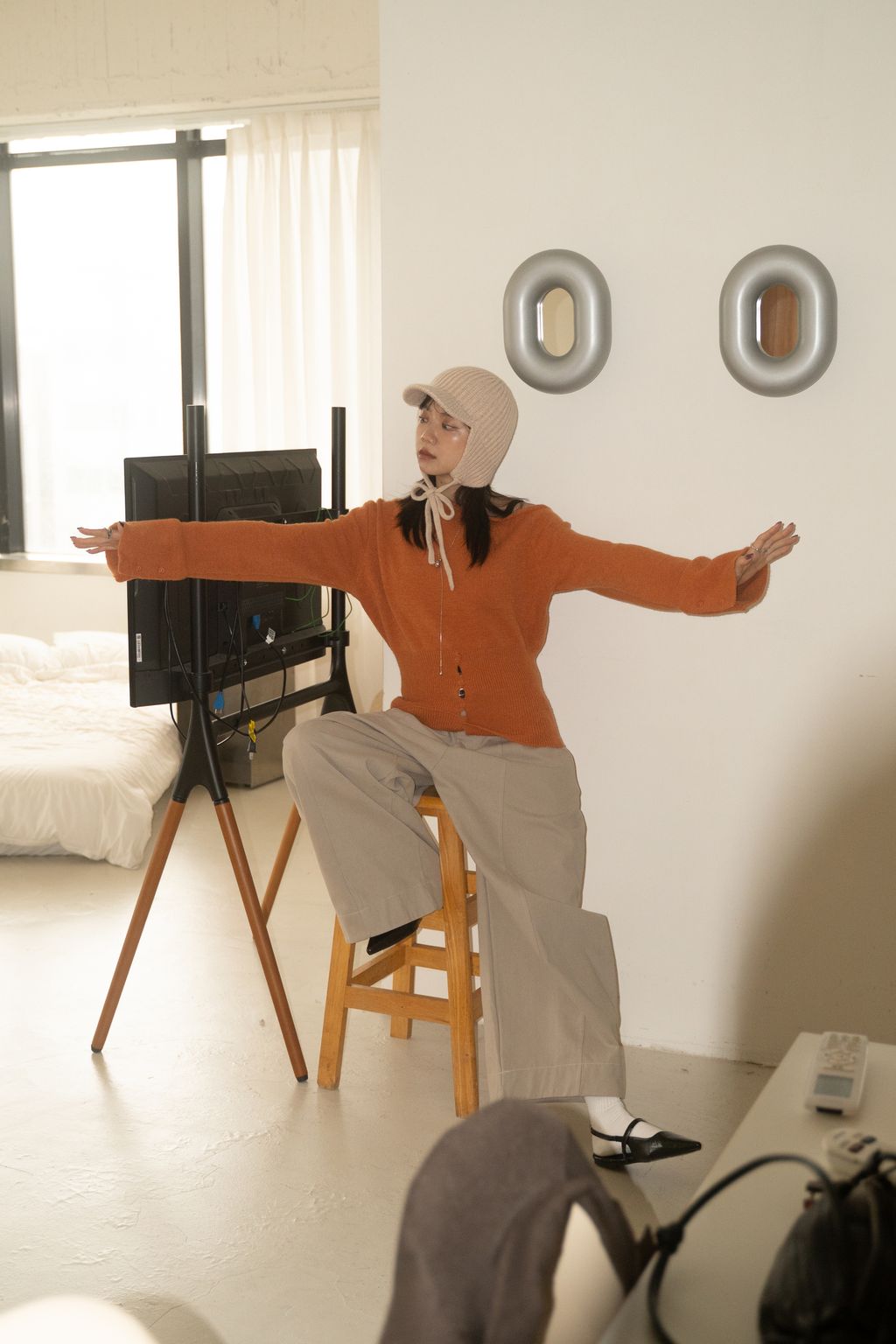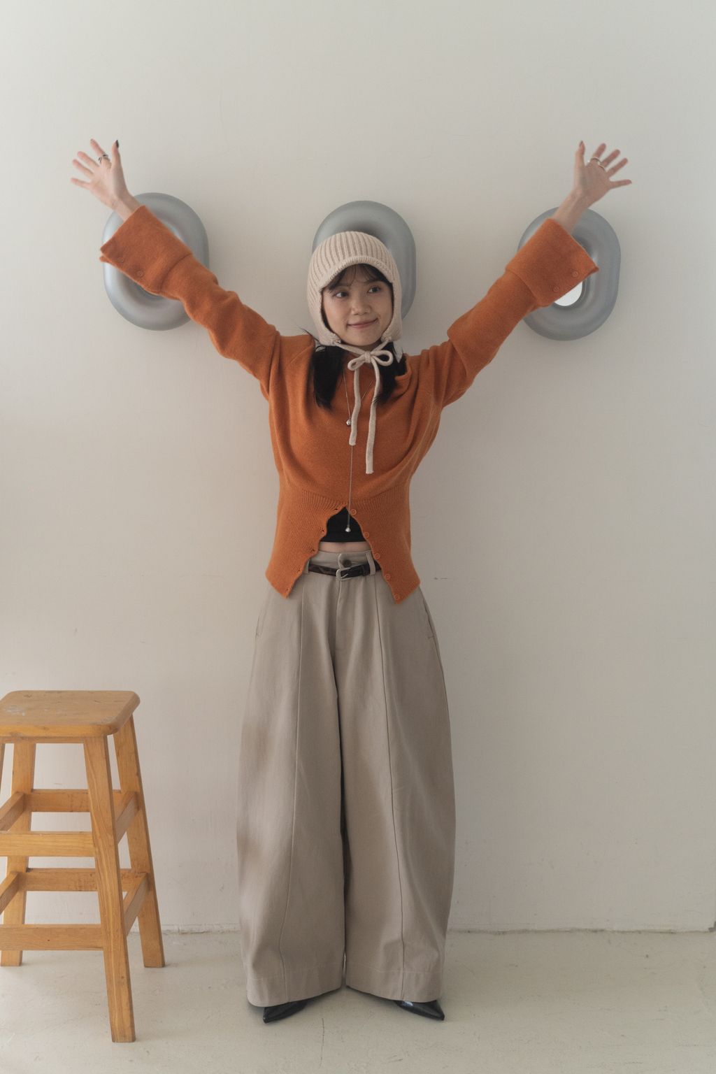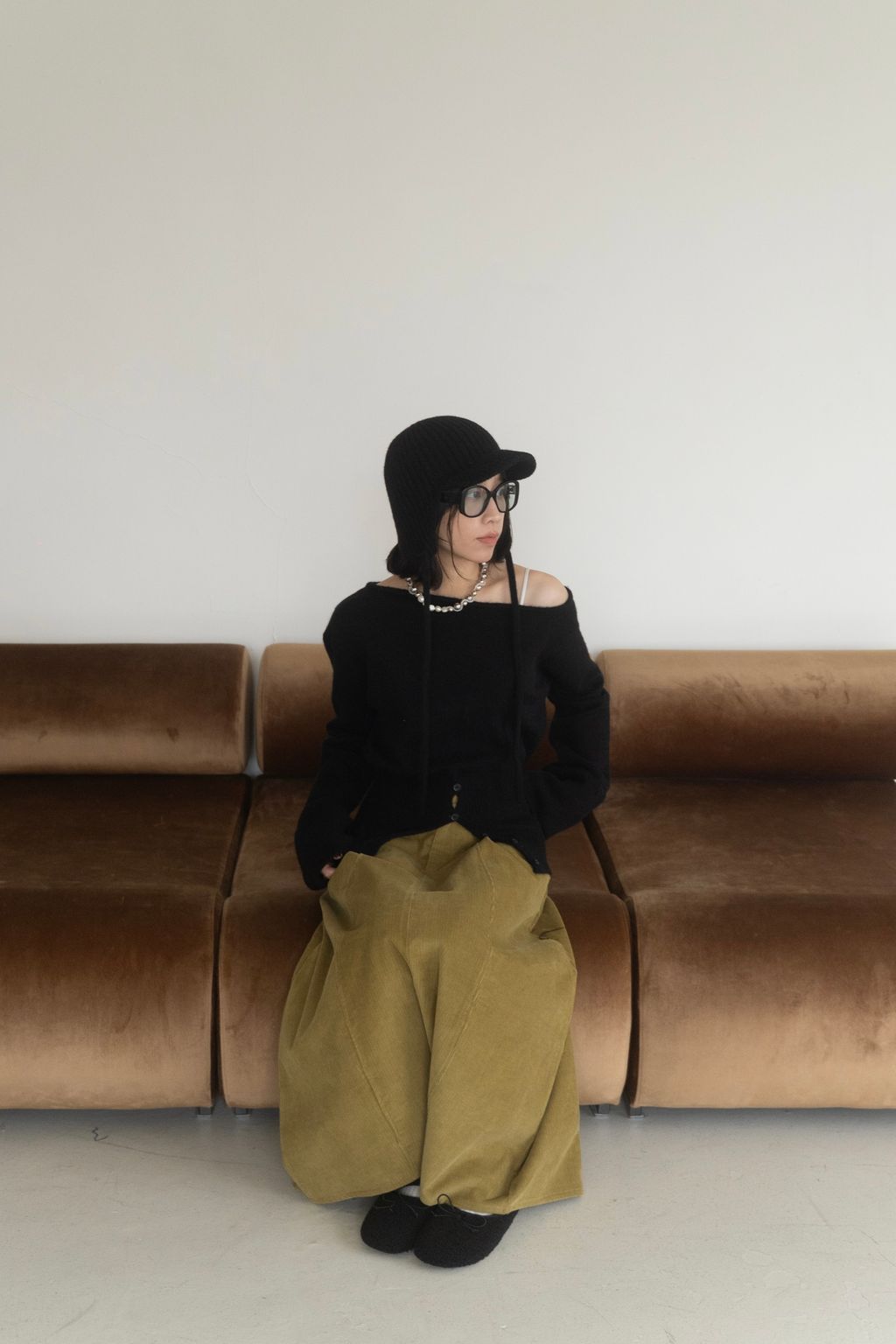 斜領收腰排釦寬袖毛衣 黑/橘