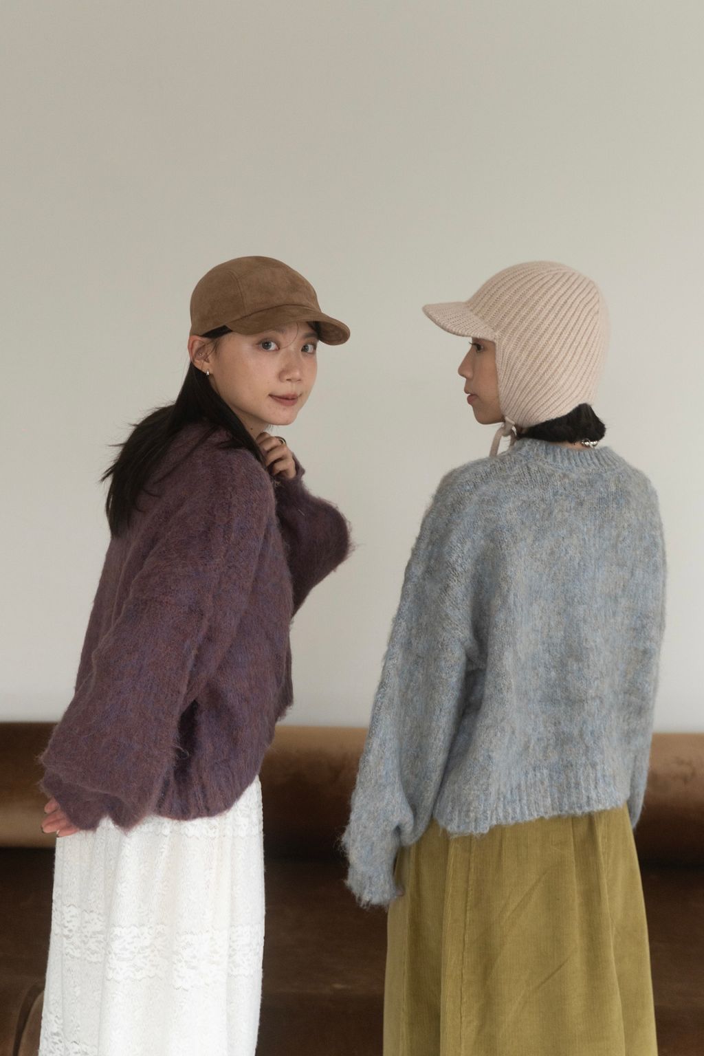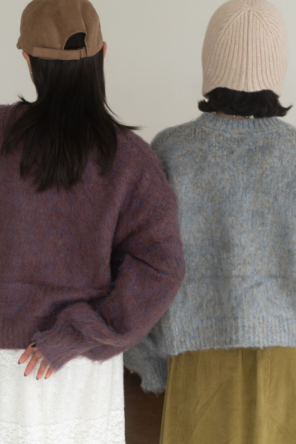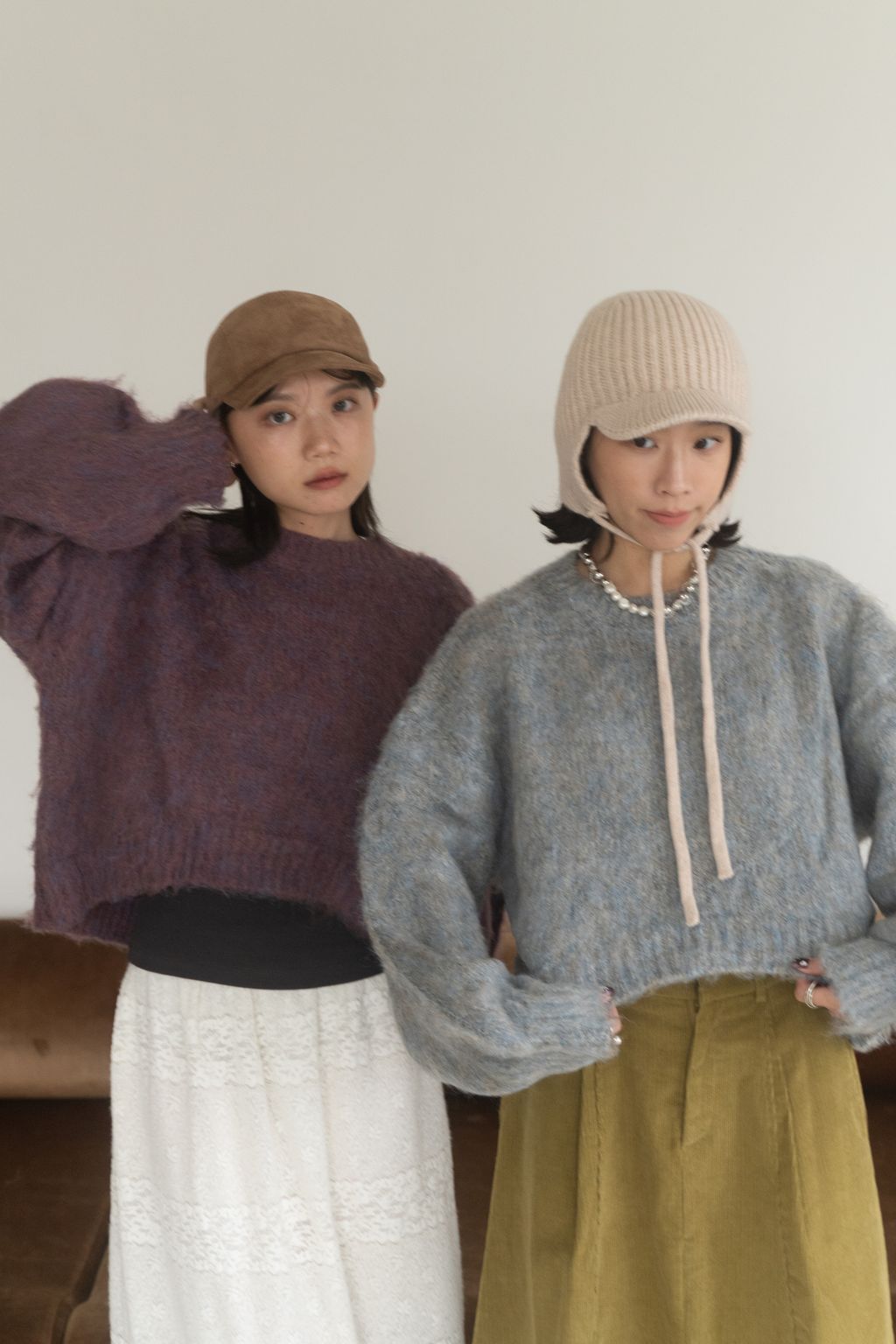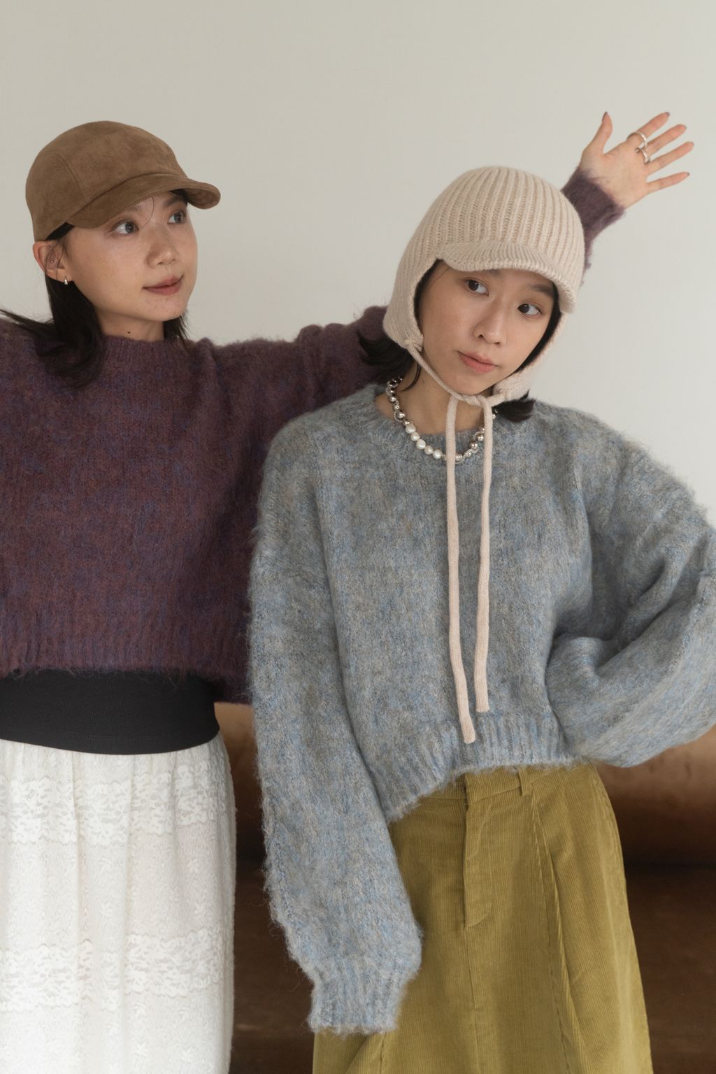 莫內花園燈籠袖短版毛衣 灰藍/紫