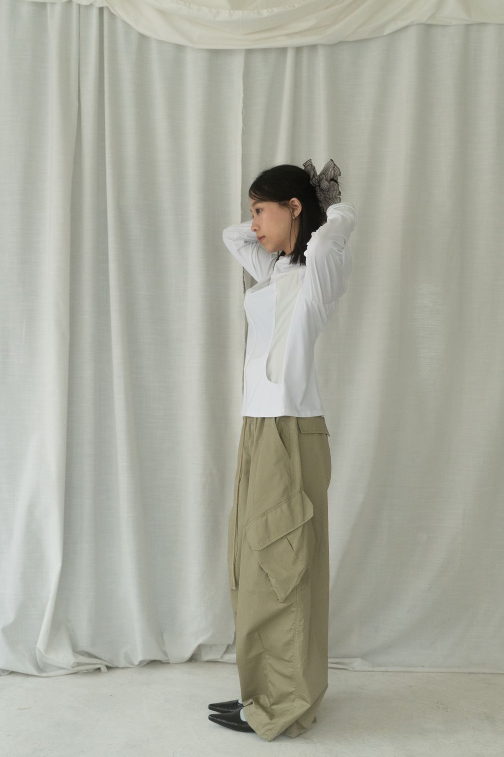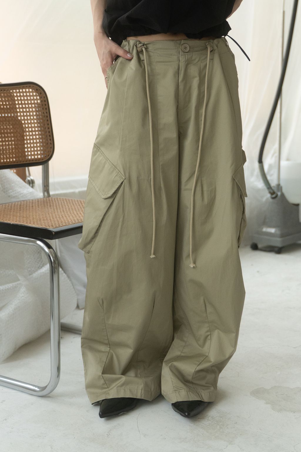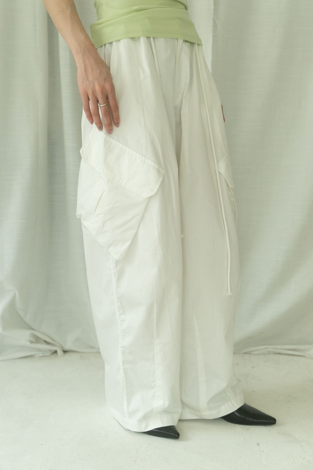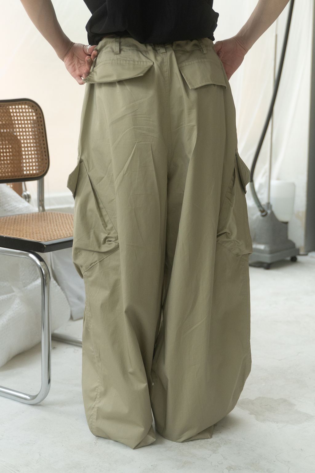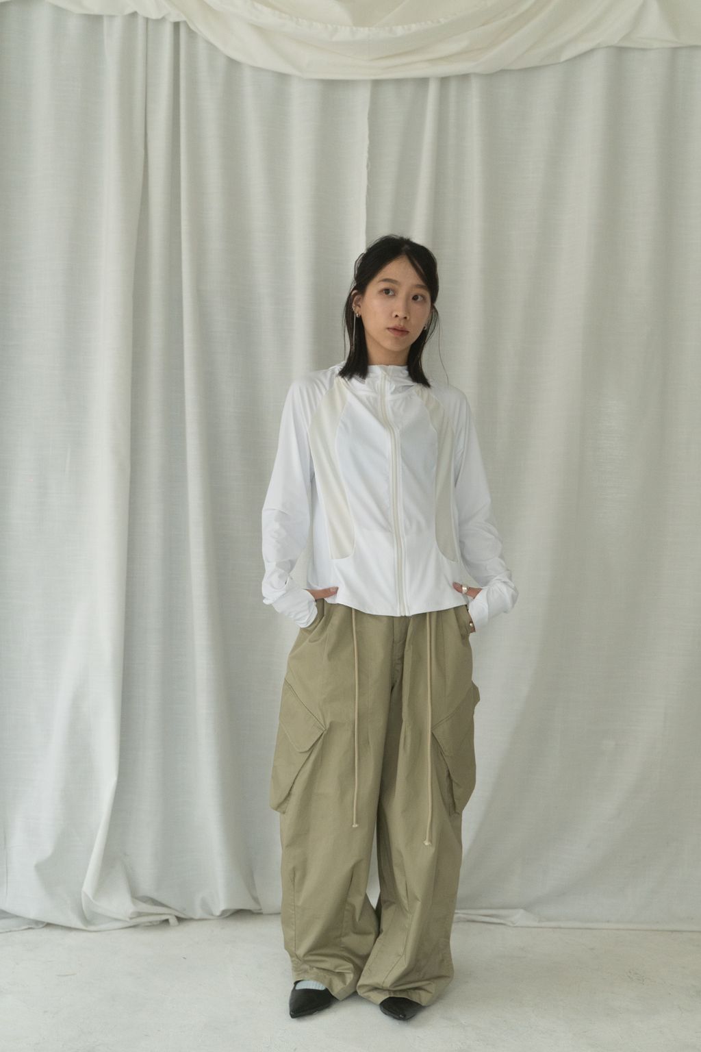 滑布挺版斜口袋工裝褲 白/卡其