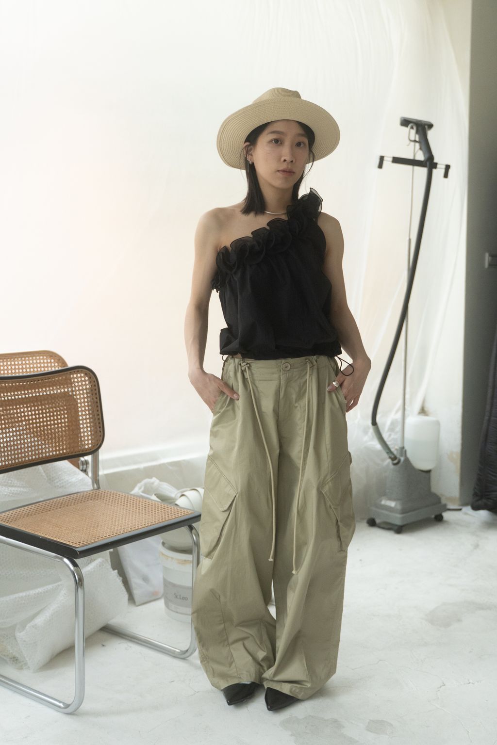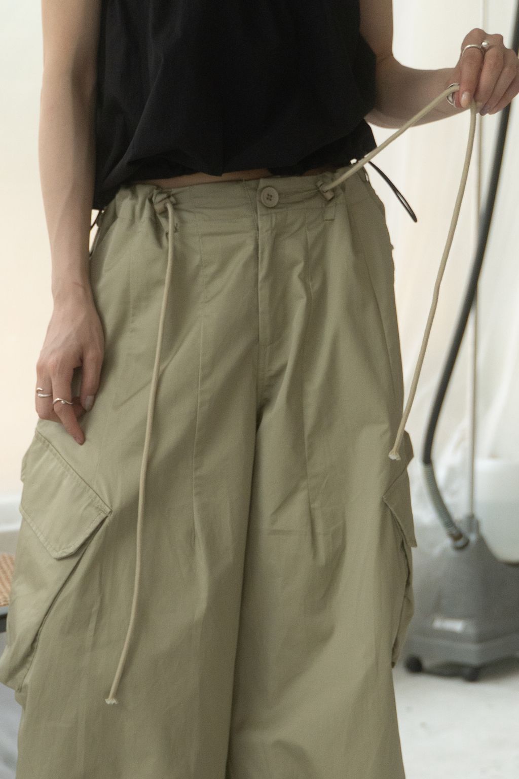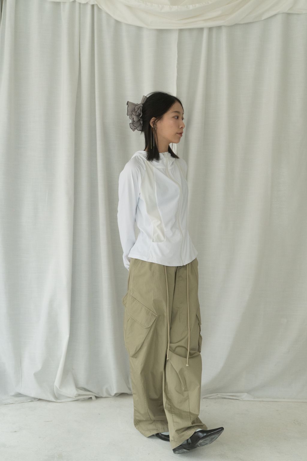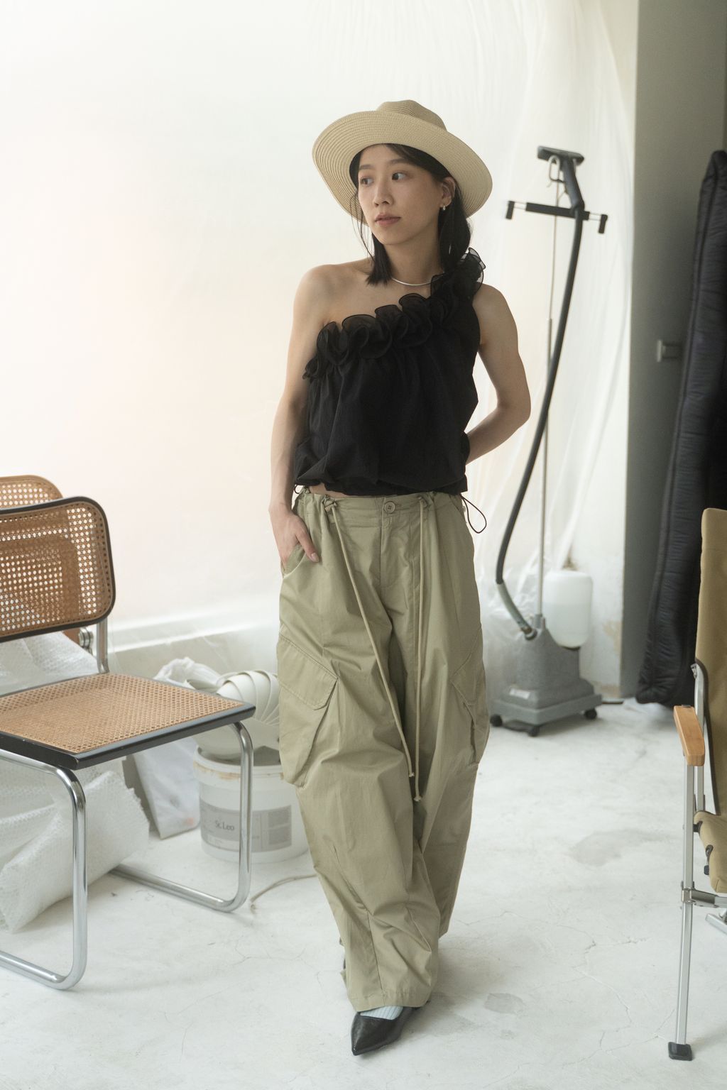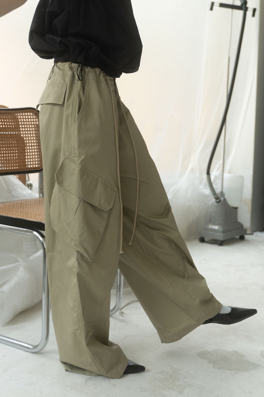滑布挺版斜口袋工裝褲 白/卡其