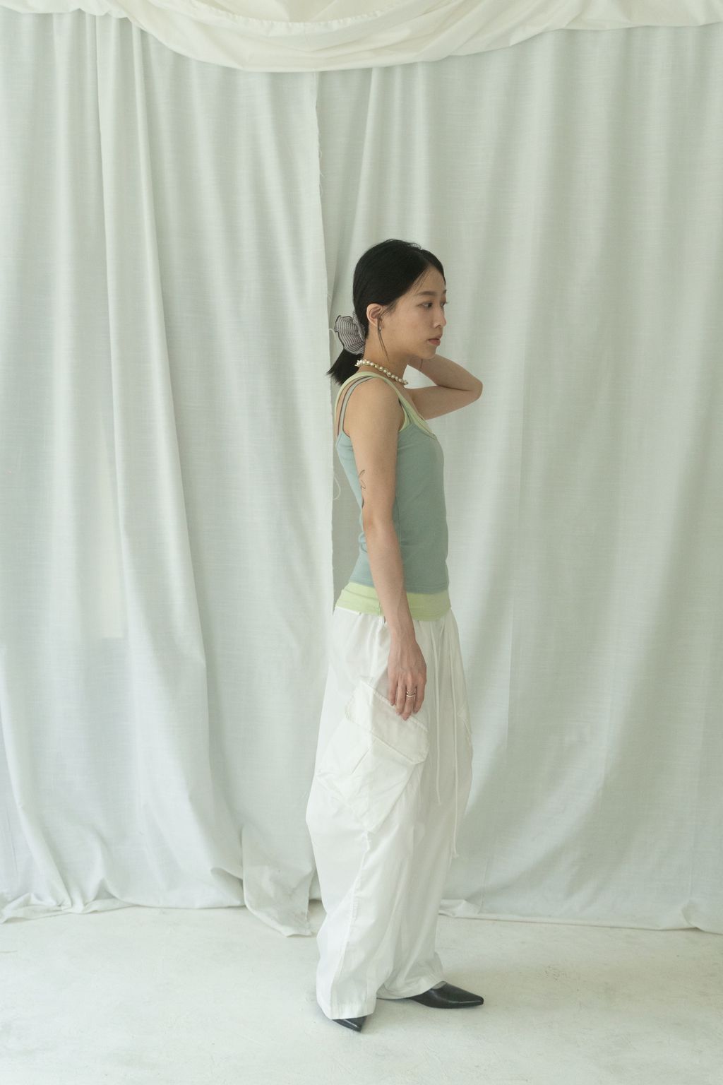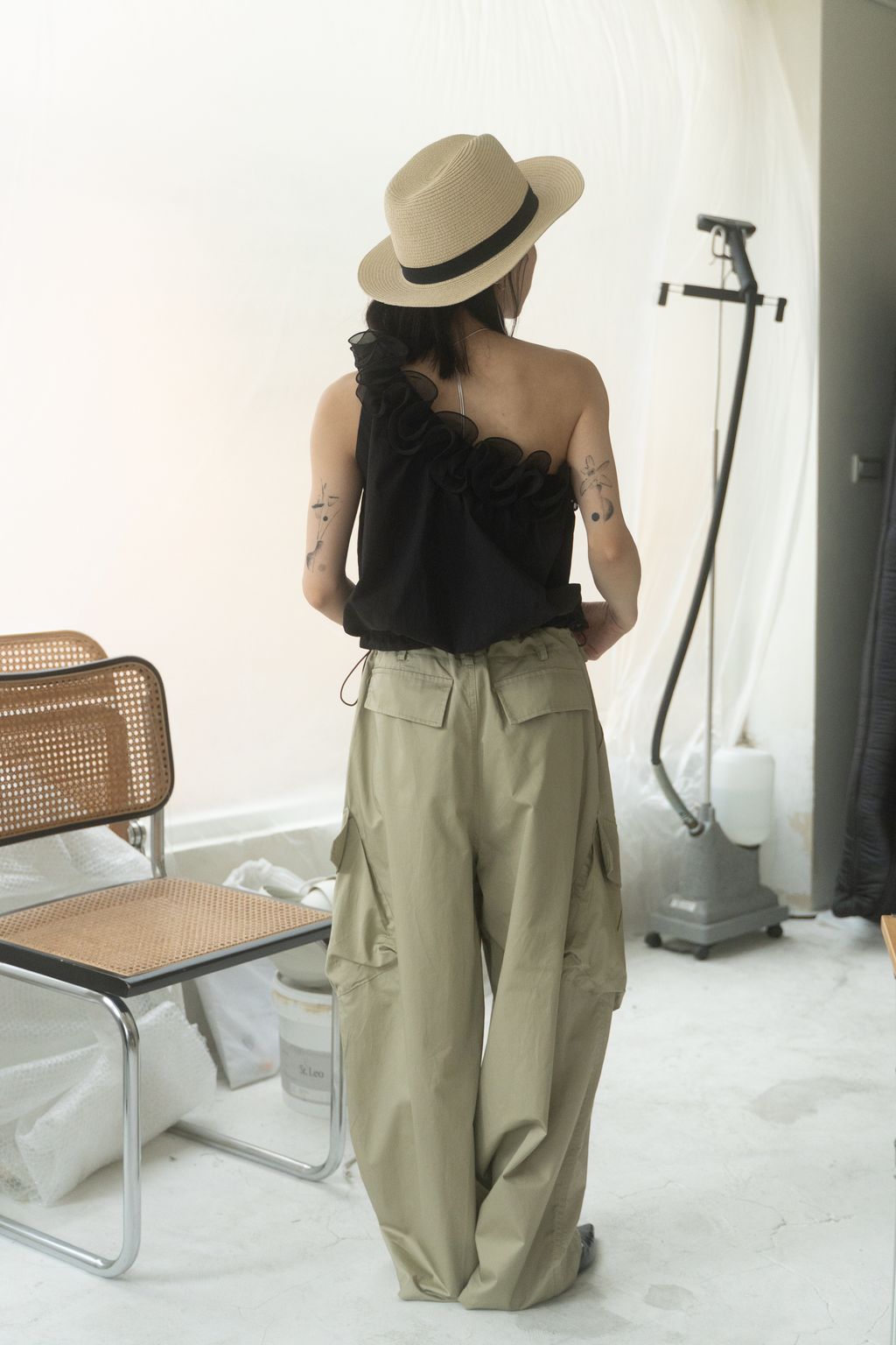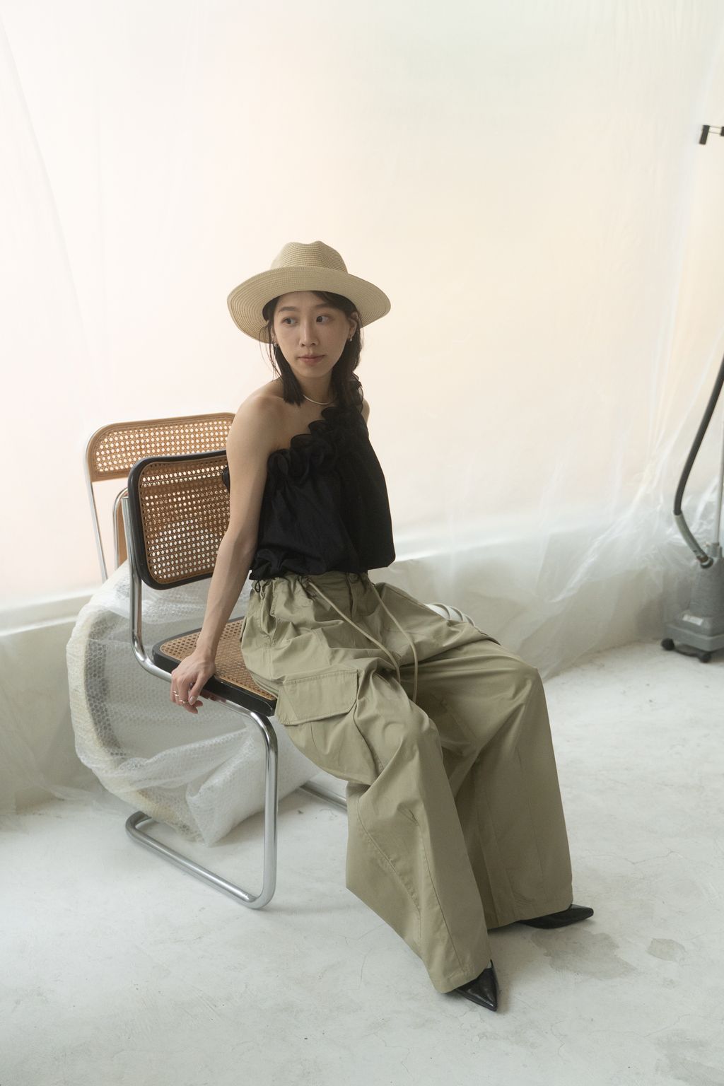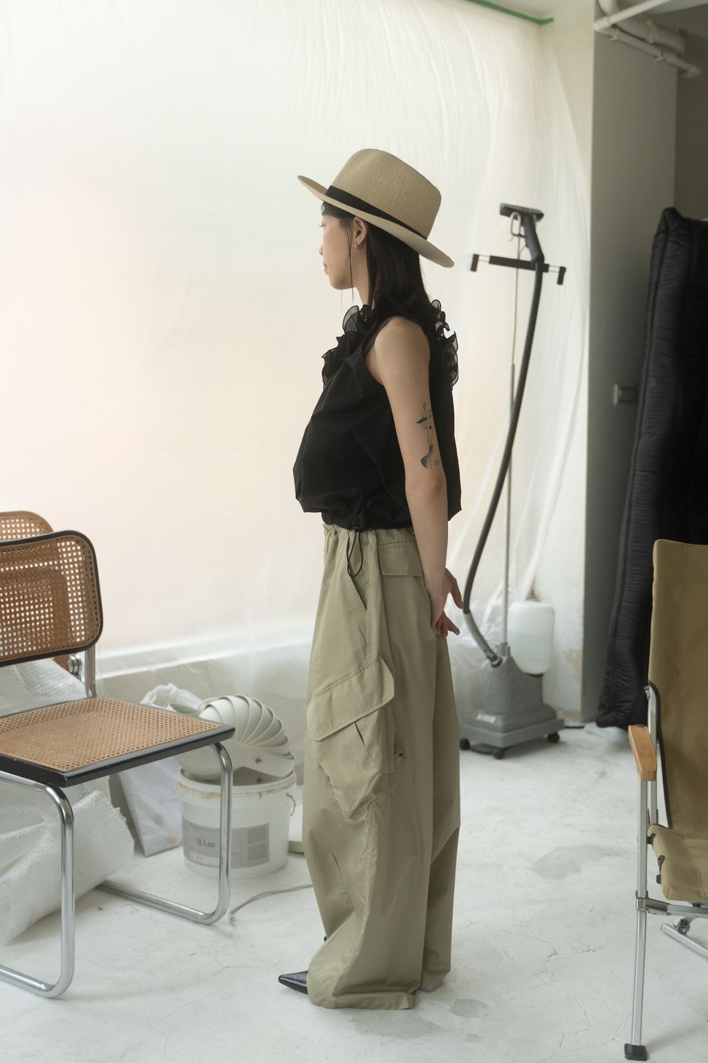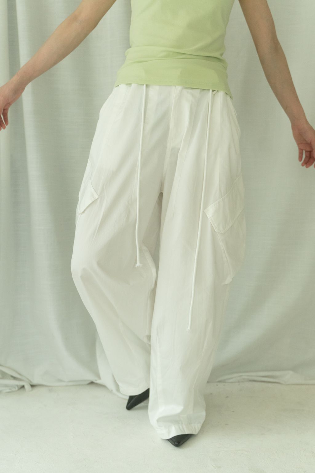 滑布挺版斜口袋工裝褲 白/卡其