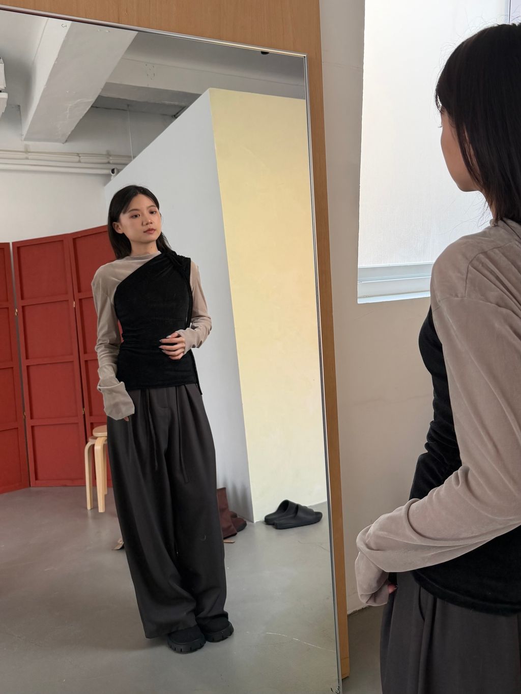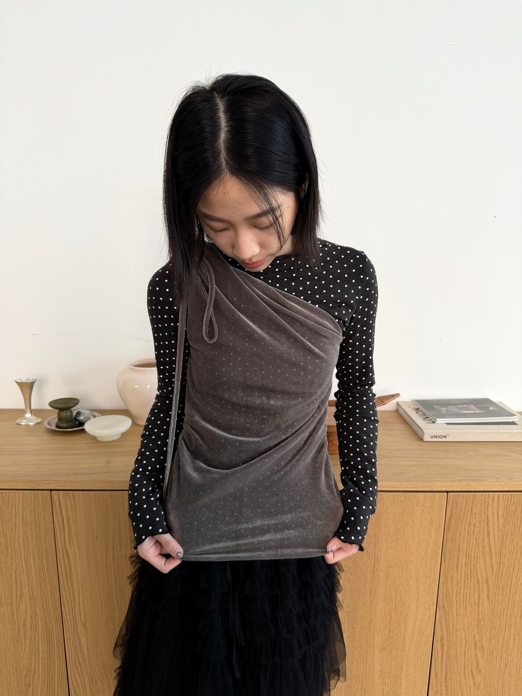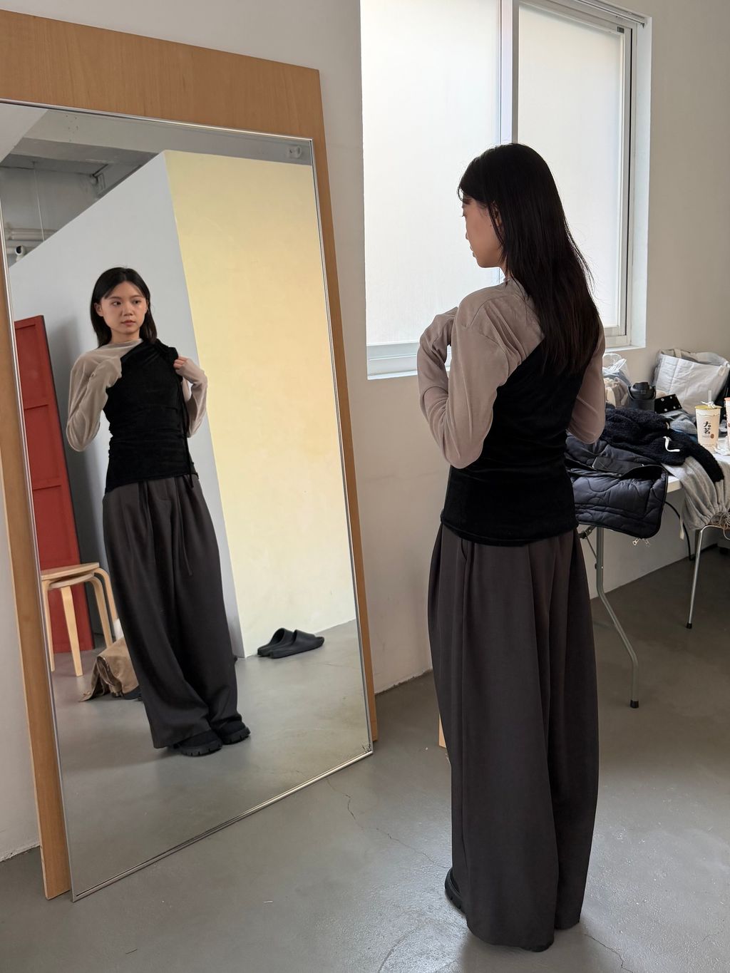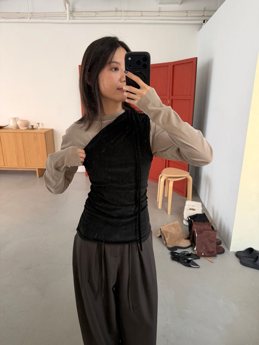 單肩透感絨面背心 黑/霧灰