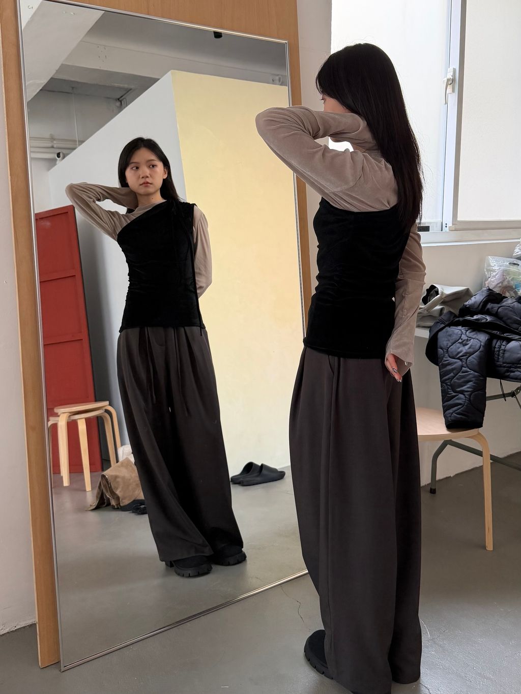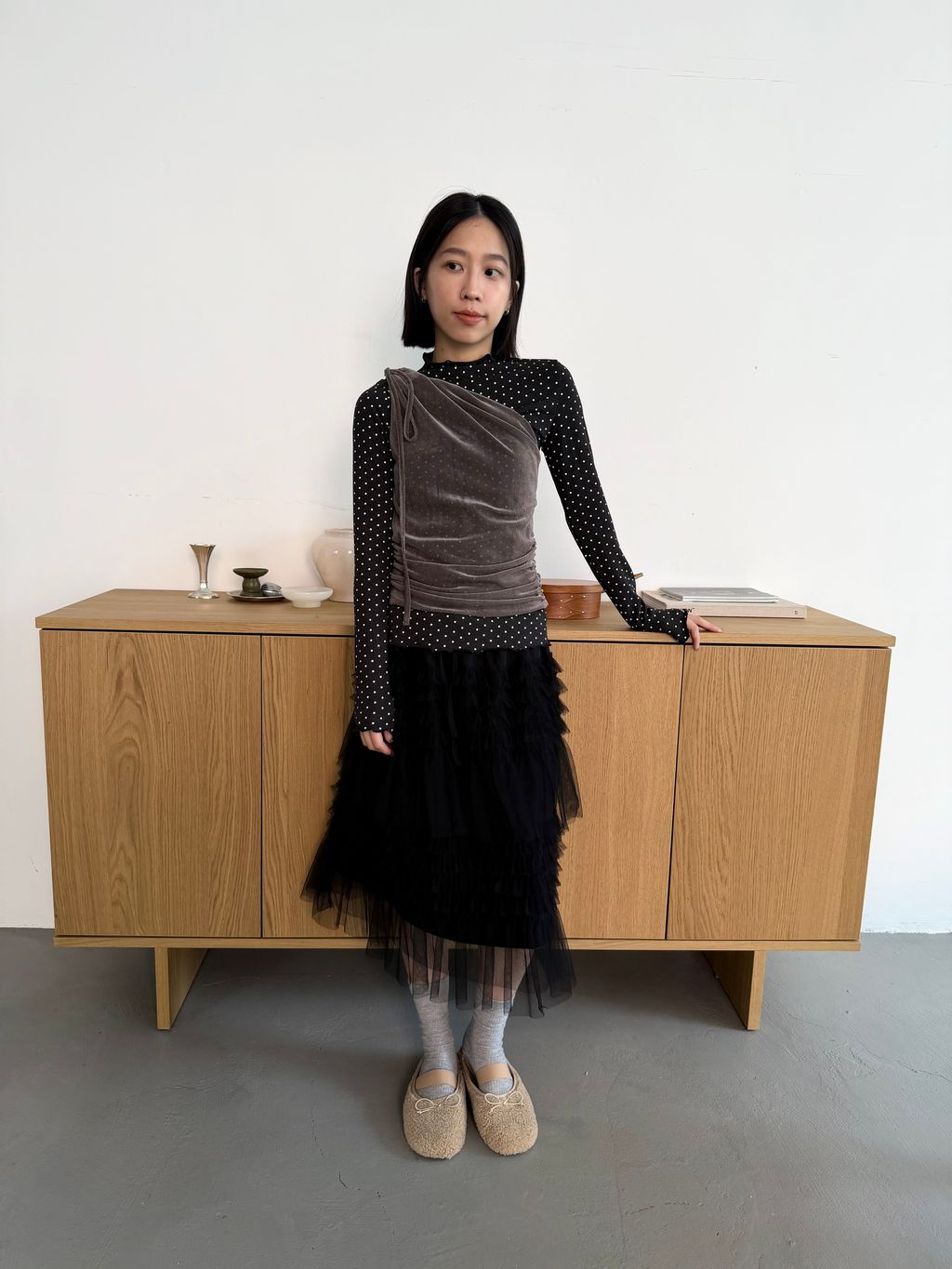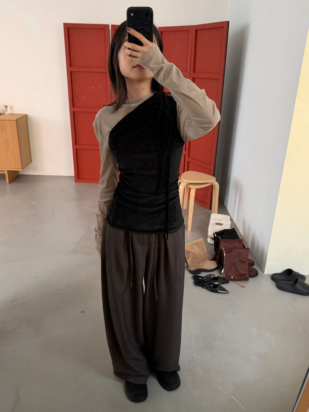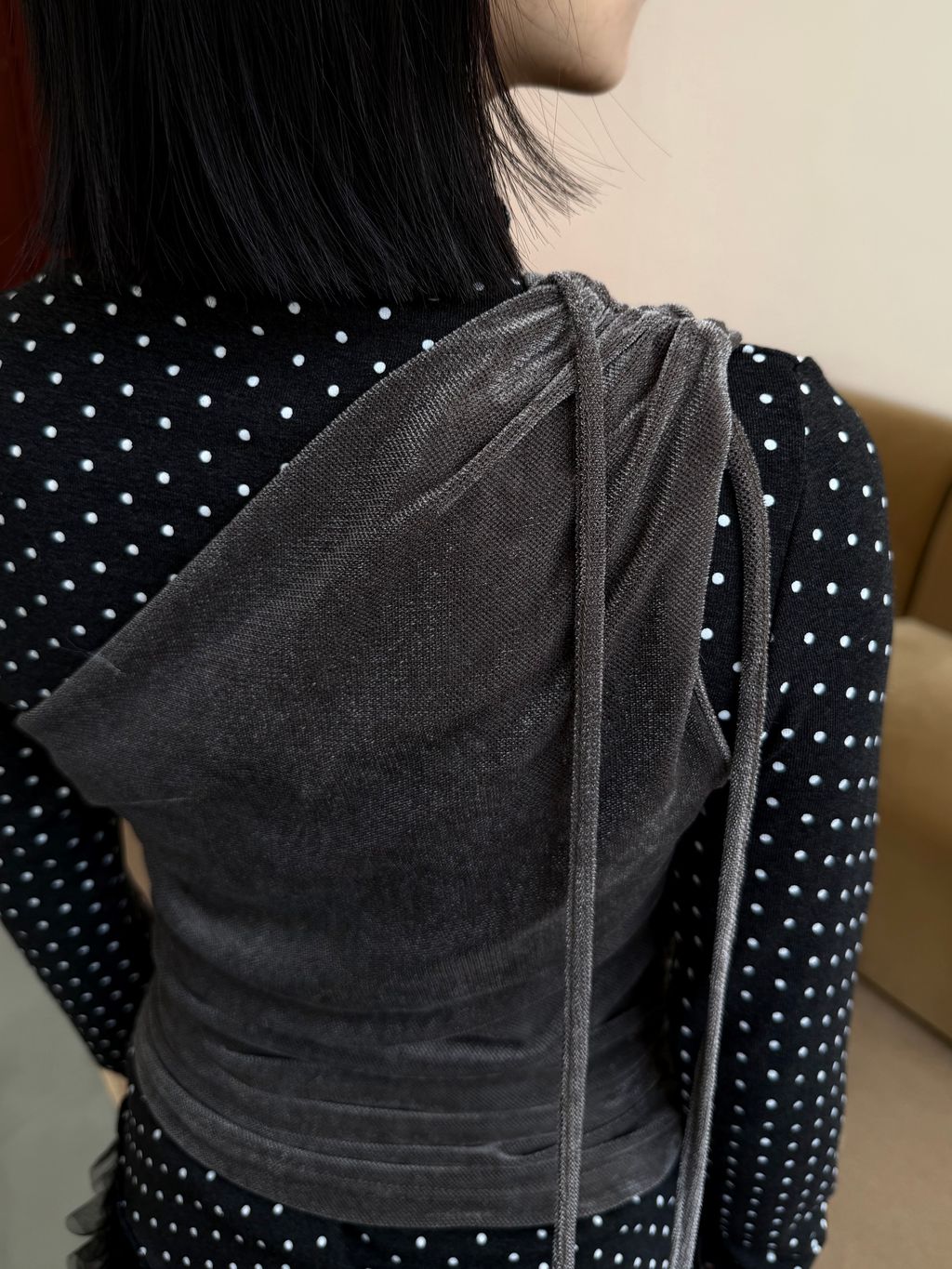 單肩透感絨面背心 黑/霧灰