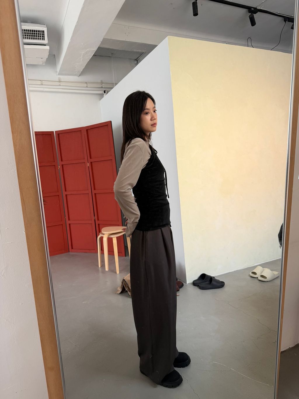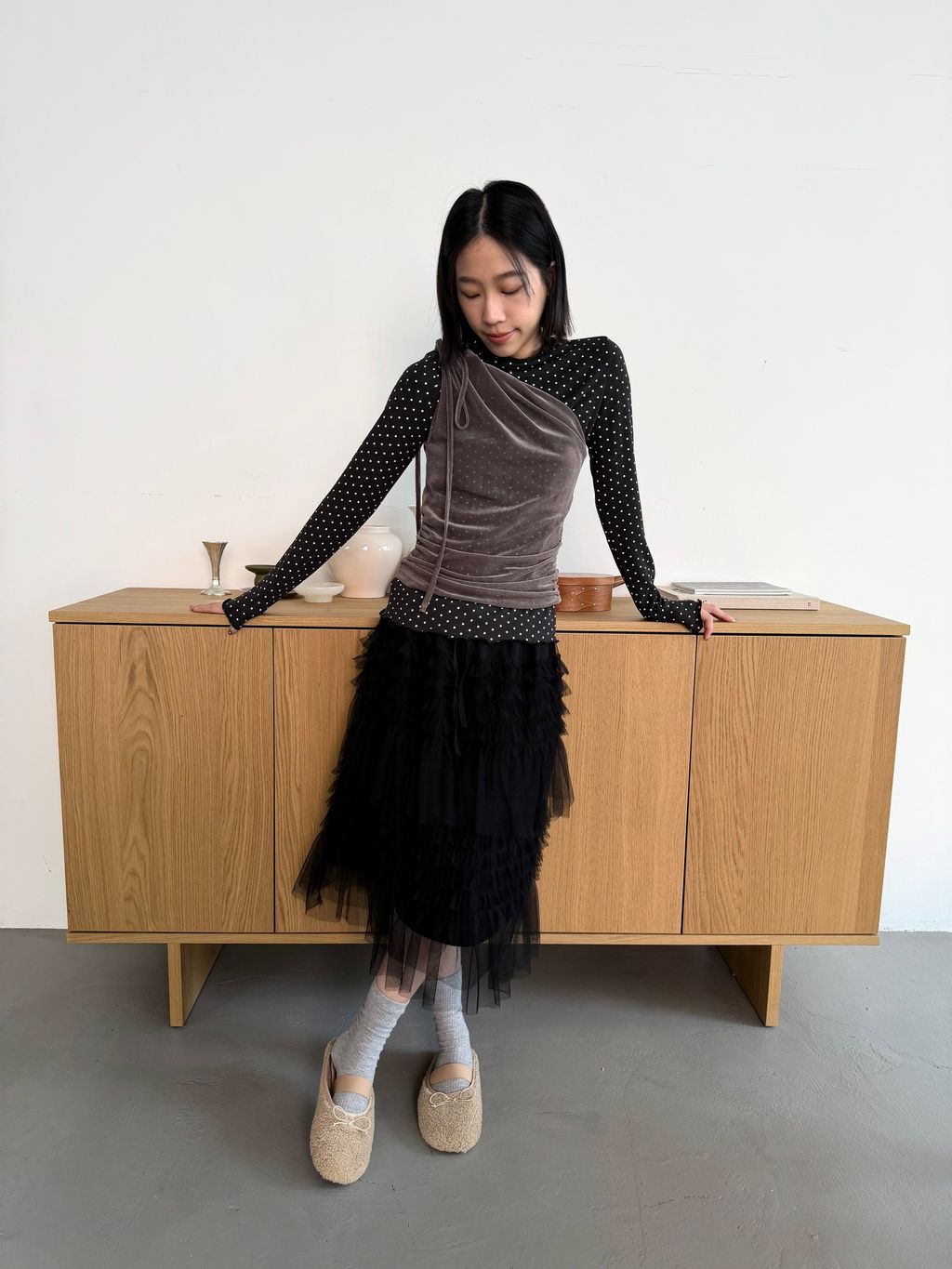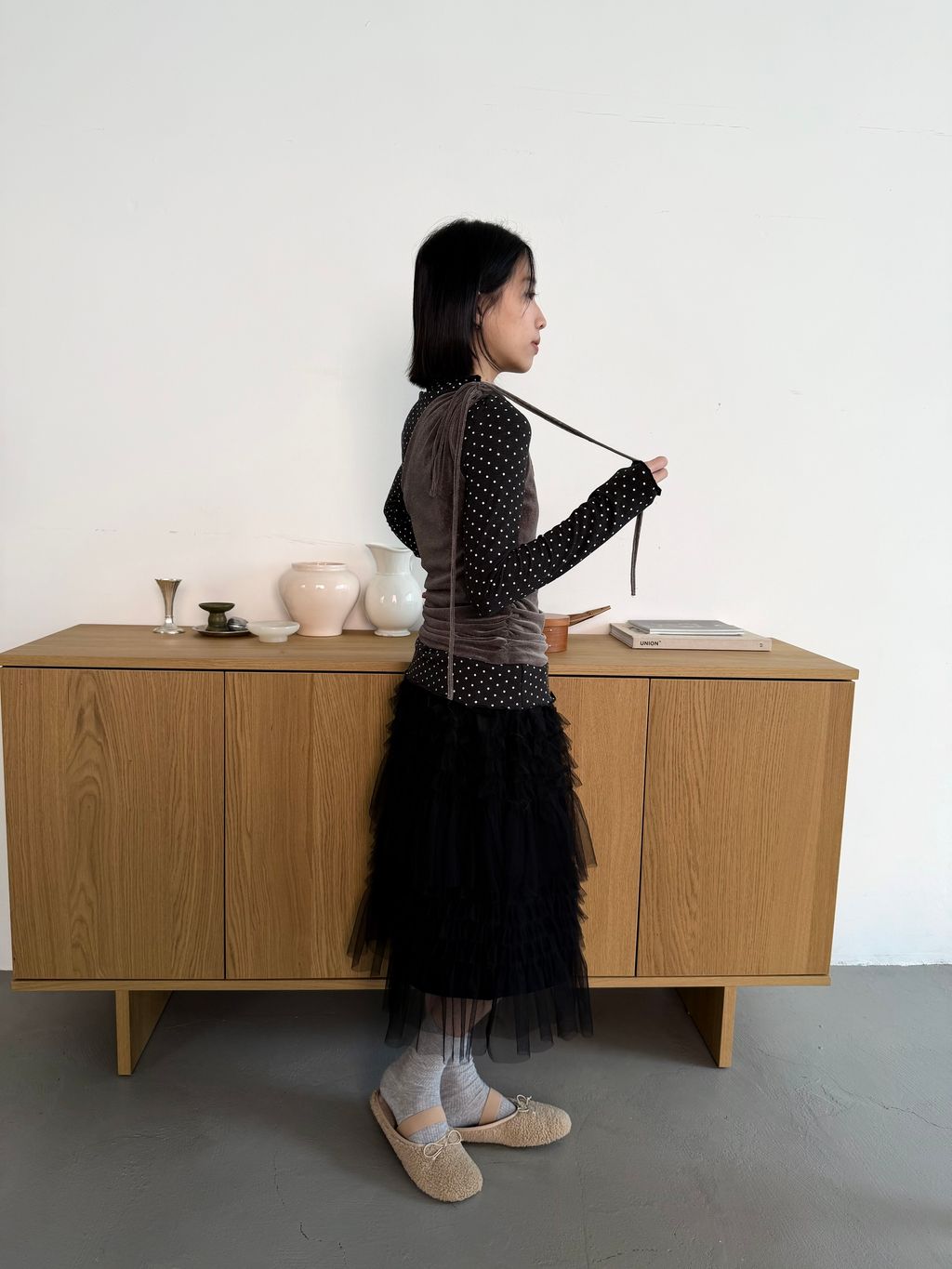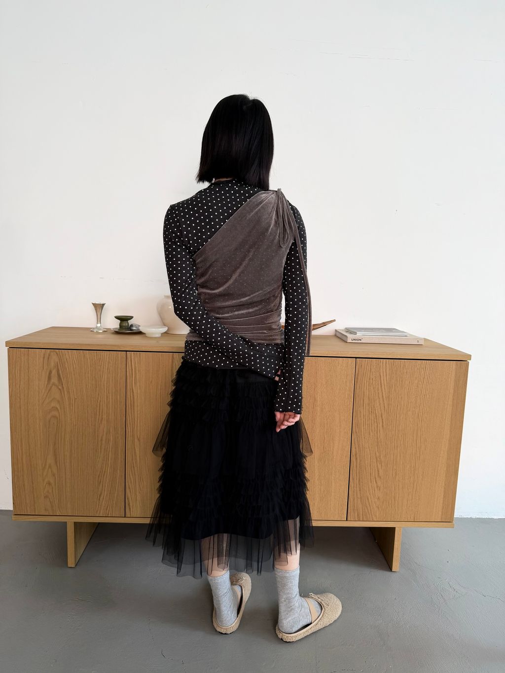 單肩透感絨面背心 黑/霧灰