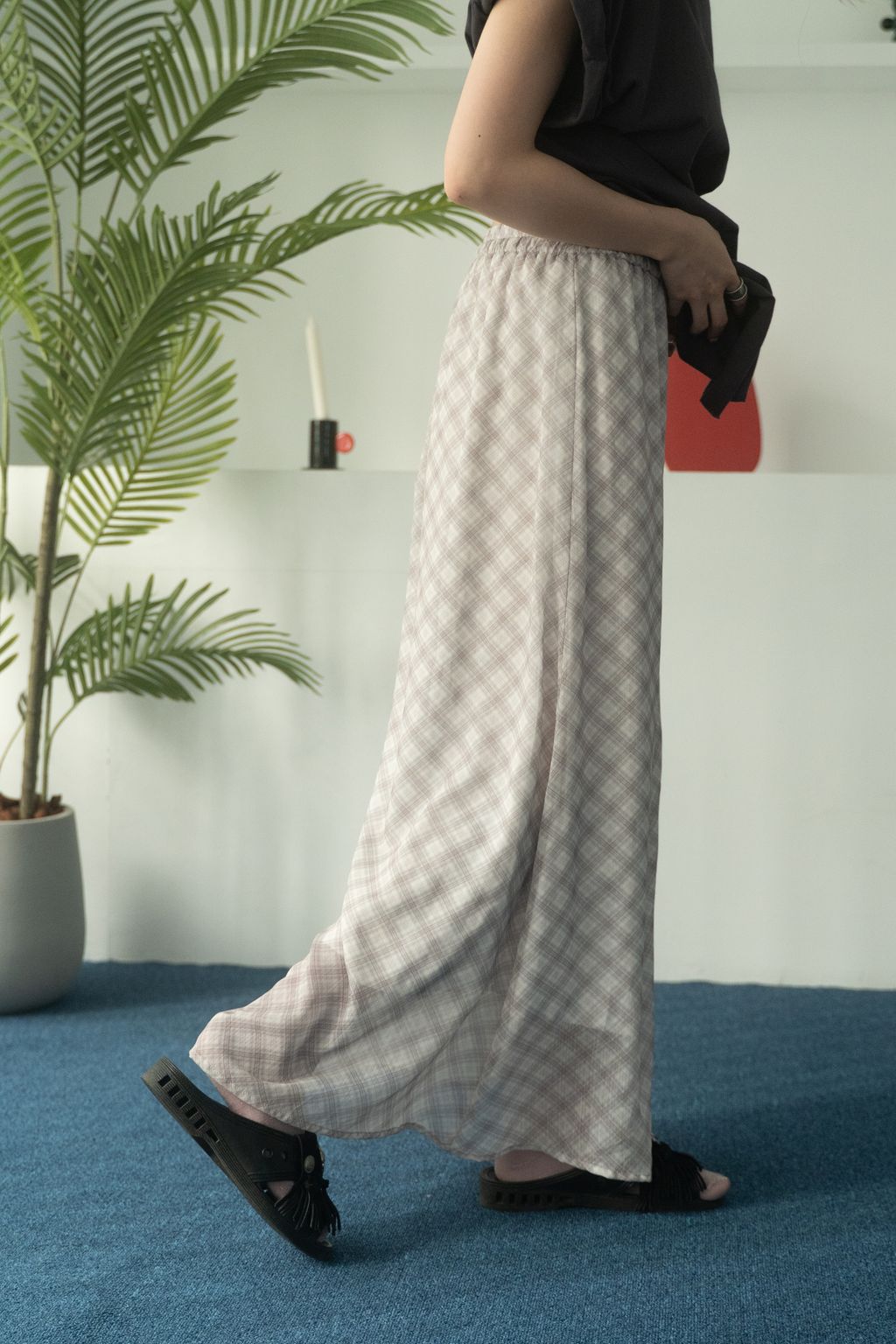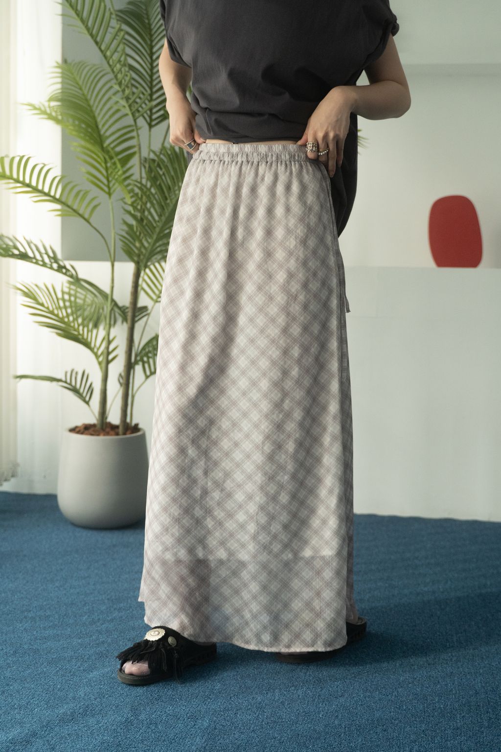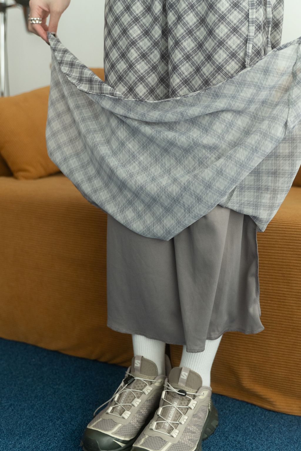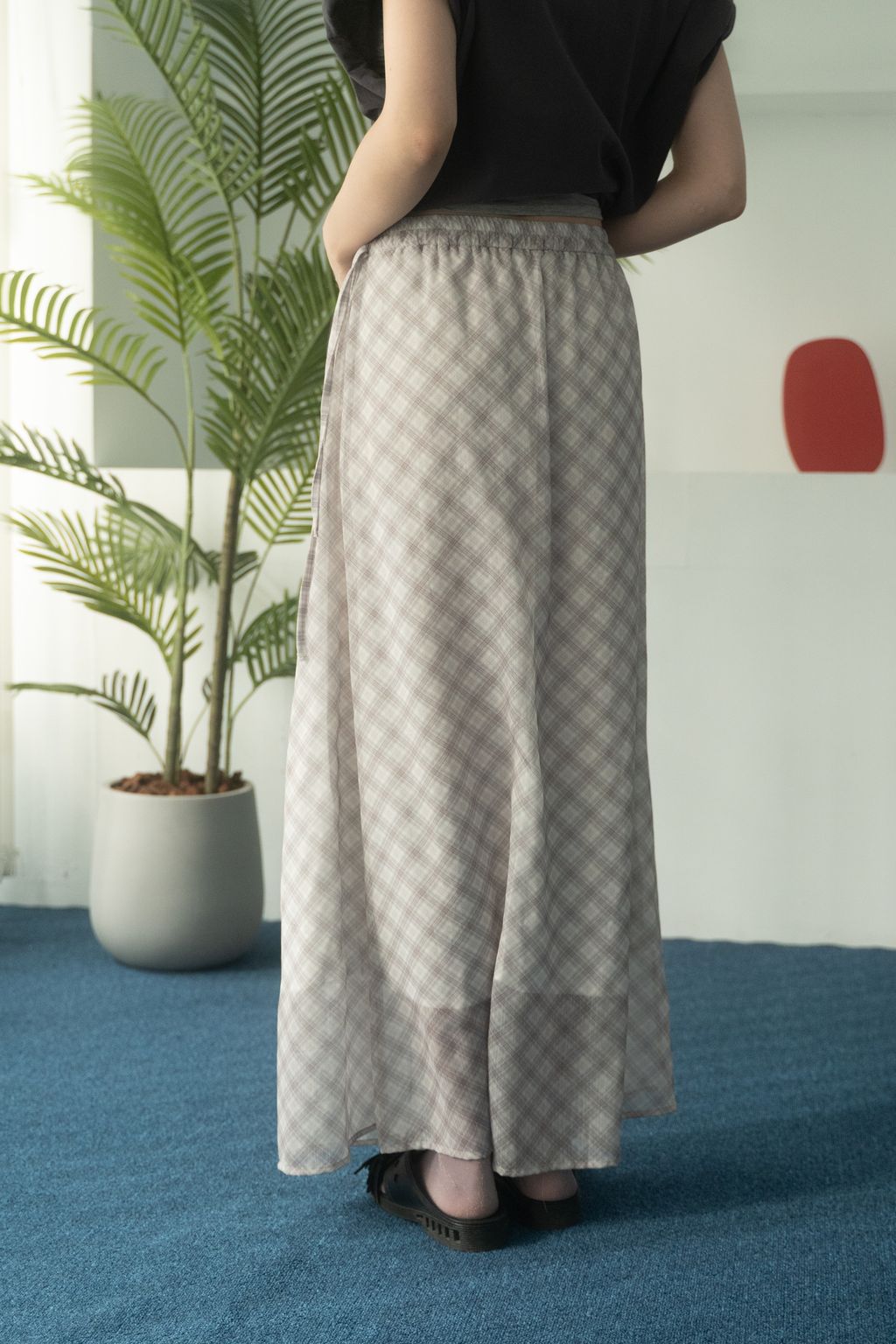 溫柔透感側抽繩格紋長裙 杏咖/灰藍