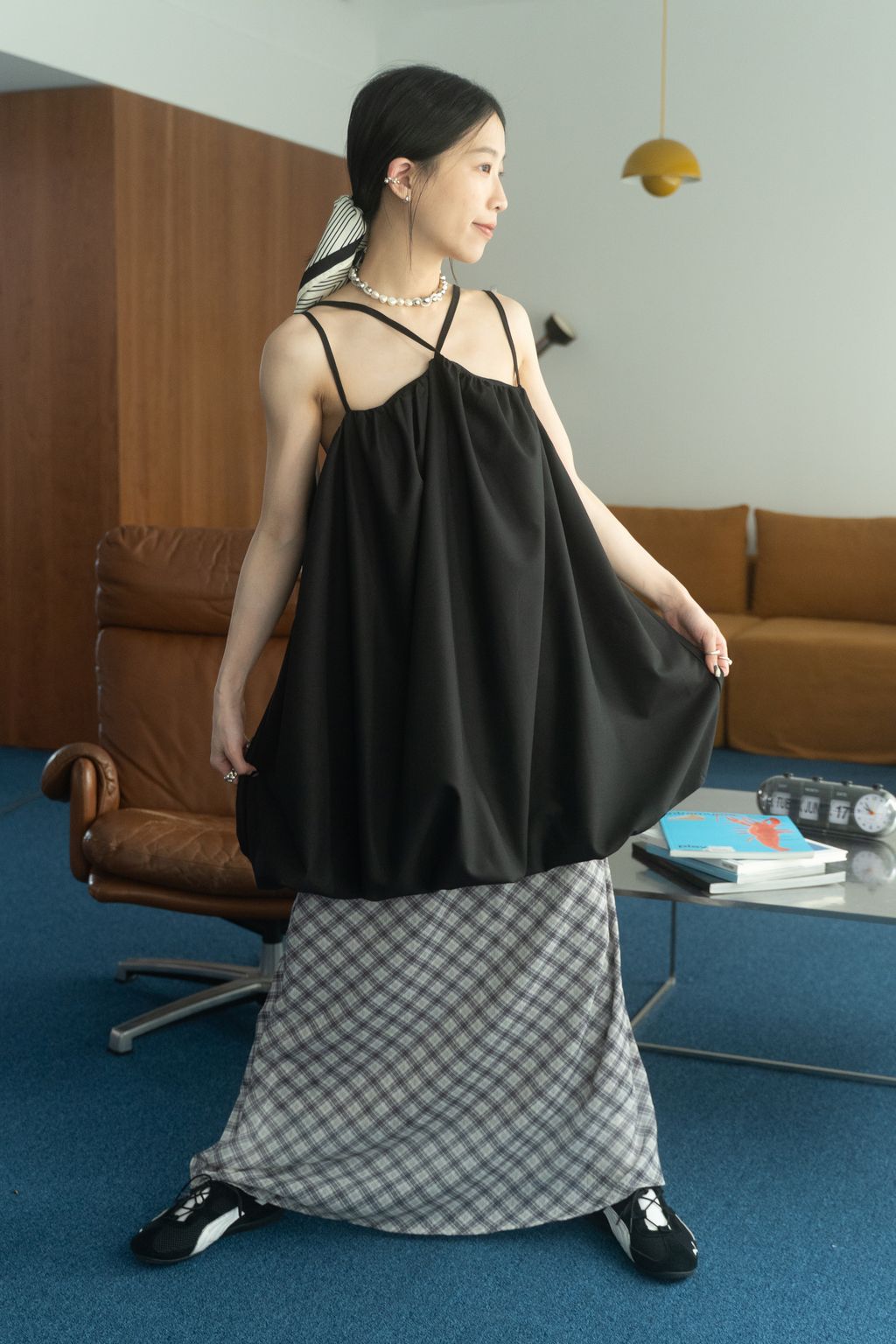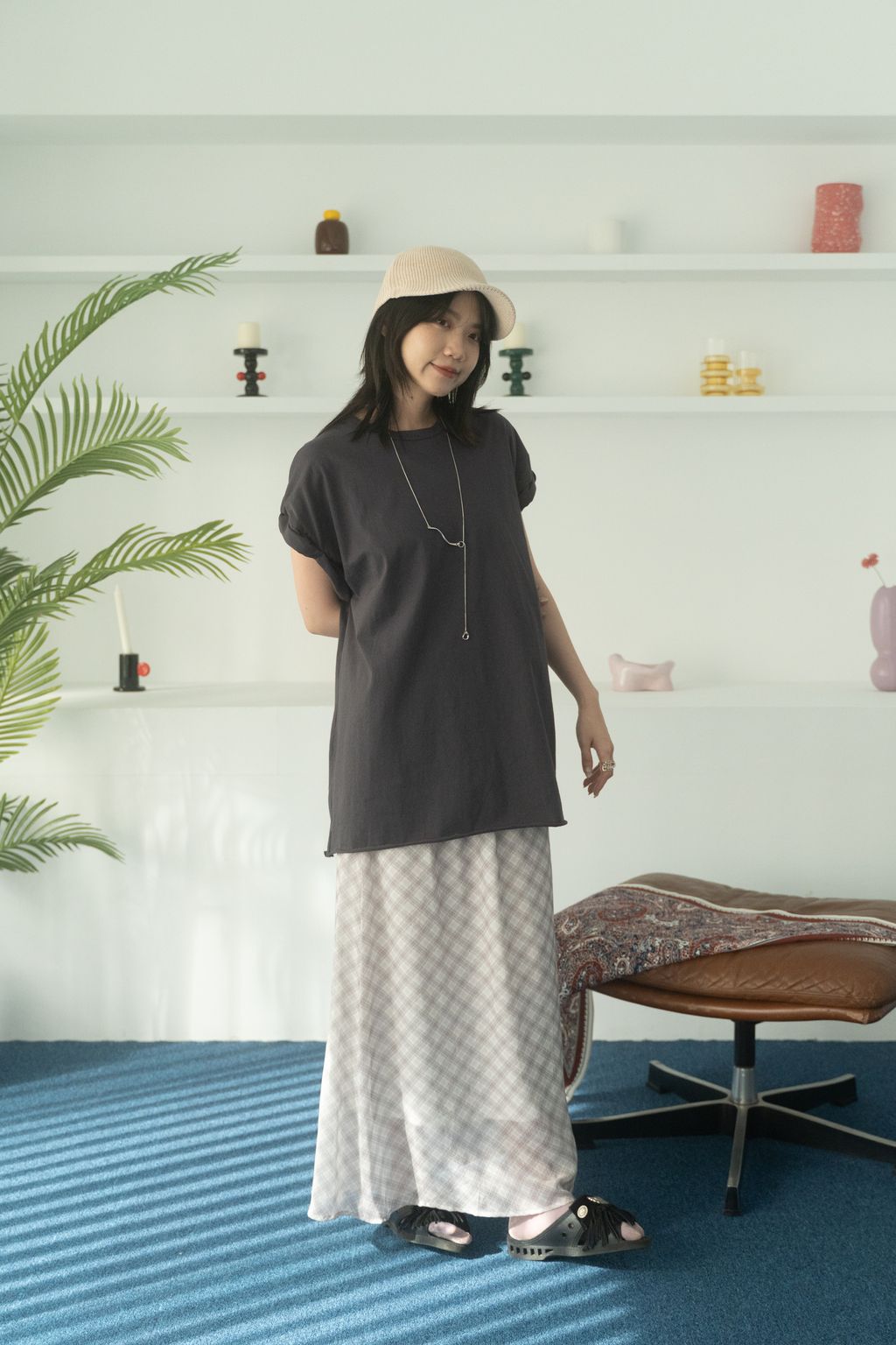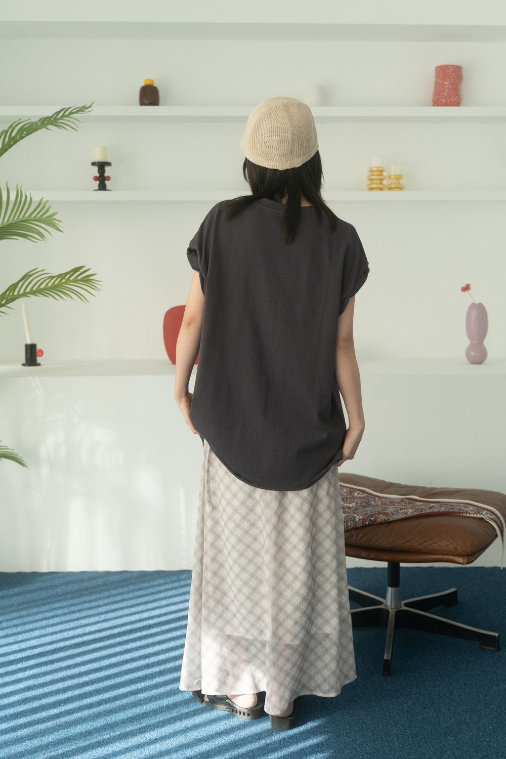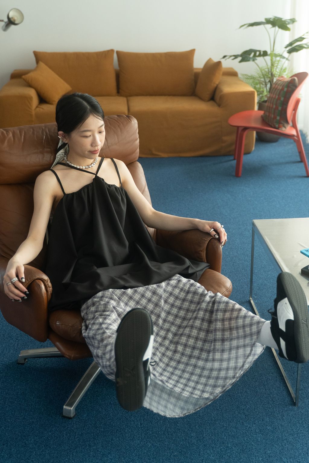 溫柔透感側抽繩格紋長裙 杏咖/灰藍