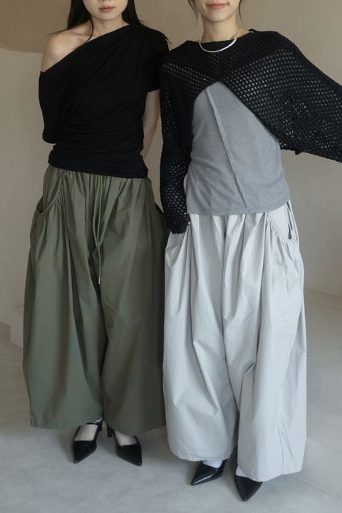 抽繩寬鬆長版褲裙 白/淺灰