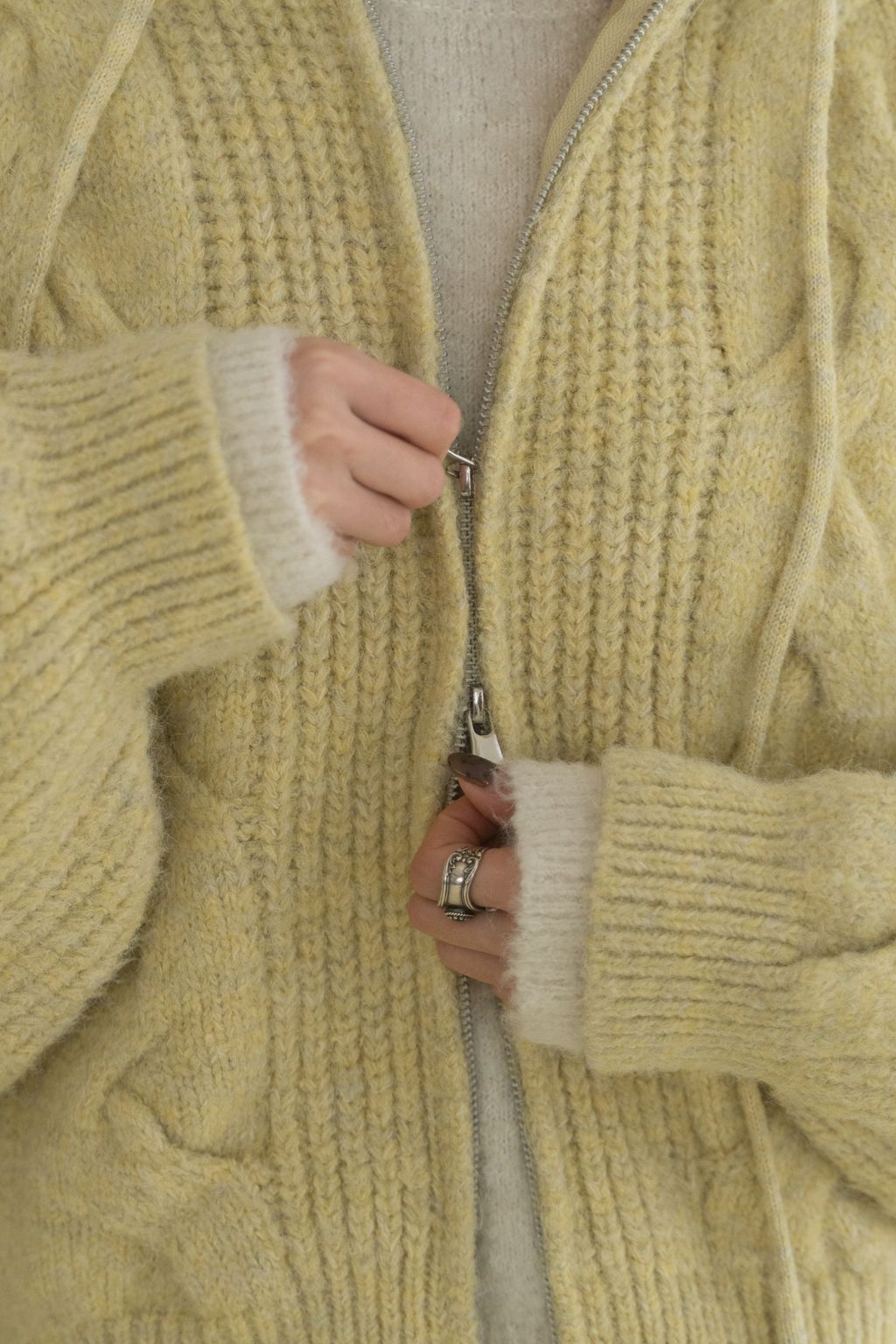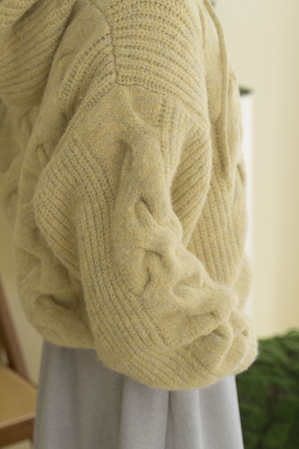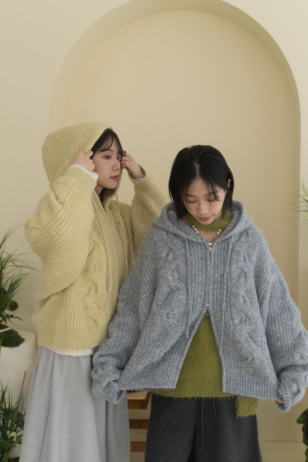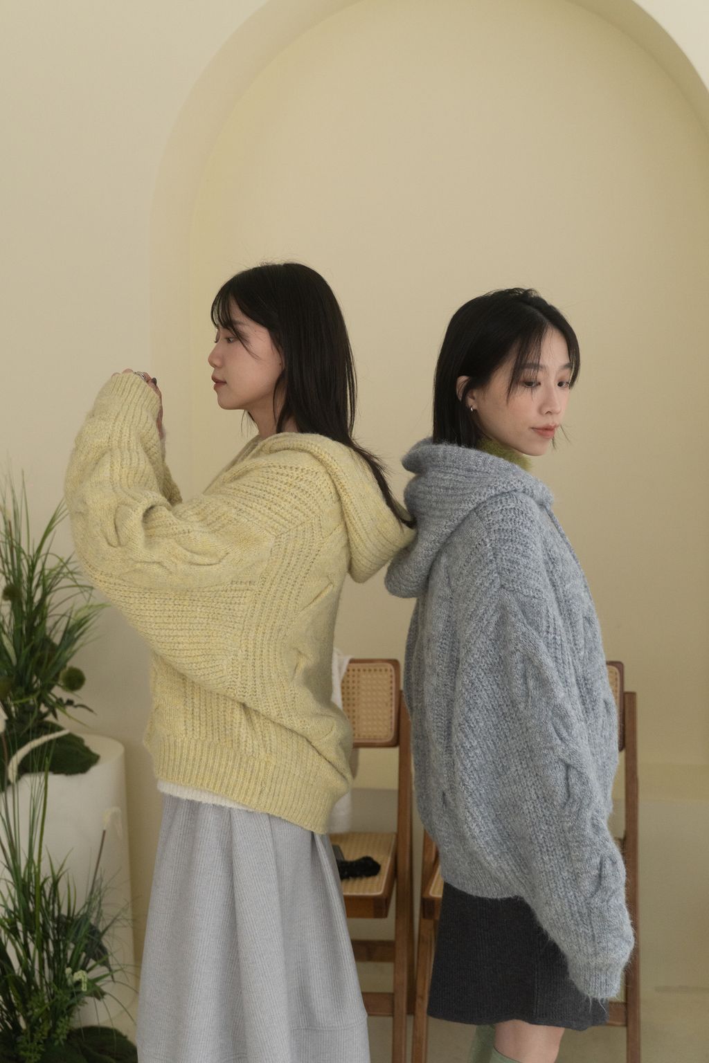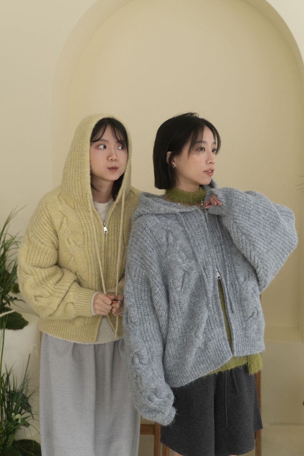粗麻花澎袖雙拉鍊連帽外套 黃/灰