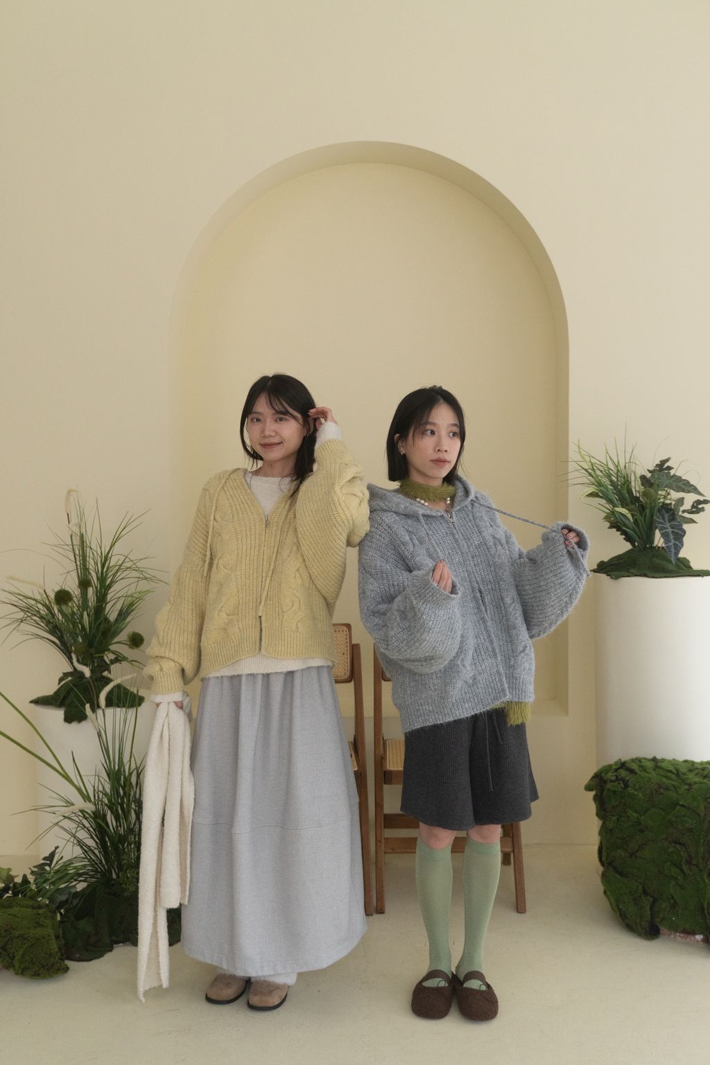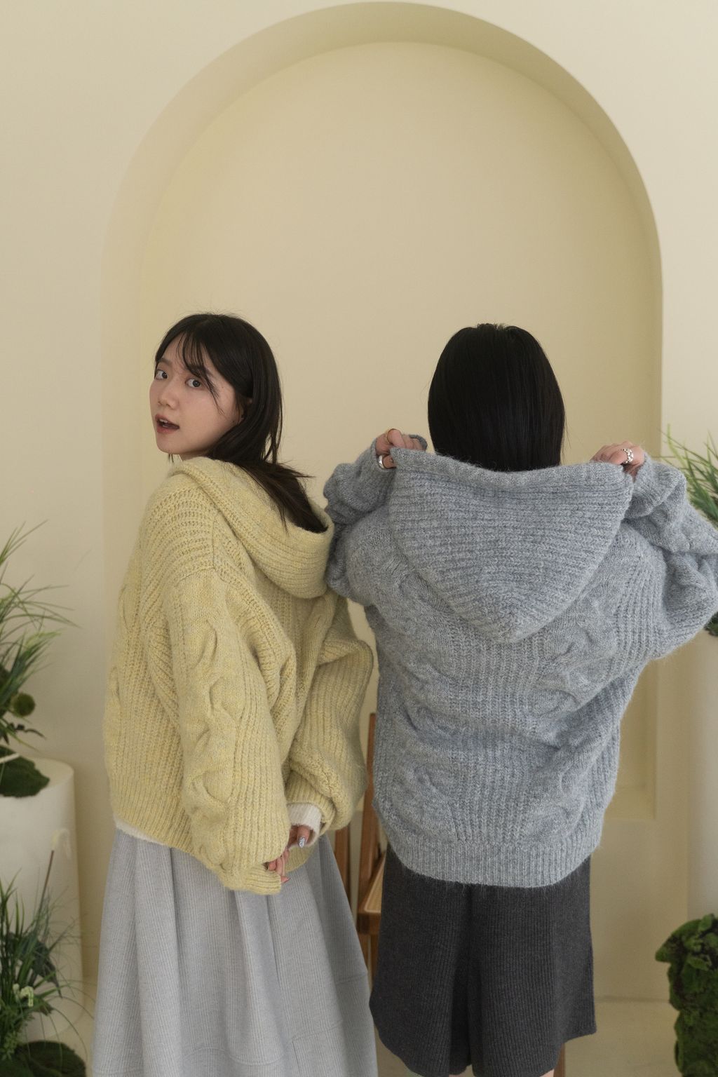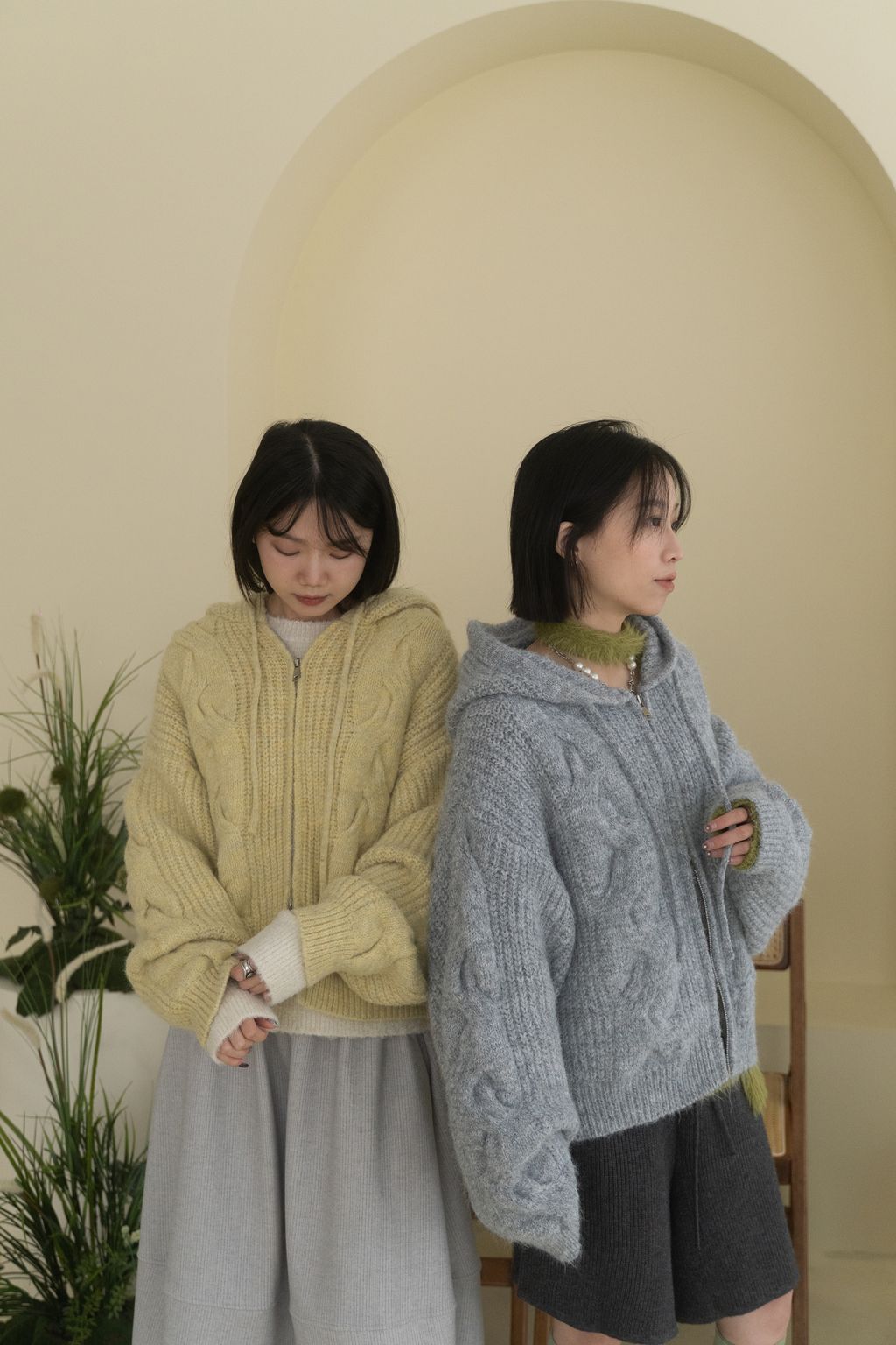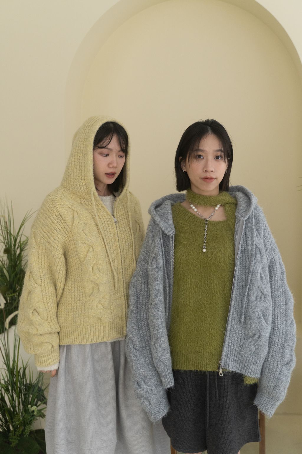 粗麻花澎袖雙拉鍊連帽外套 黃/灰
