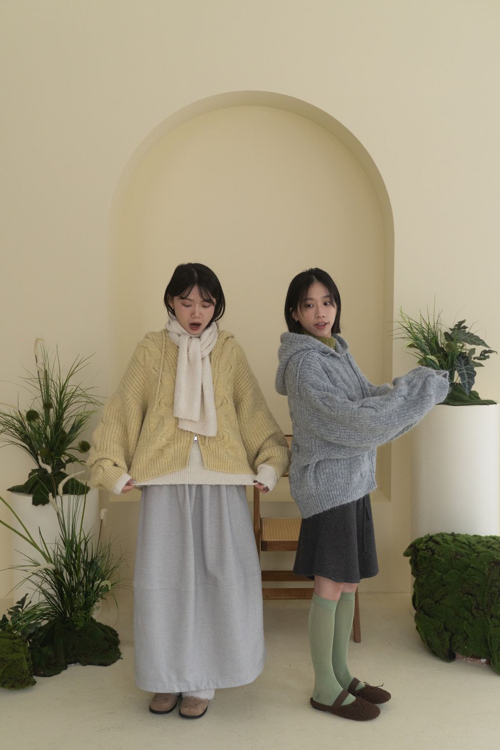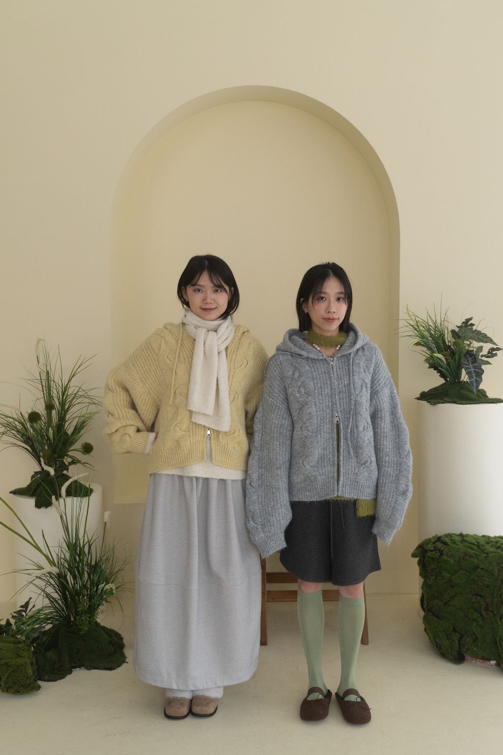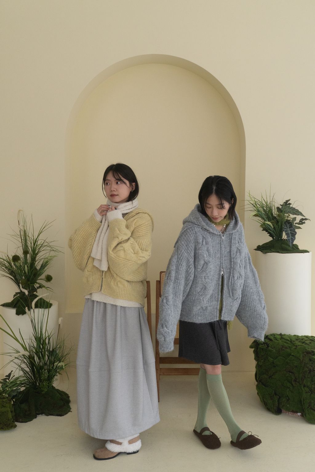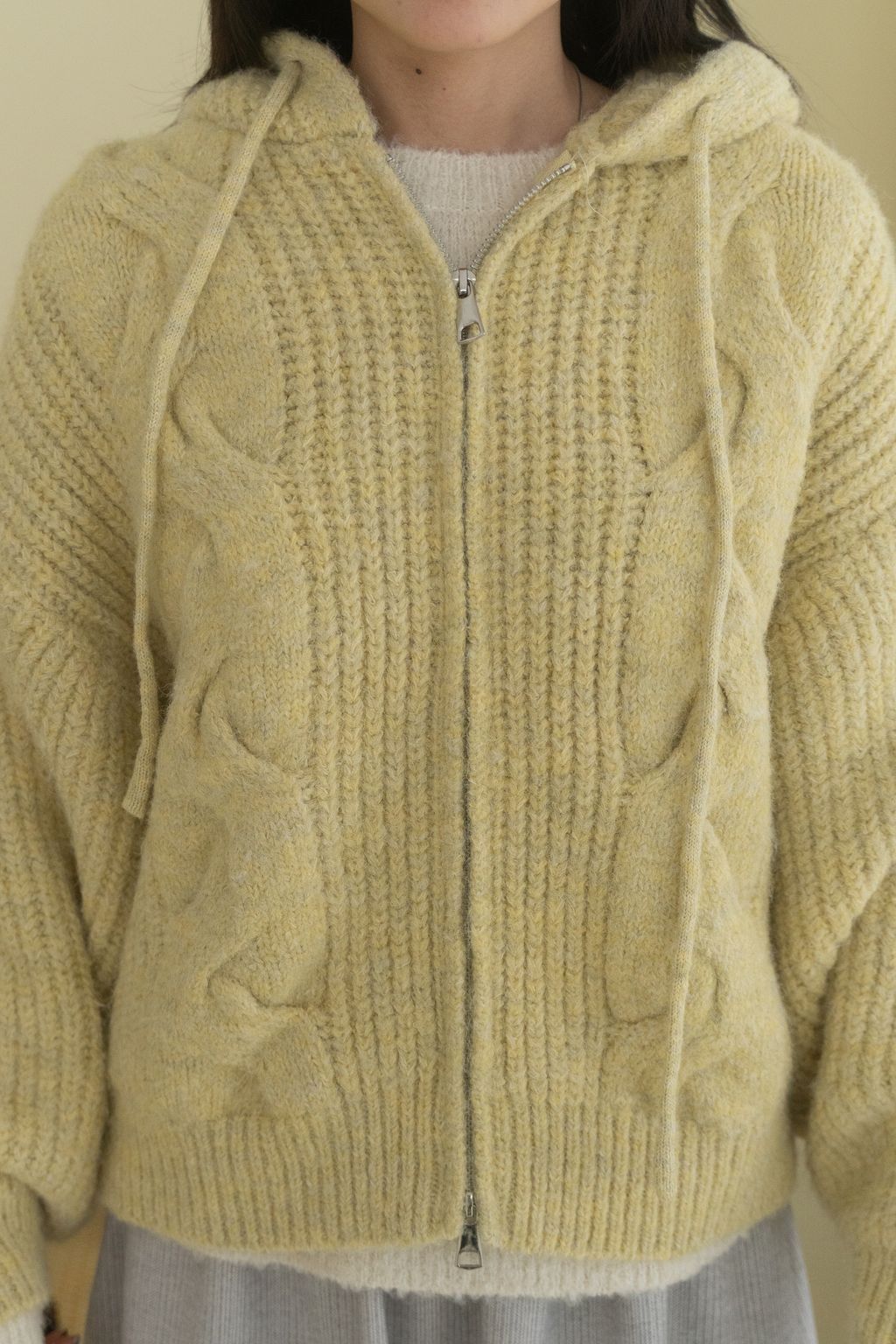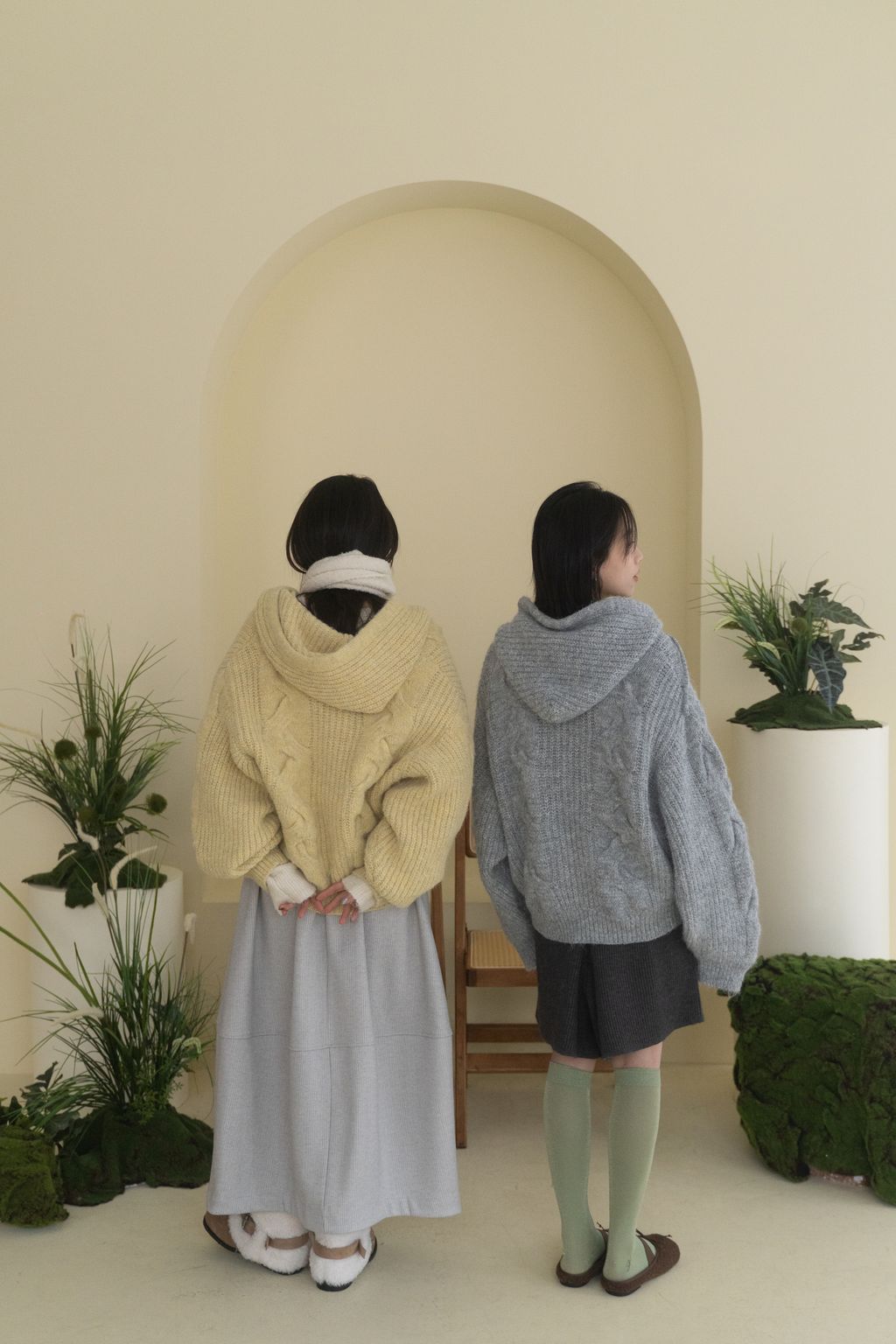 粗麻花澎袖雙拉鍊連帽外套 黃/灰