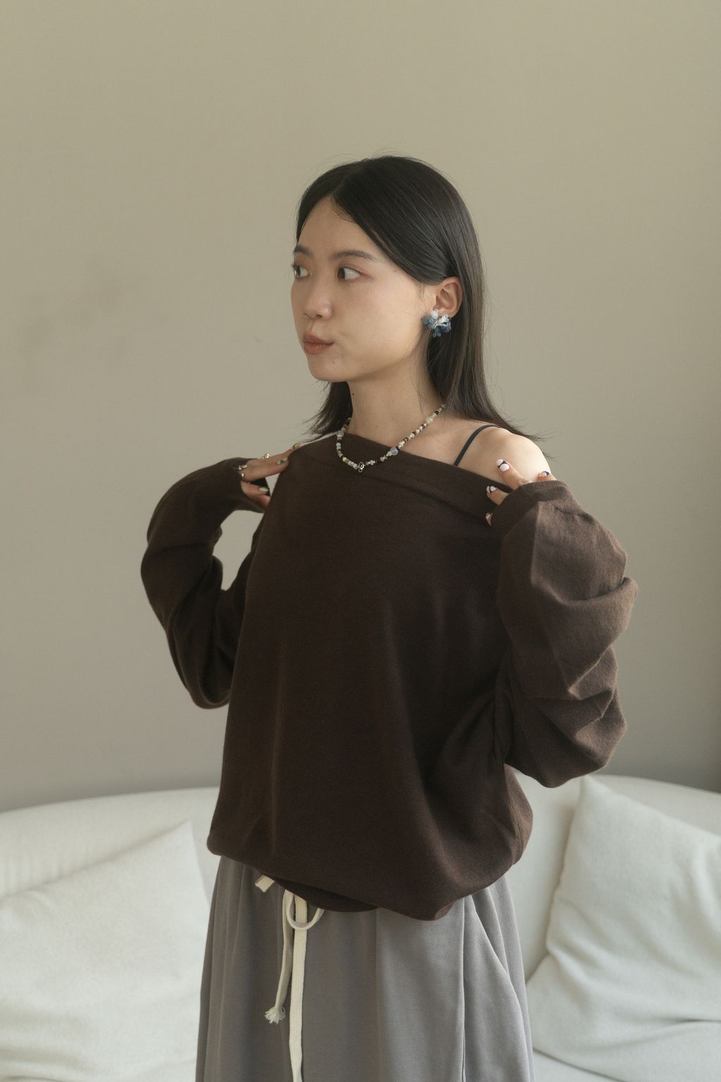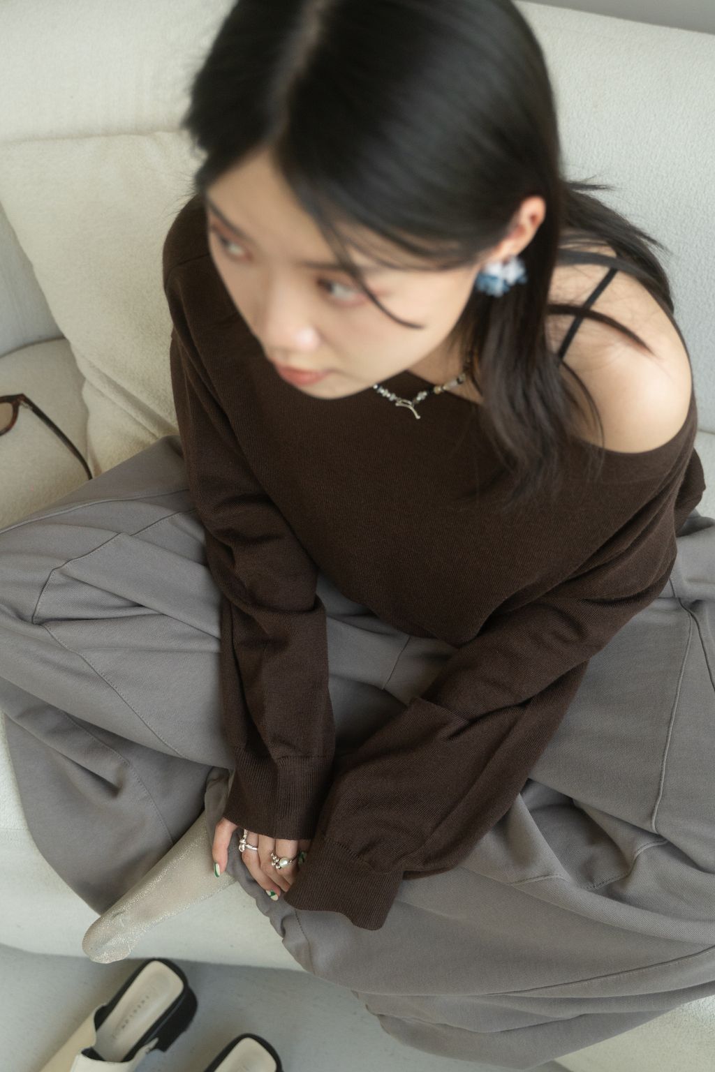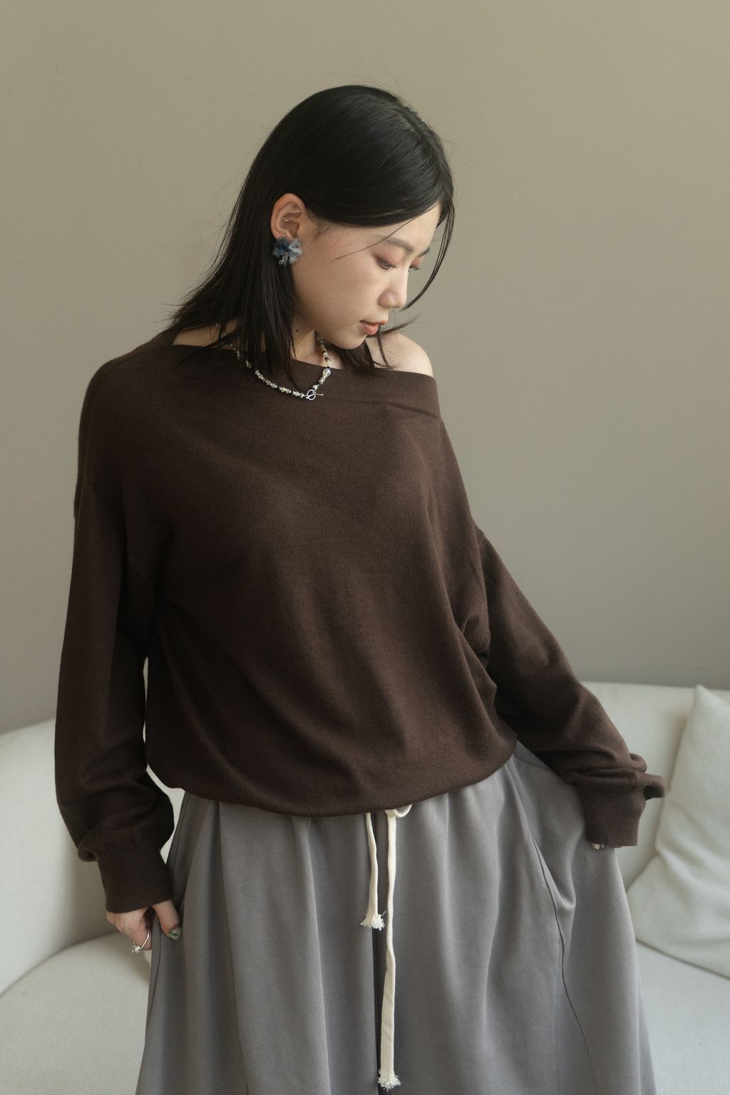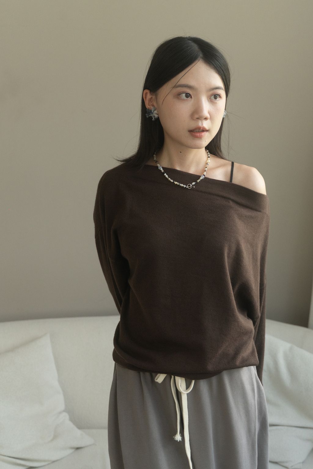 隨性斜肩寬鬆薄針織上衣 黑/咖