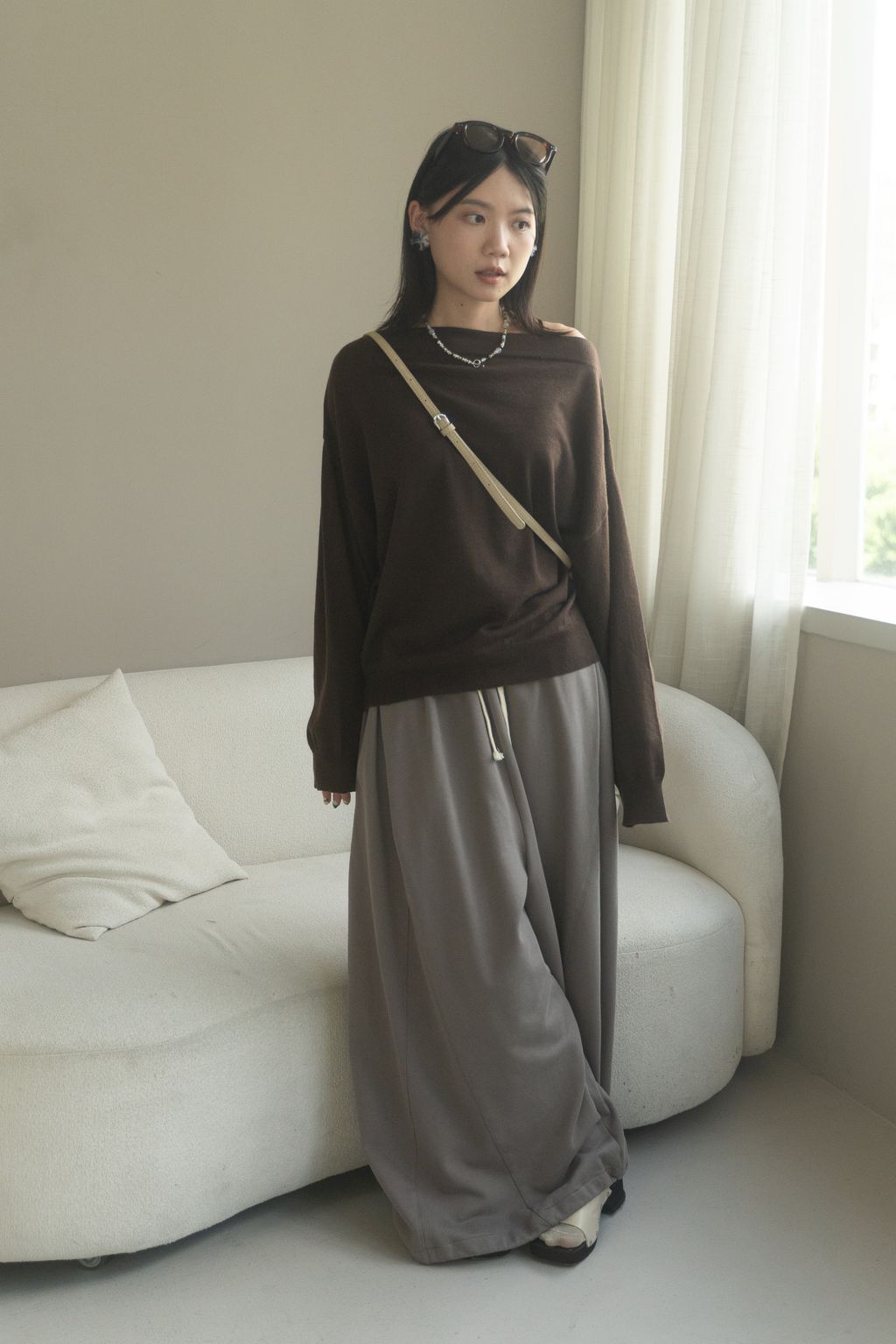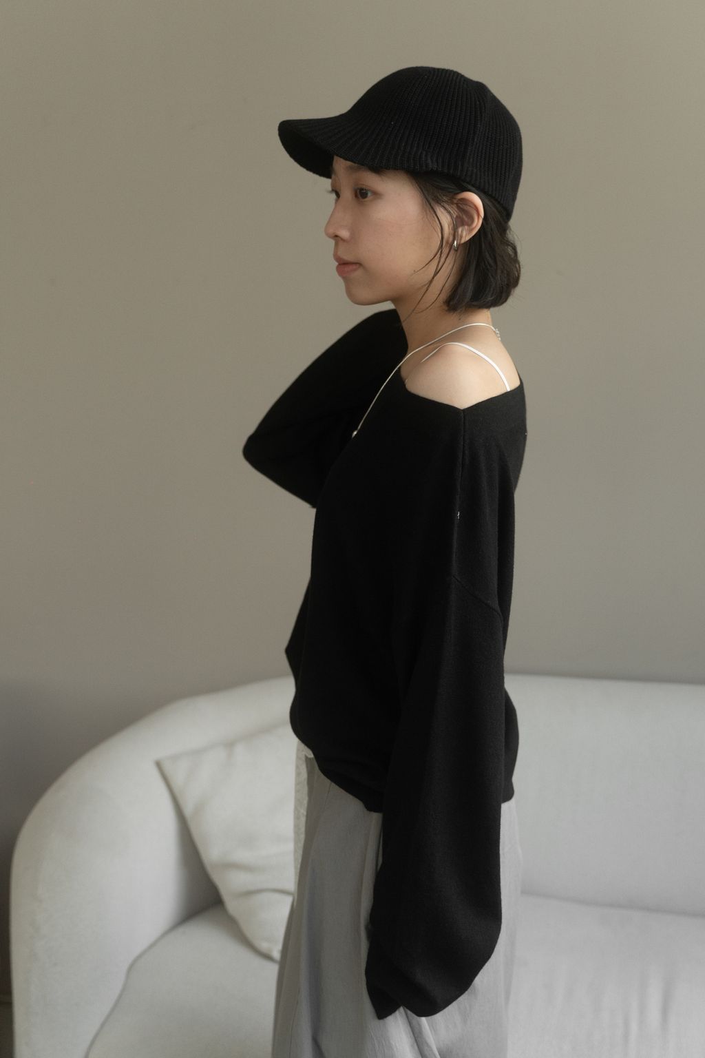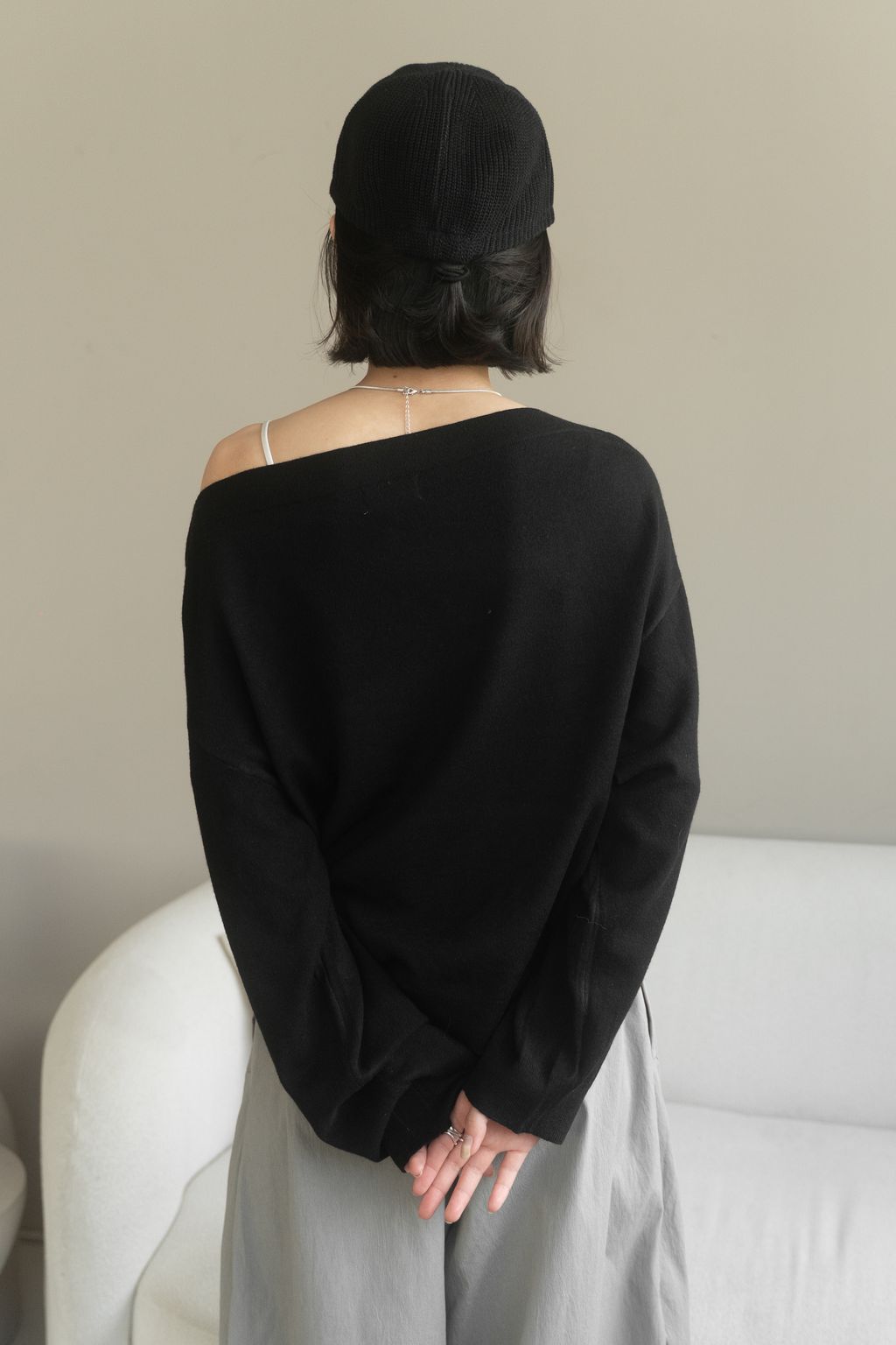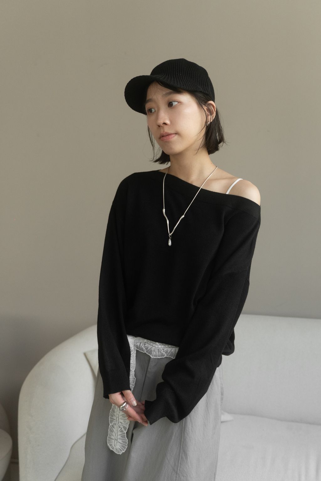 隨性斜肩寬鬆薄針織上衣 黑/咖