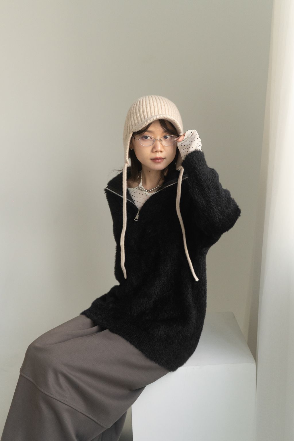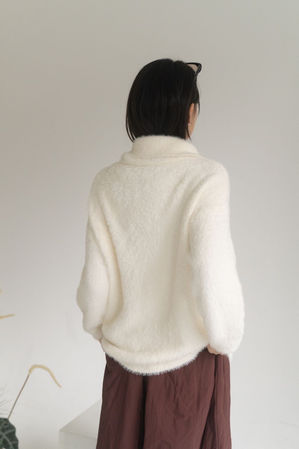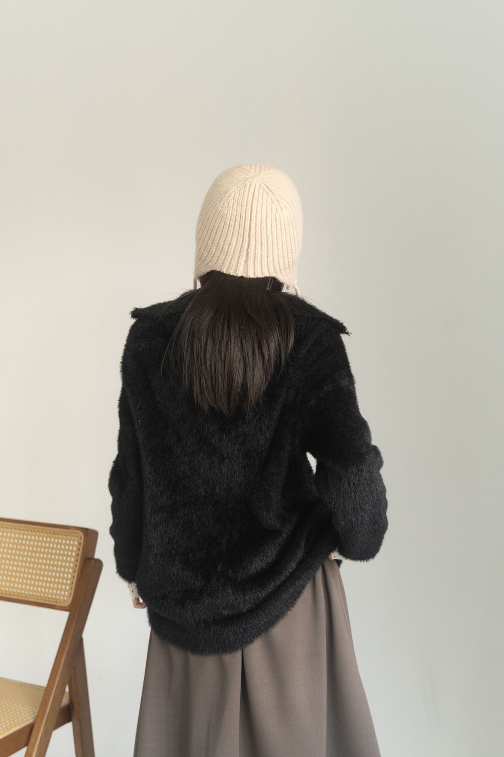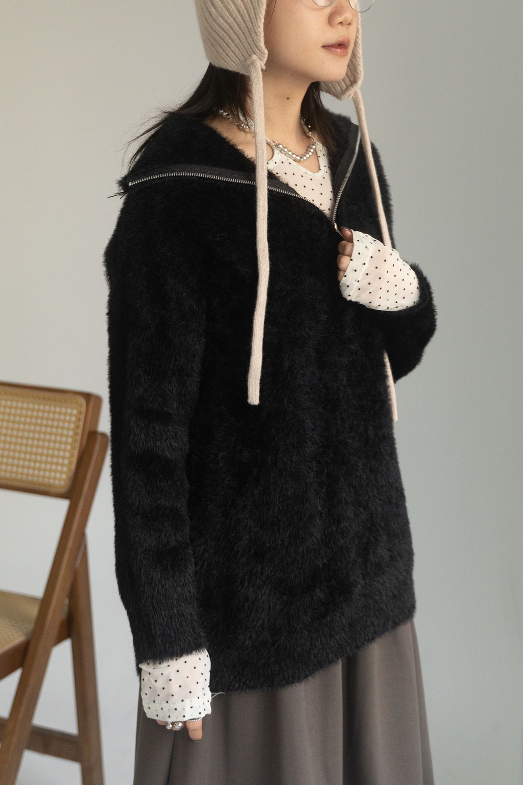 垂墜馬海毛半拉鏈上衣 黑/白