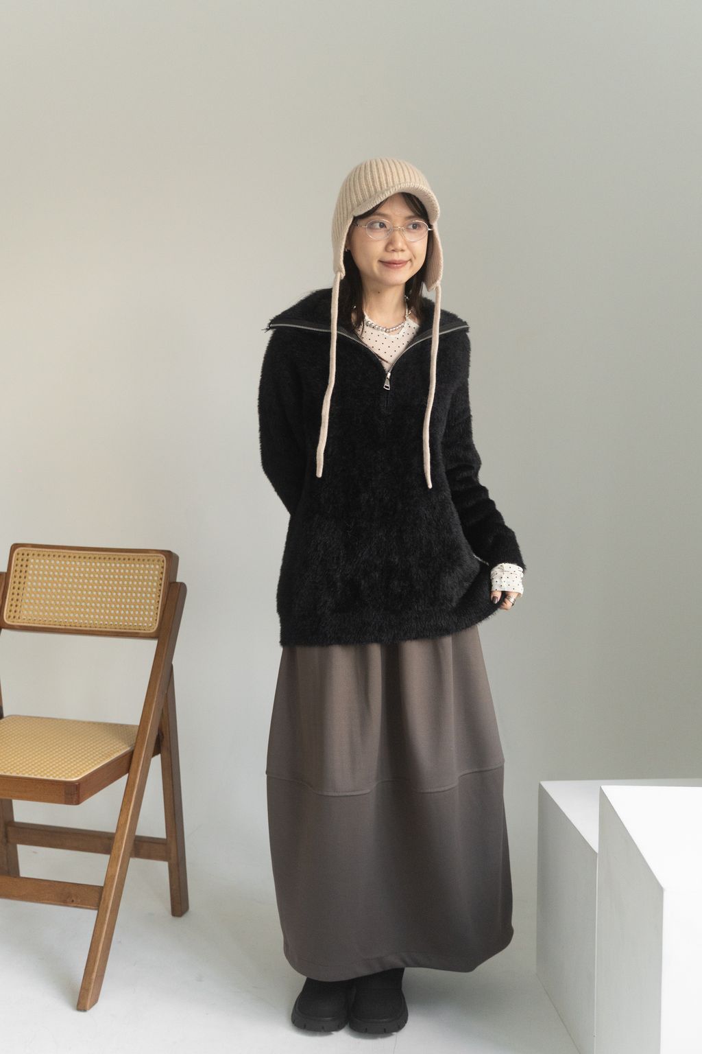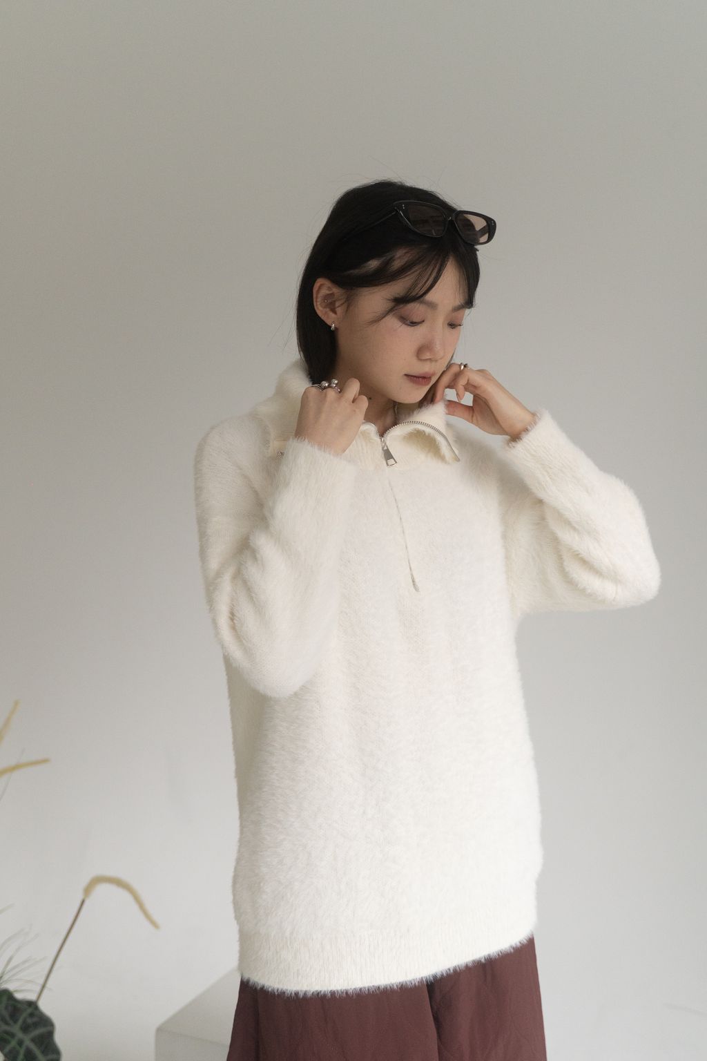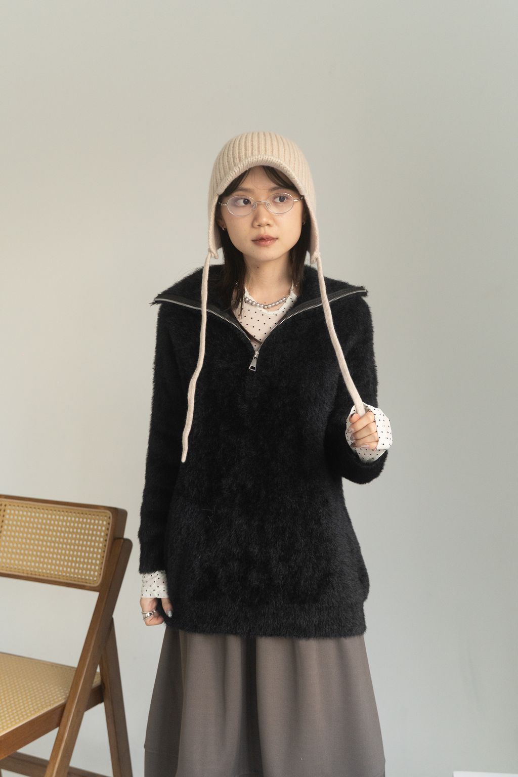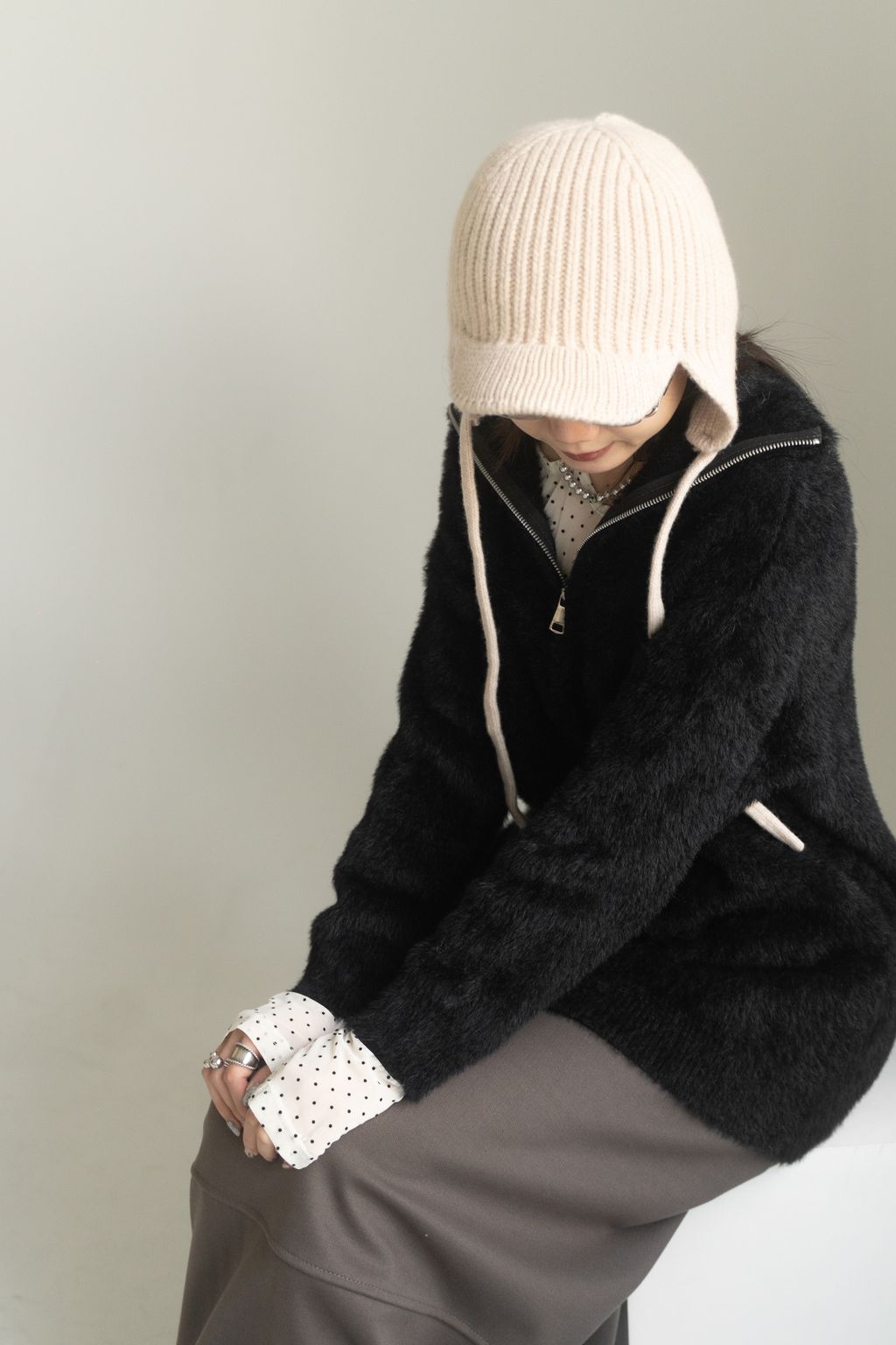 垂墜馬海毛半拉鏈上衣 黑/白