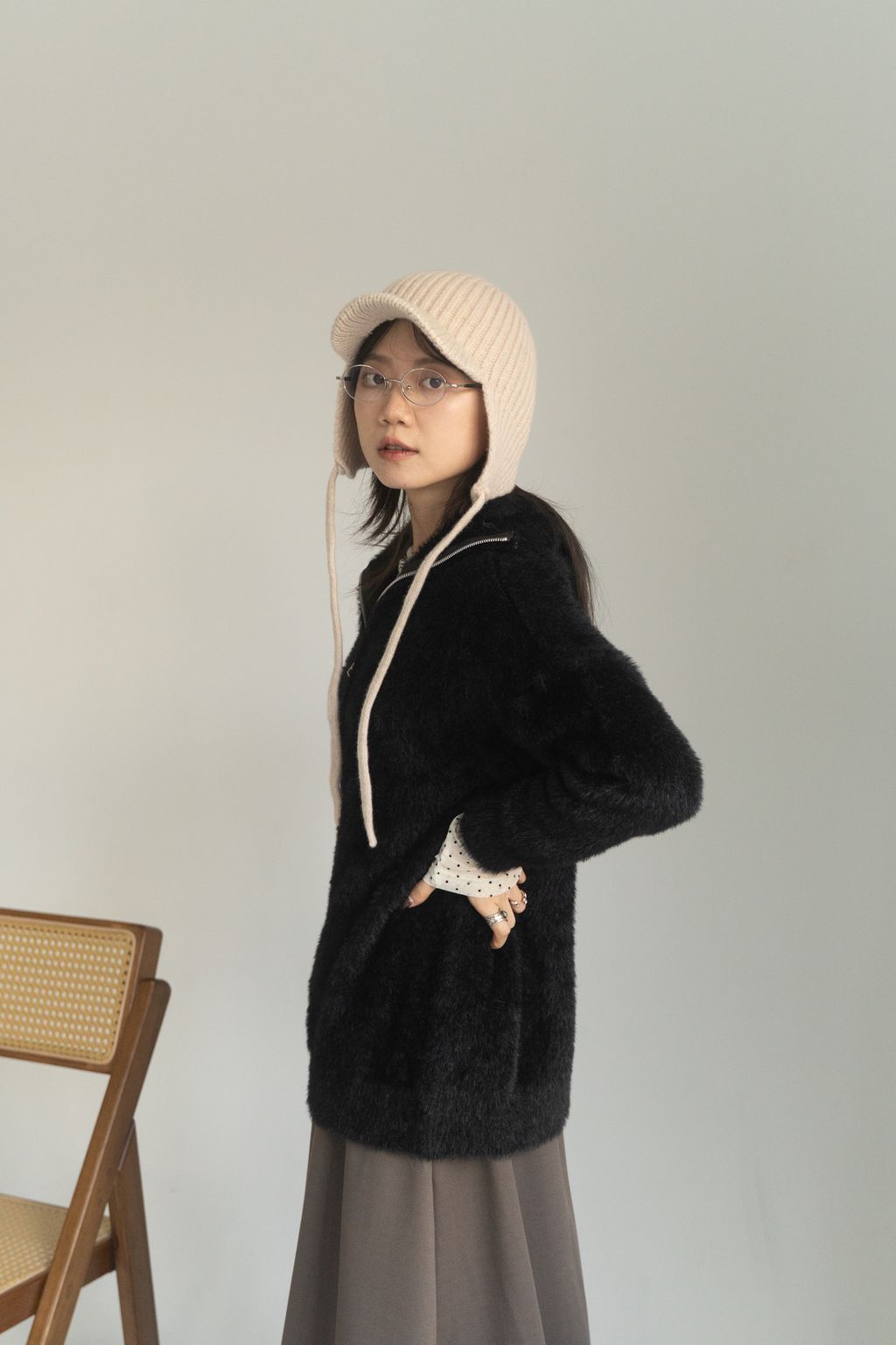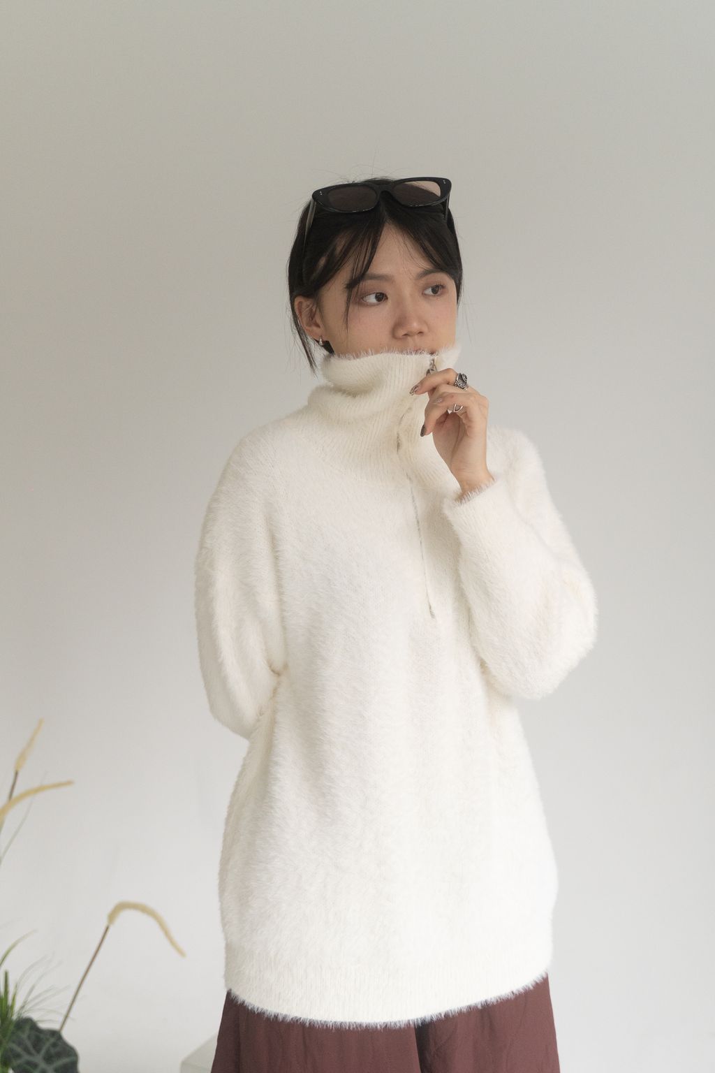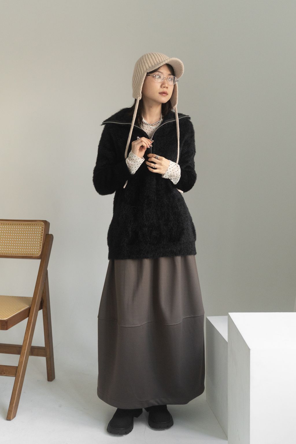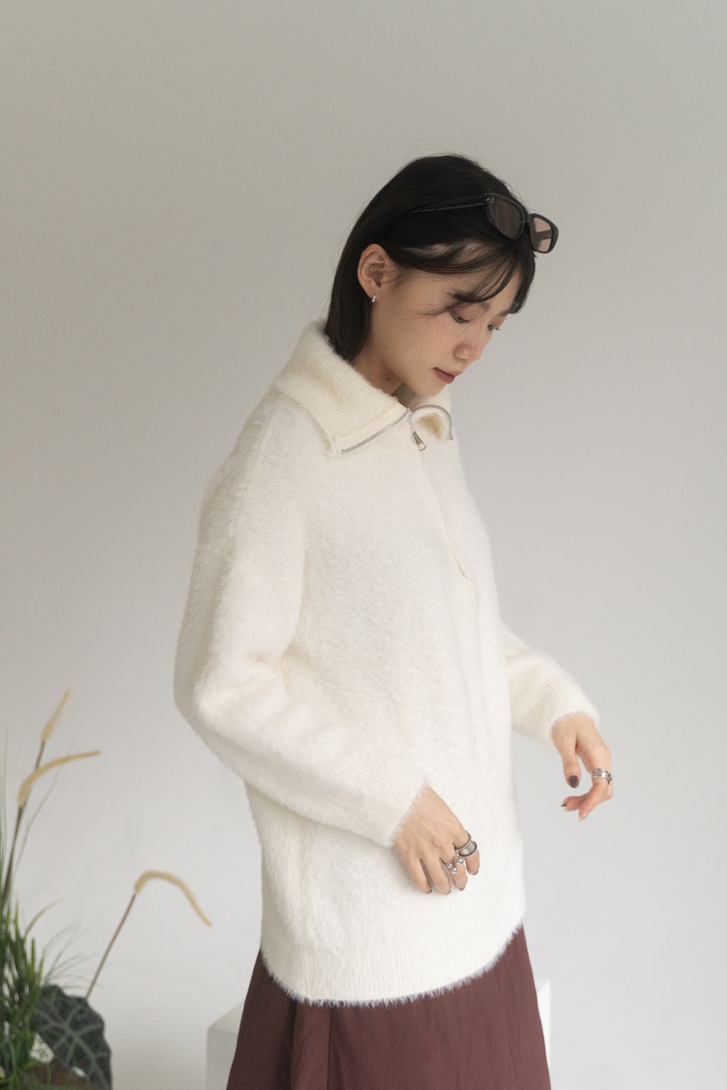 垂墜馬海毛半拉鏈上衣 黑/白