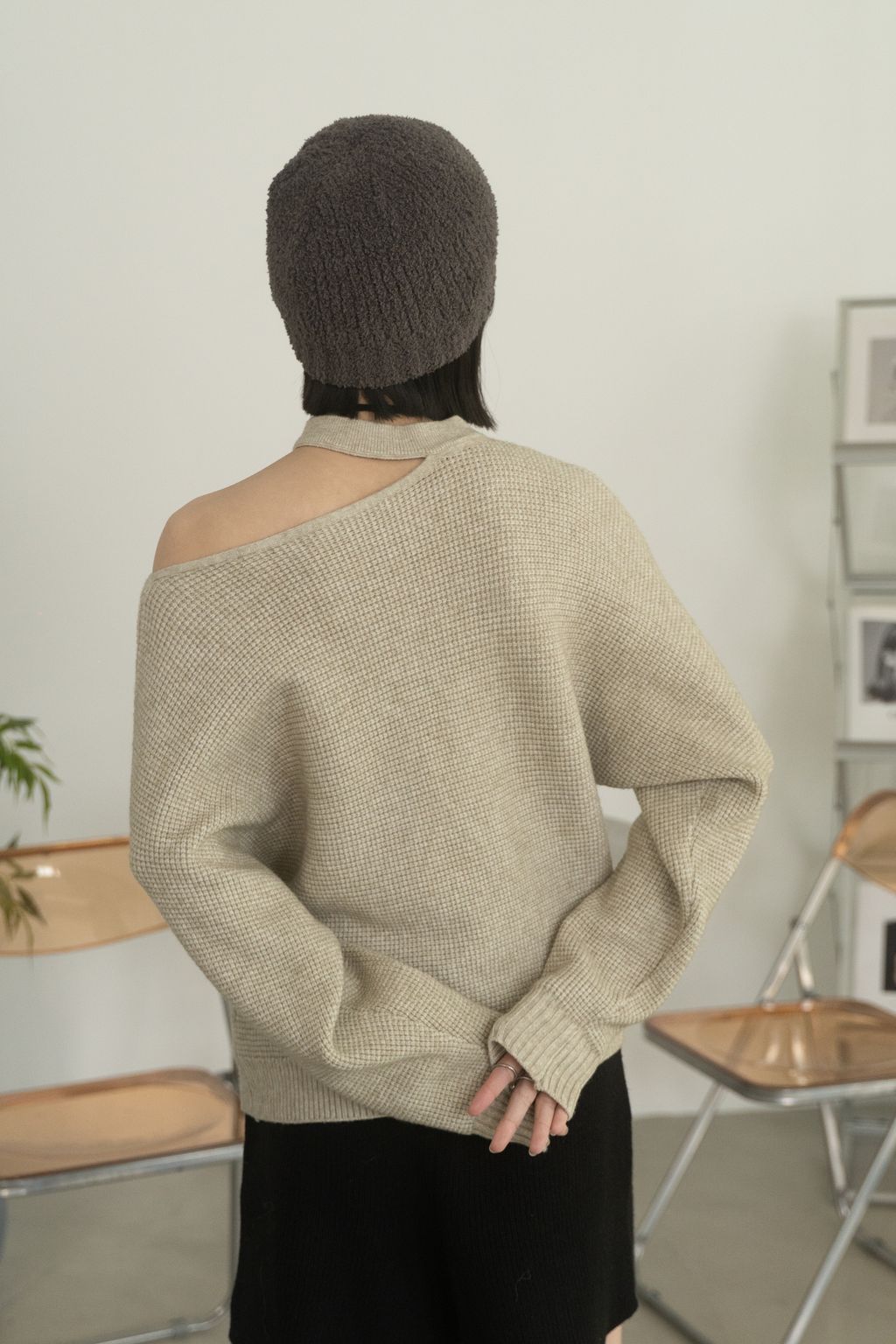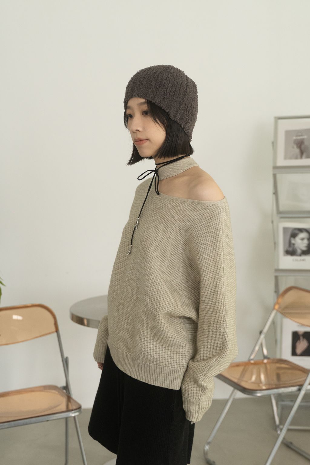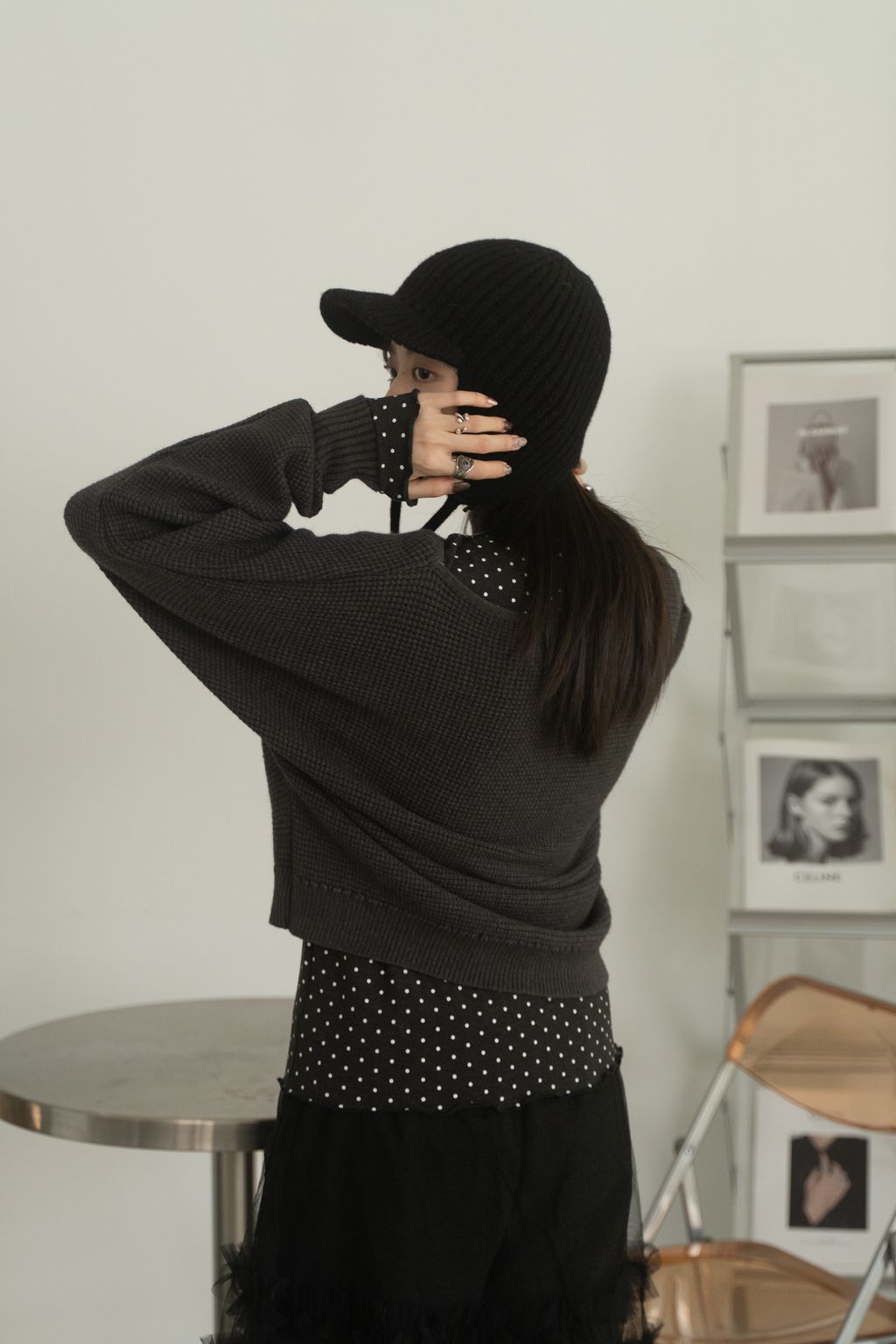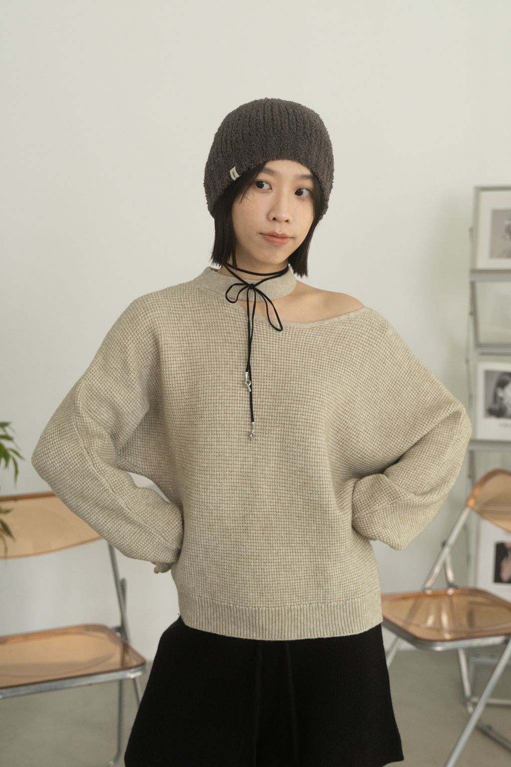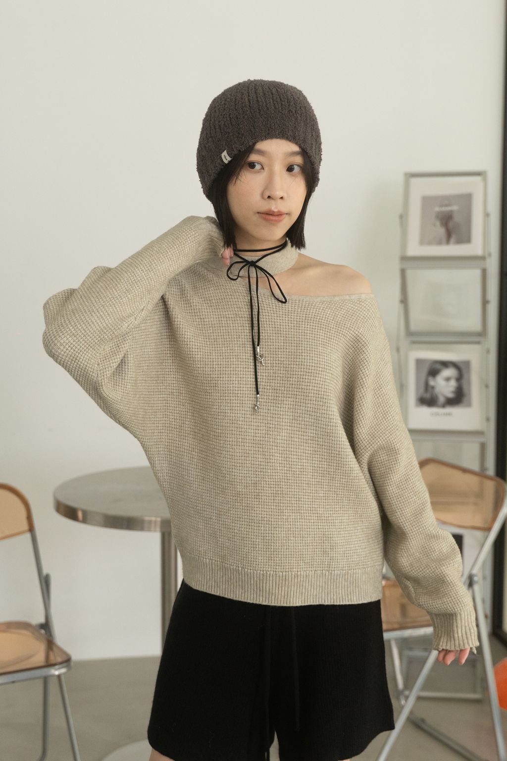 斜切領菠蘿紋針織上衣 深灰/燕麥