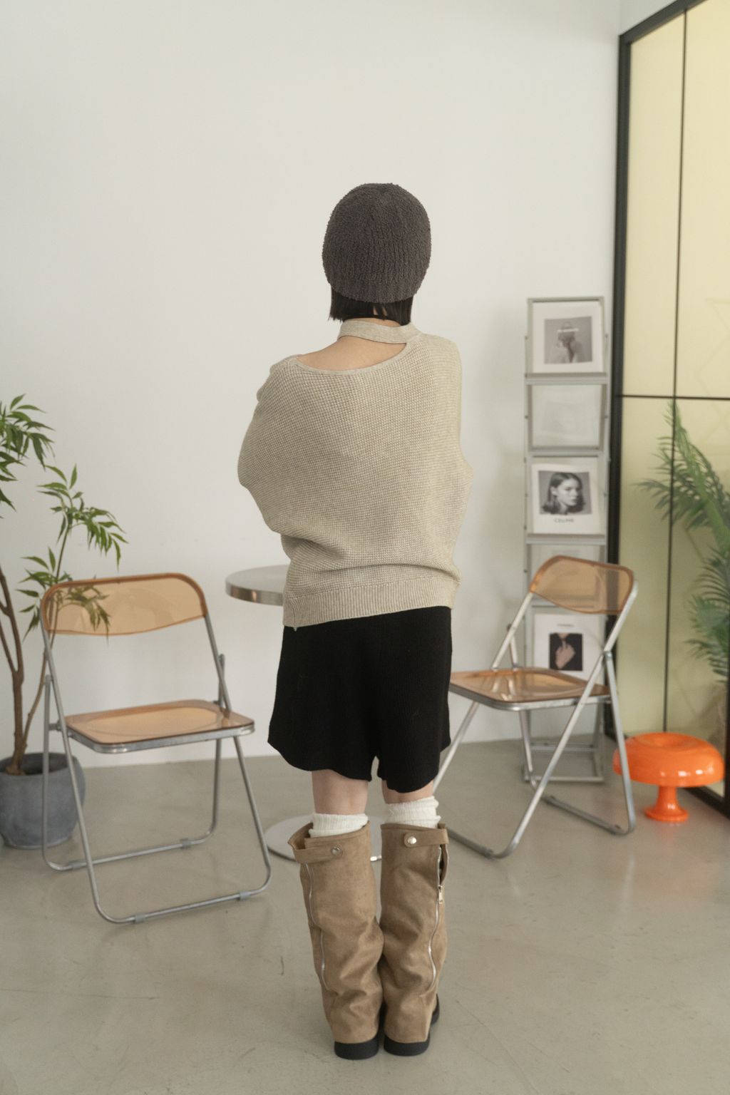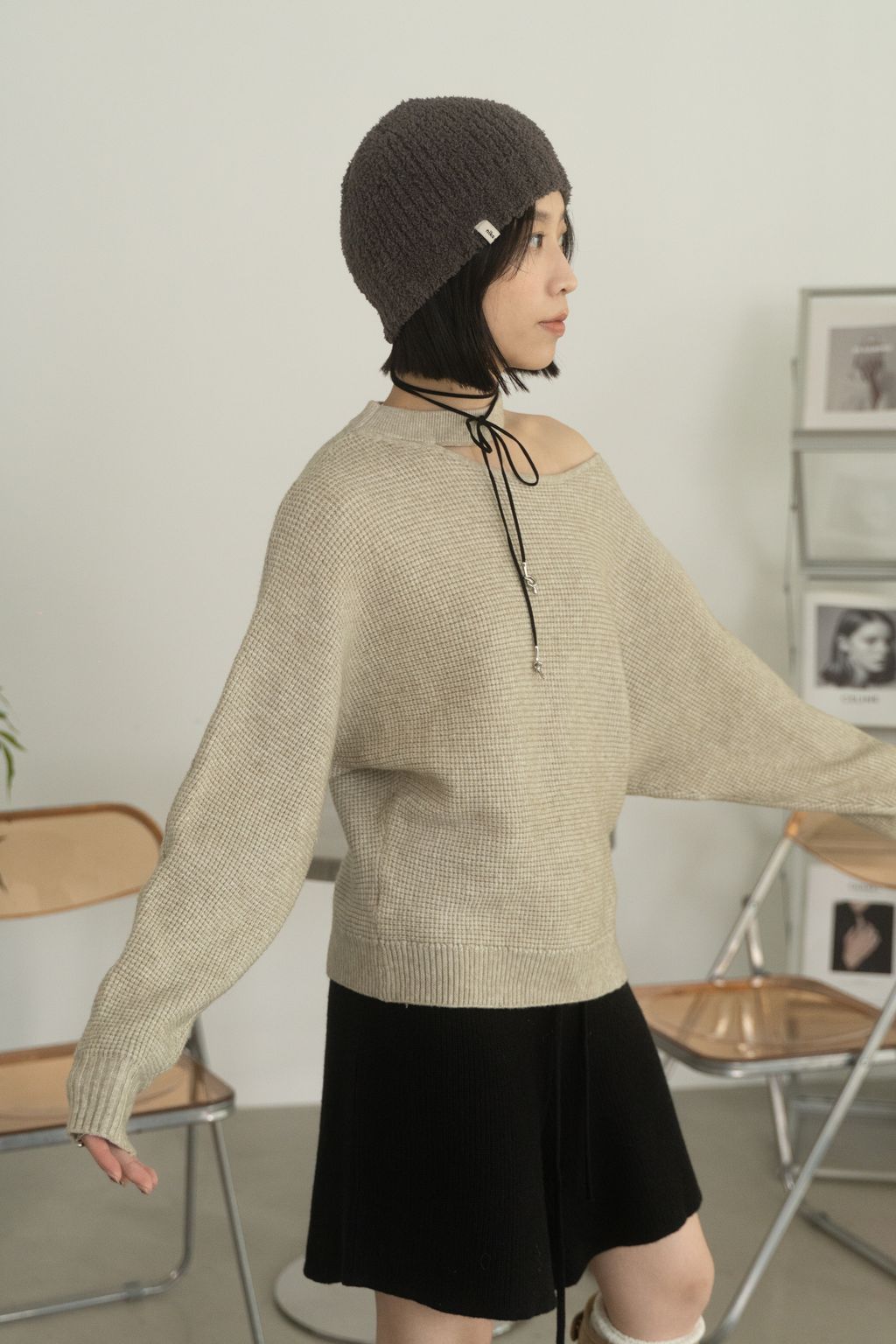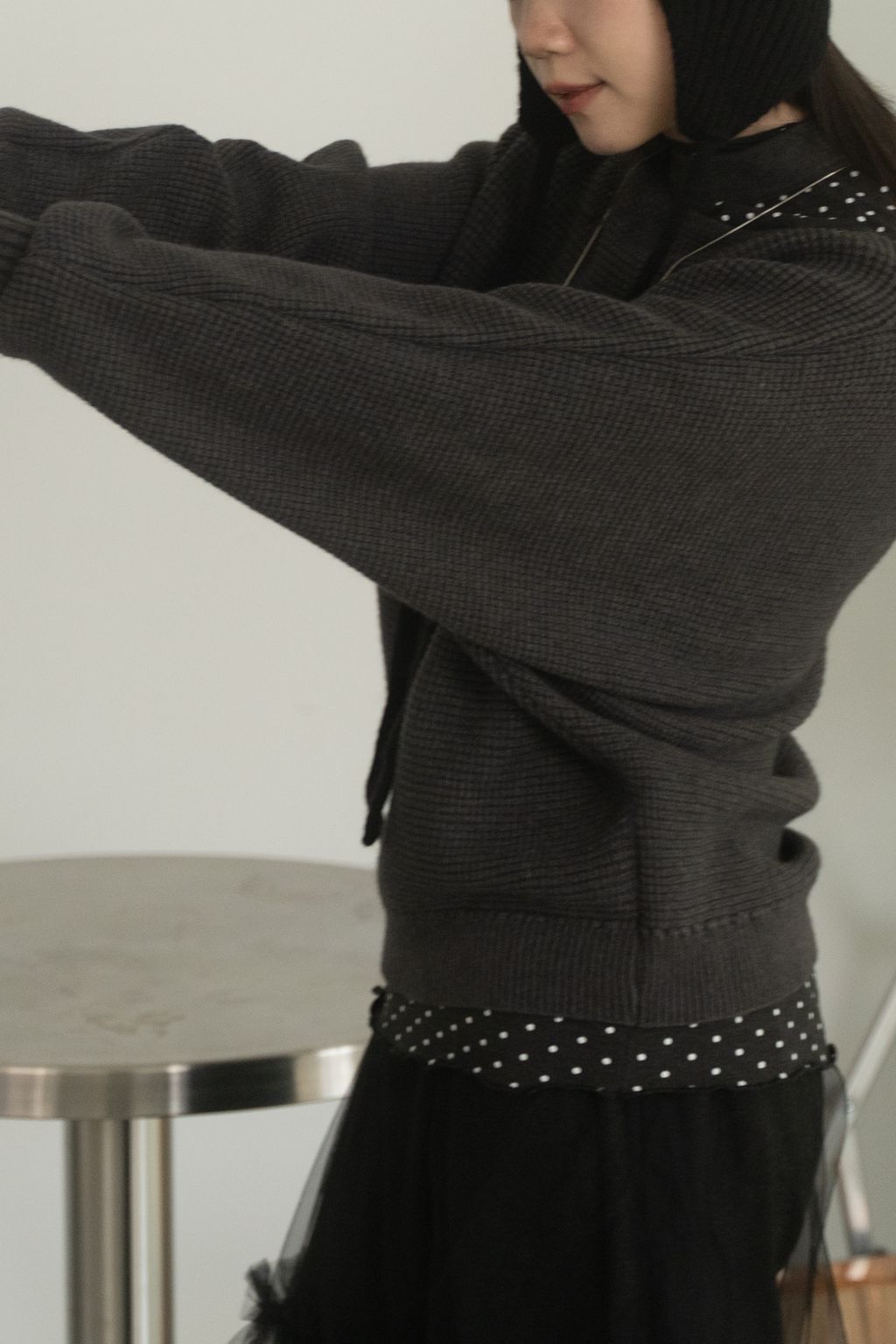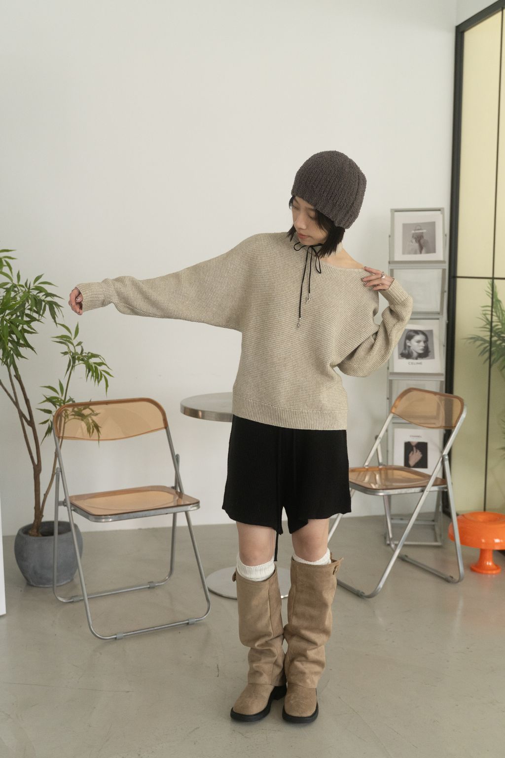 斜切領菠蘿紋針織上衣 深灰/燕麥