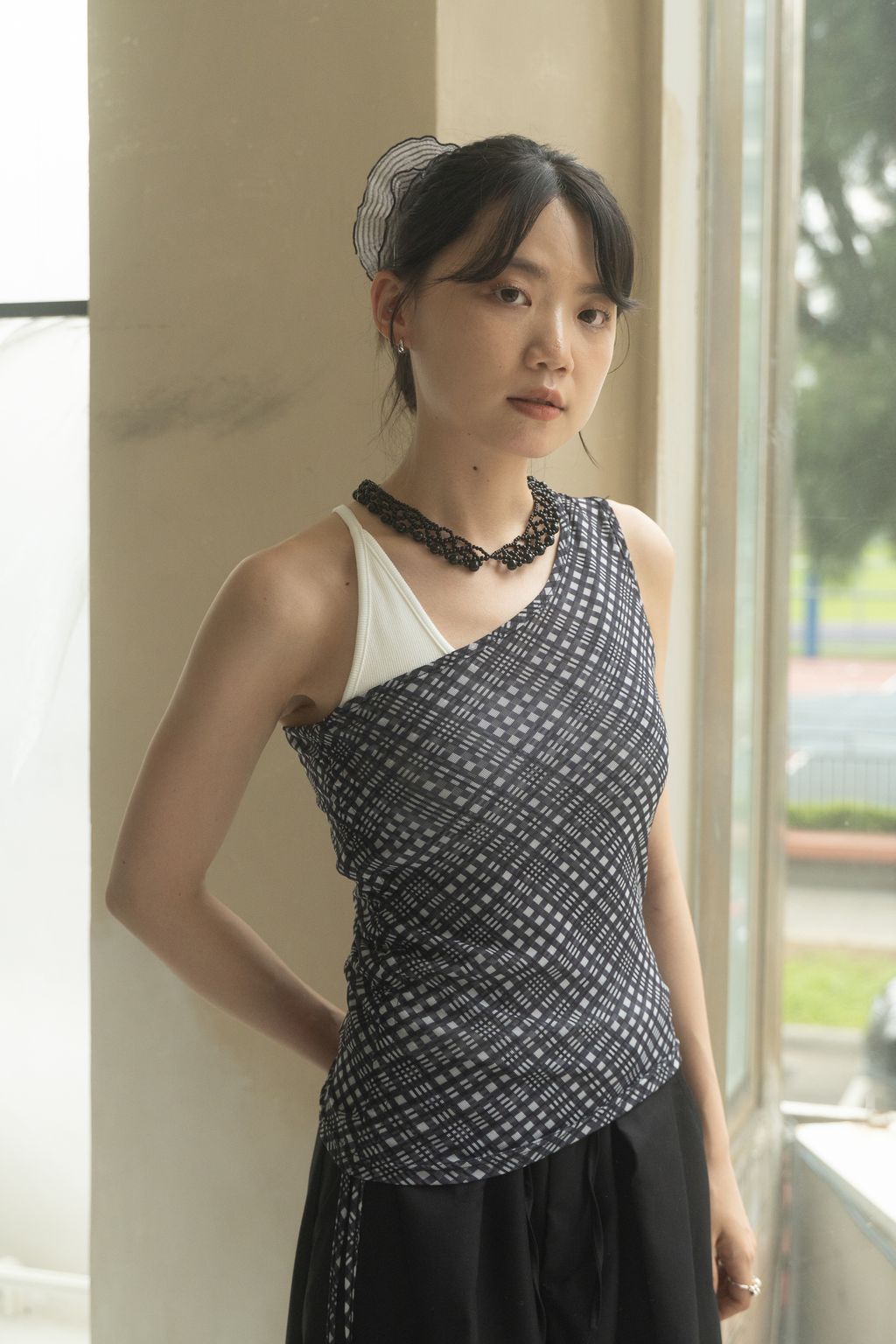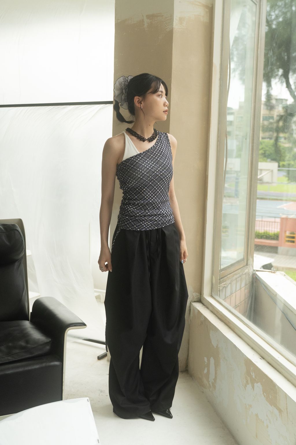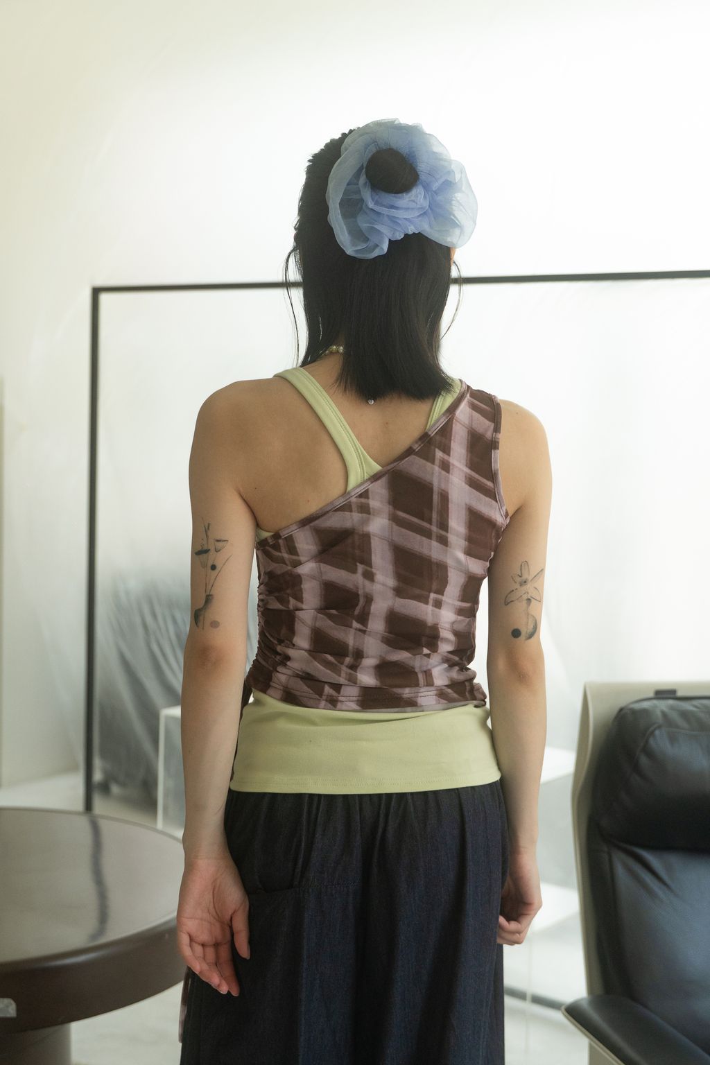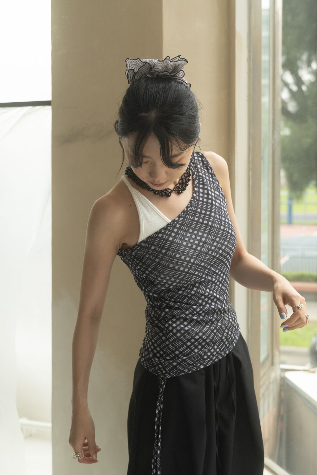 單肩網紗抽繩背心 黑灰小格/粉紅巧克力