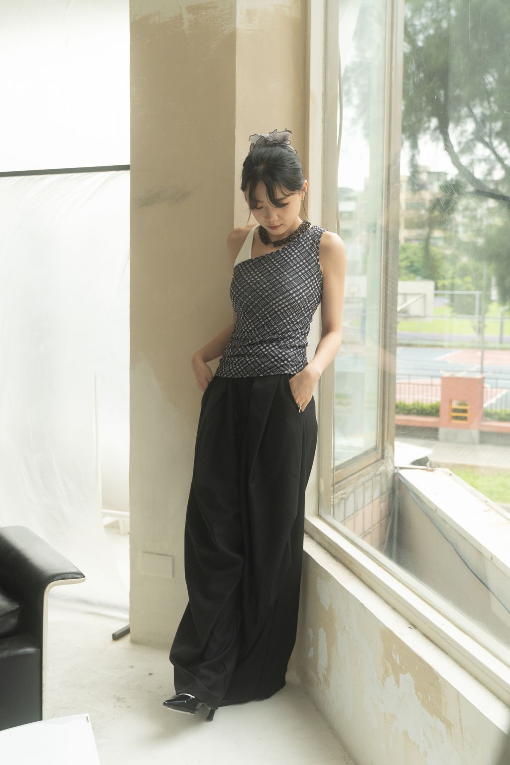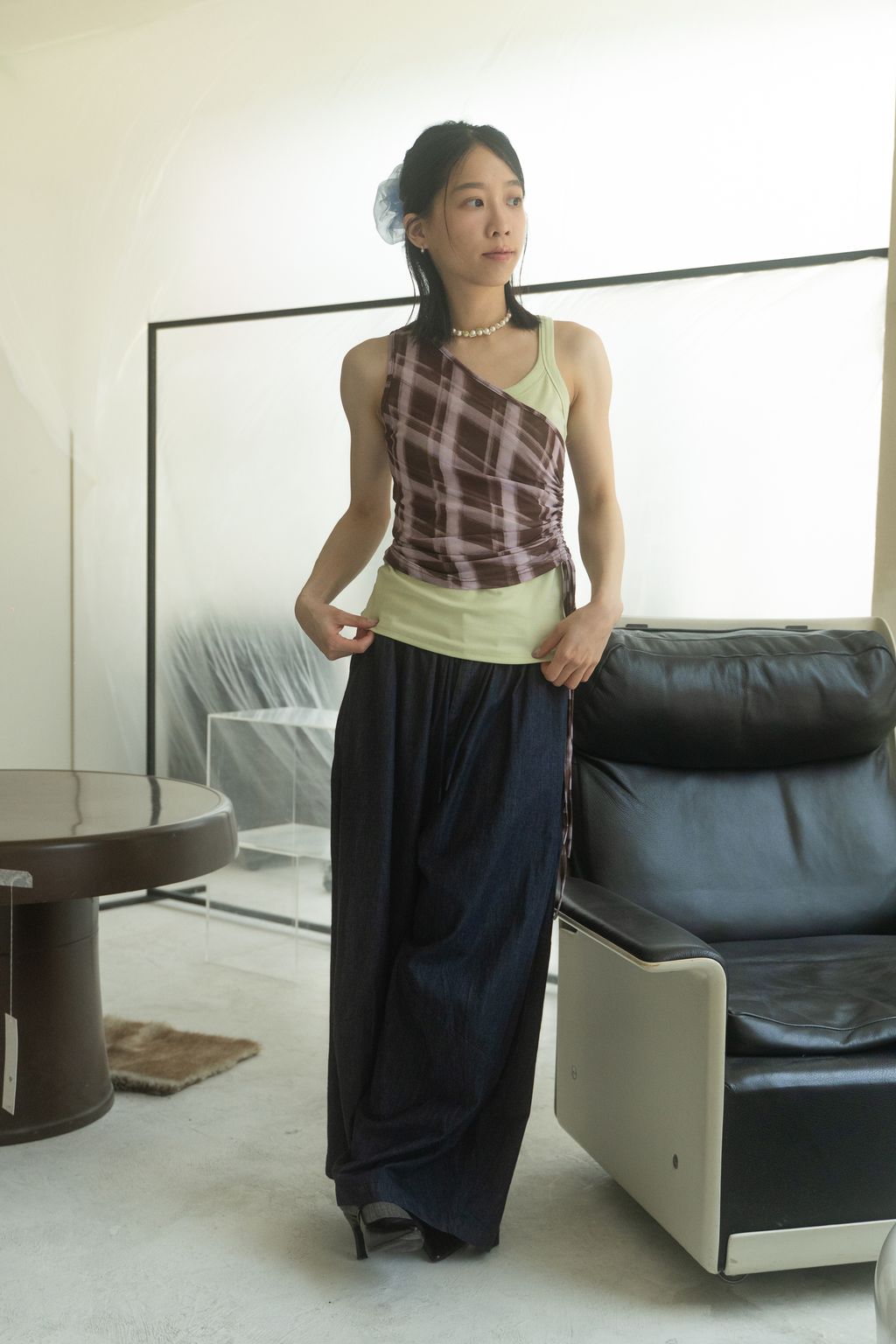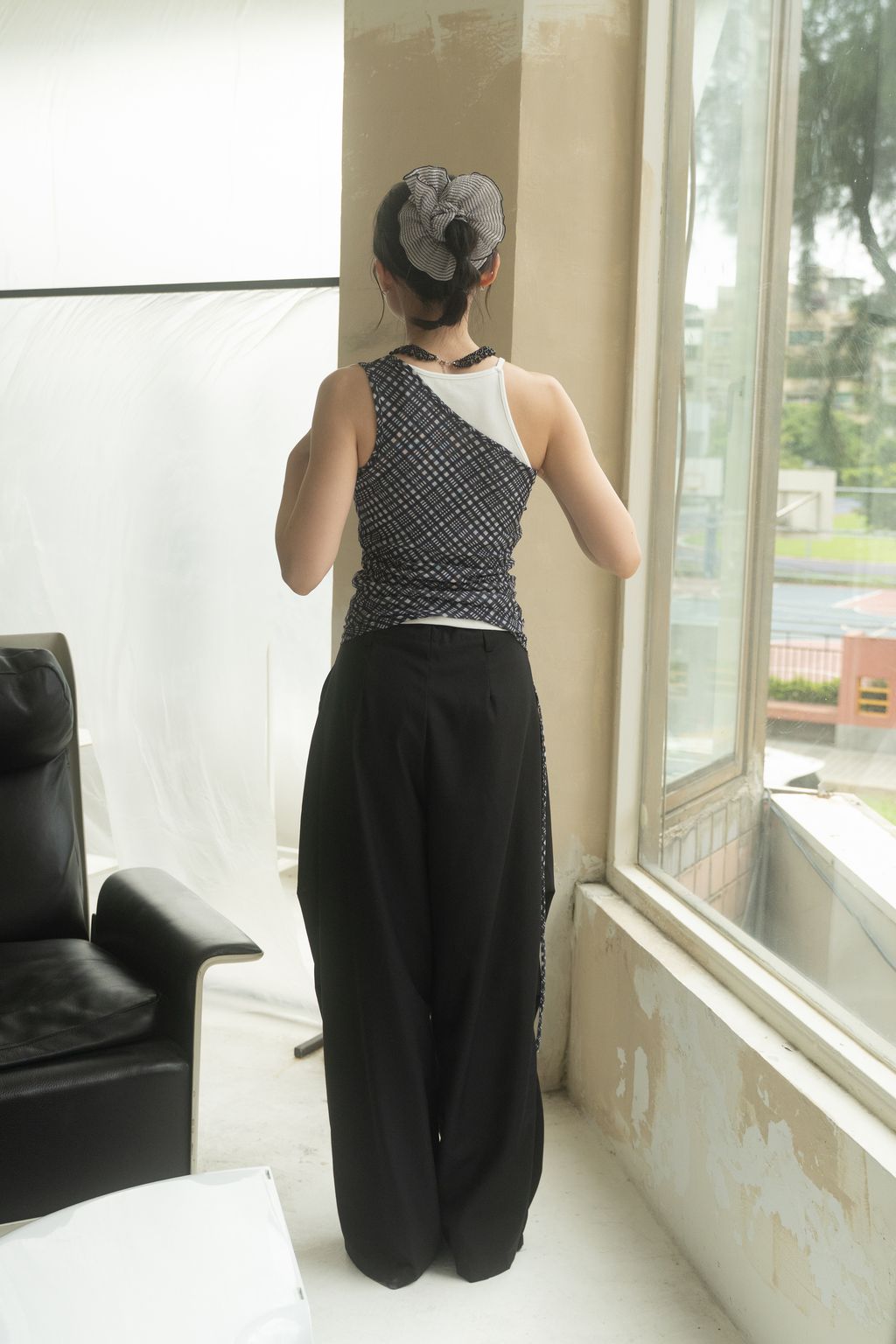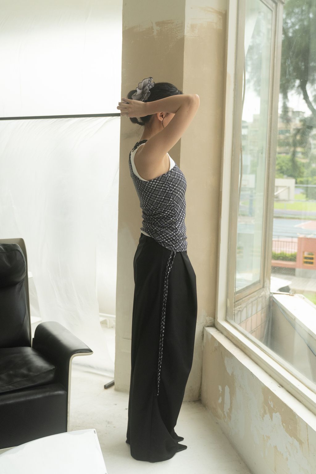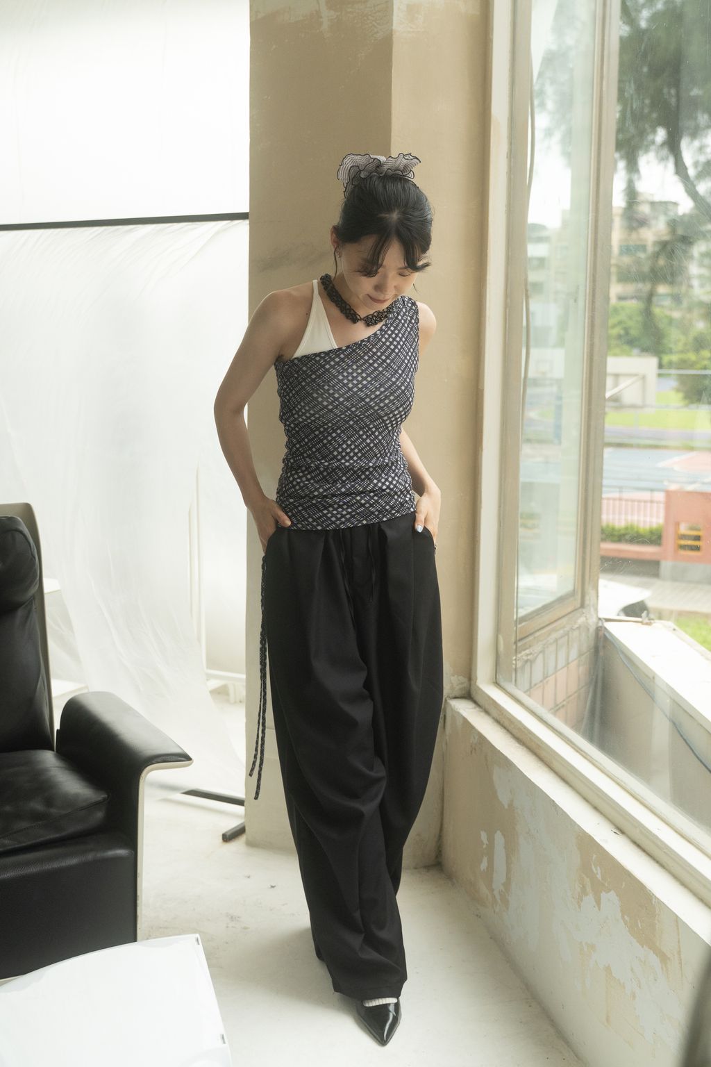 單肩網紗抽繩背心 黑灰小格/粉紅巧克力