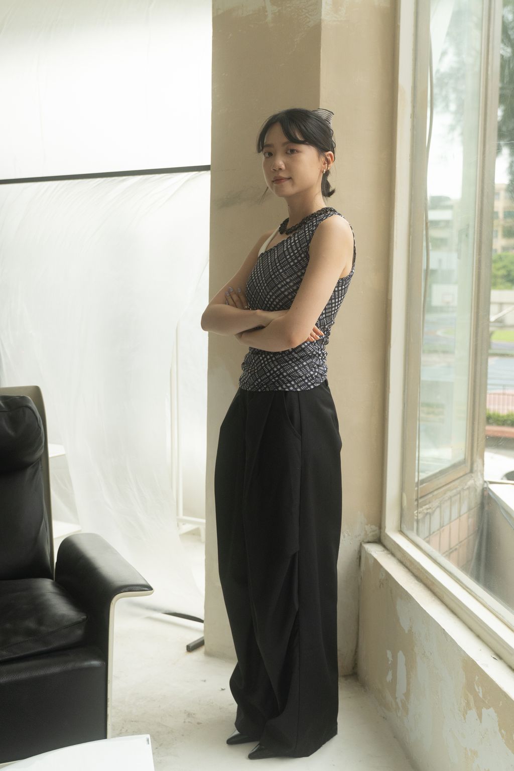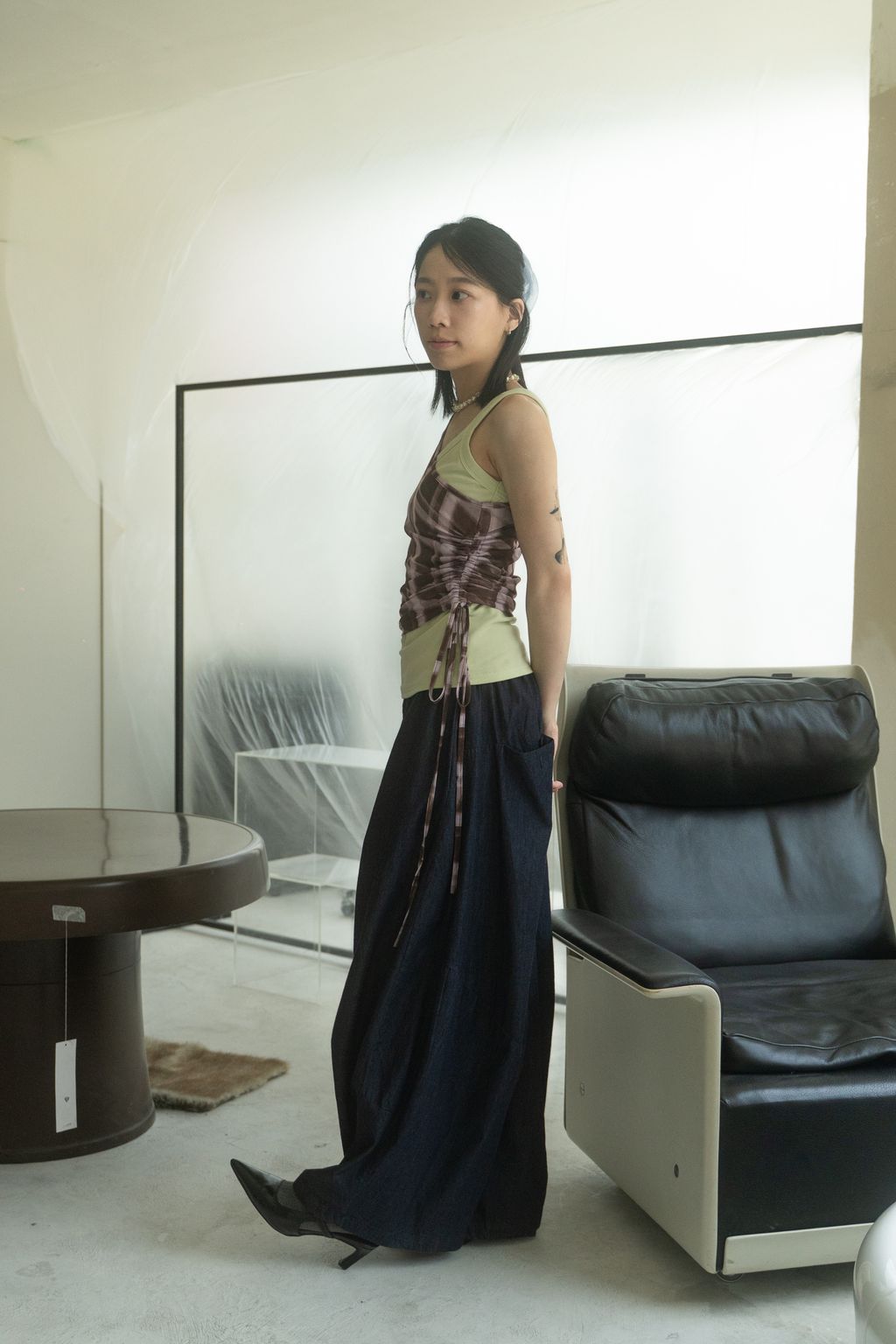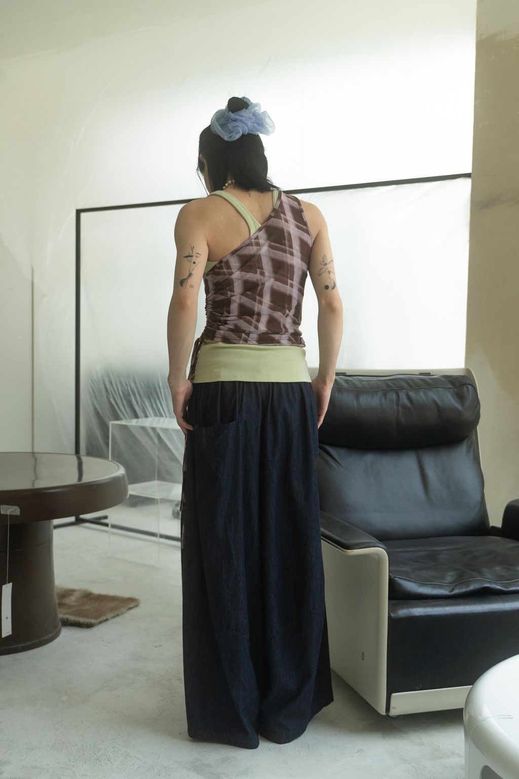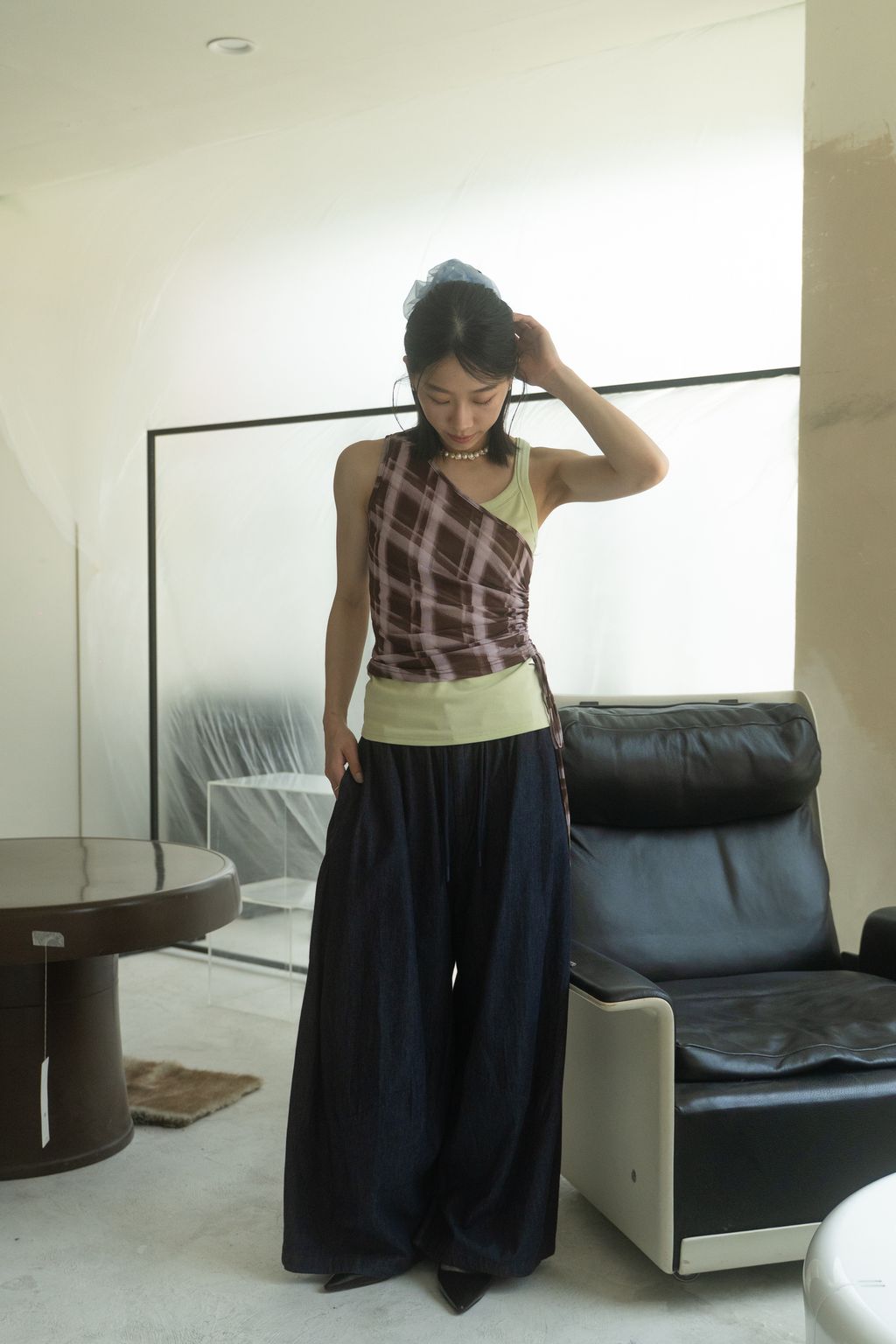 單肩網紗抽繩背心 黑灰小格/粉紅巧克力