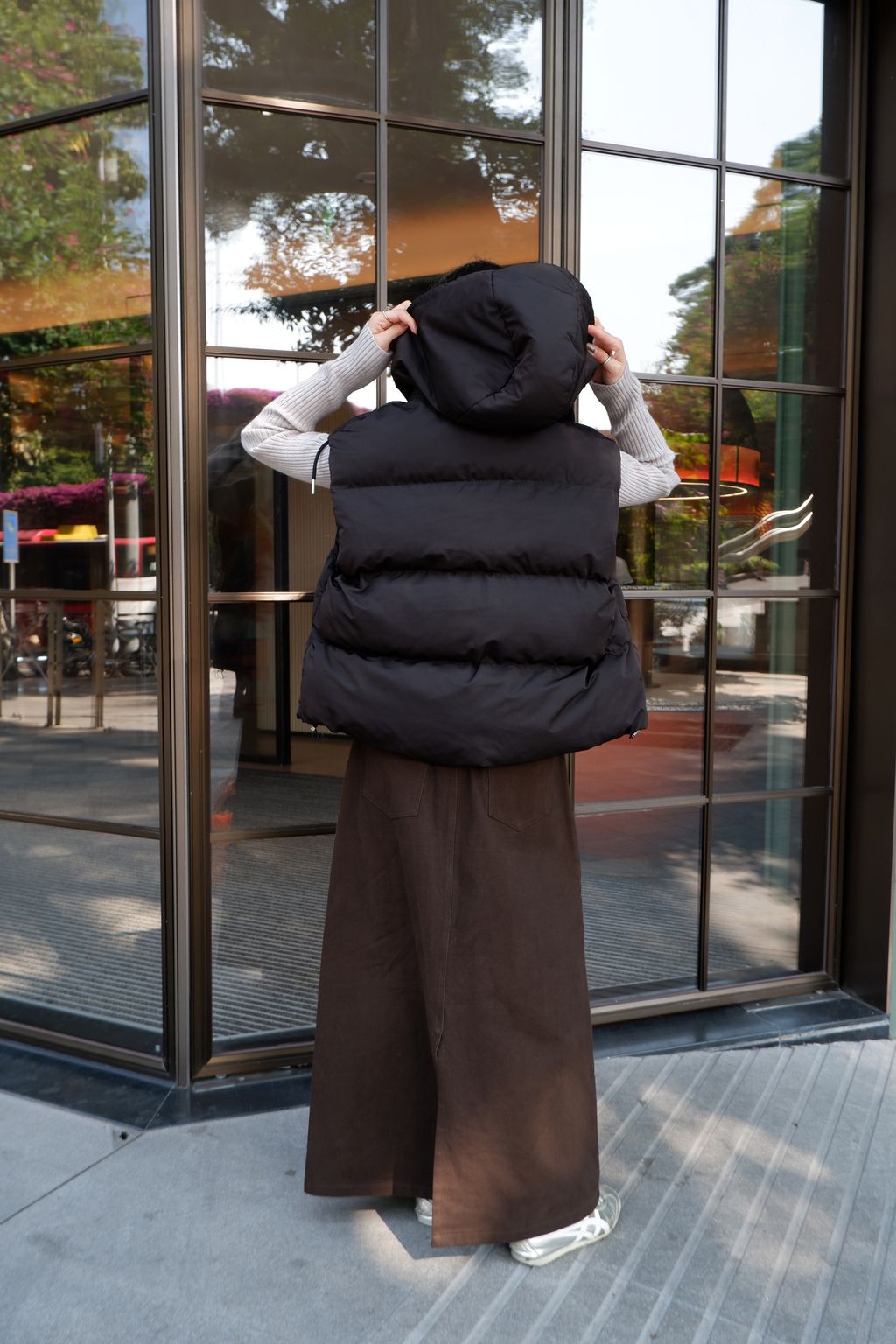 立領連帽澎澎鋪棉背心 黑/卡/深咖綠